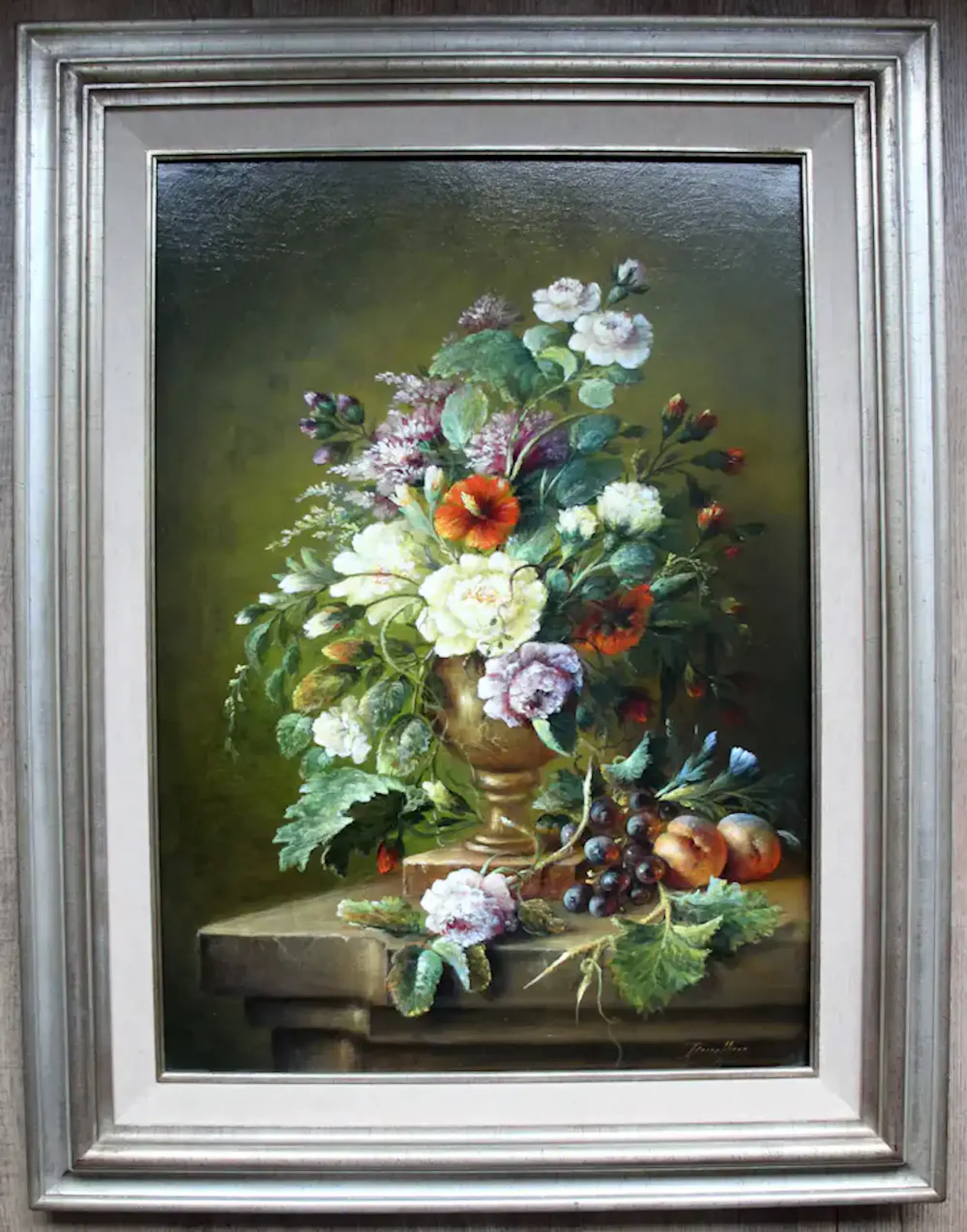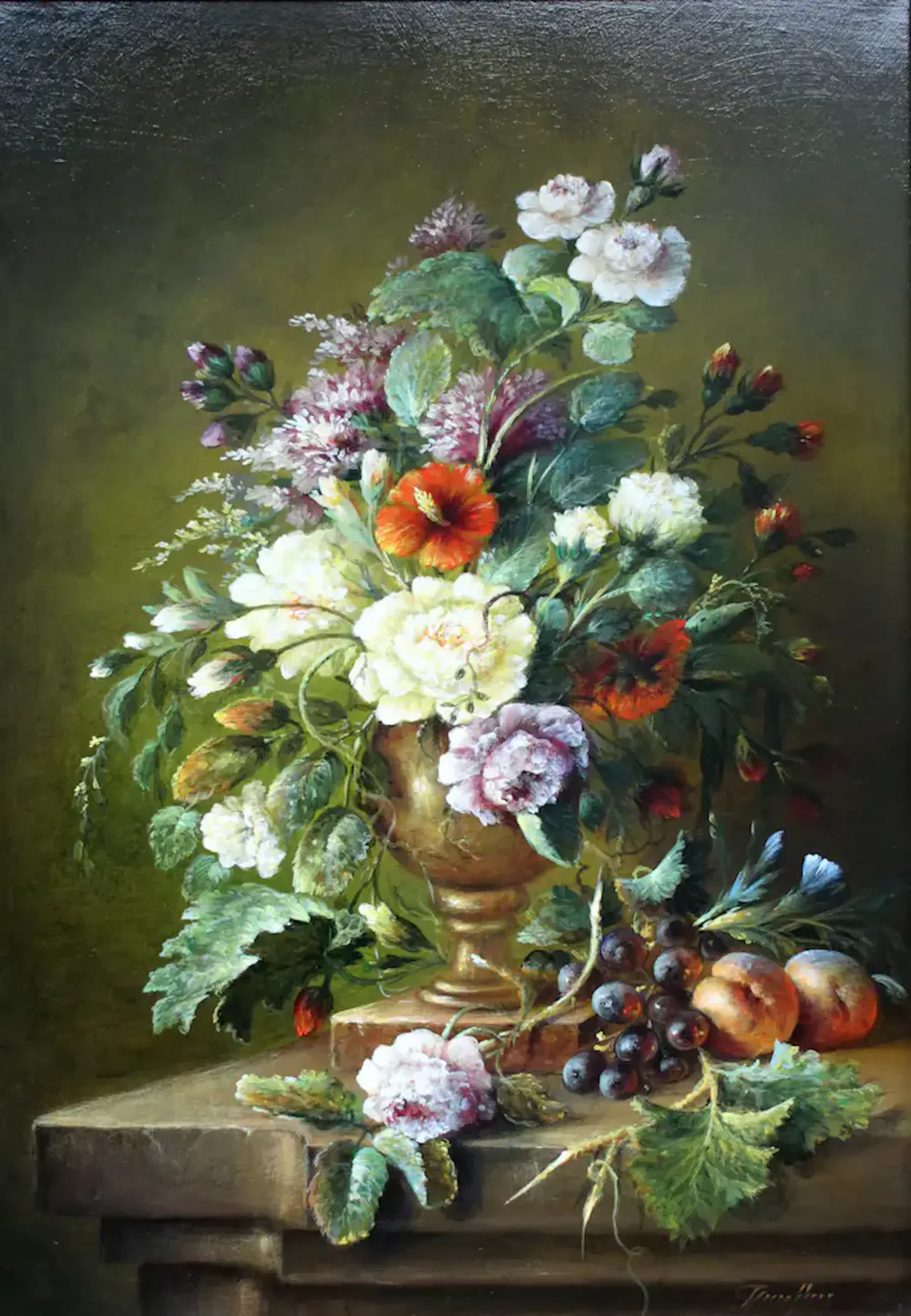 Olieverf op doek van Thomas Heesakkers. Stilleven met fruit & bloemen in vaas. Het werk is mooi ingelijst. Afmetingen Incl lijst: H82 x b71cm. Afmetingen voorstelling: H60 x b50cm.