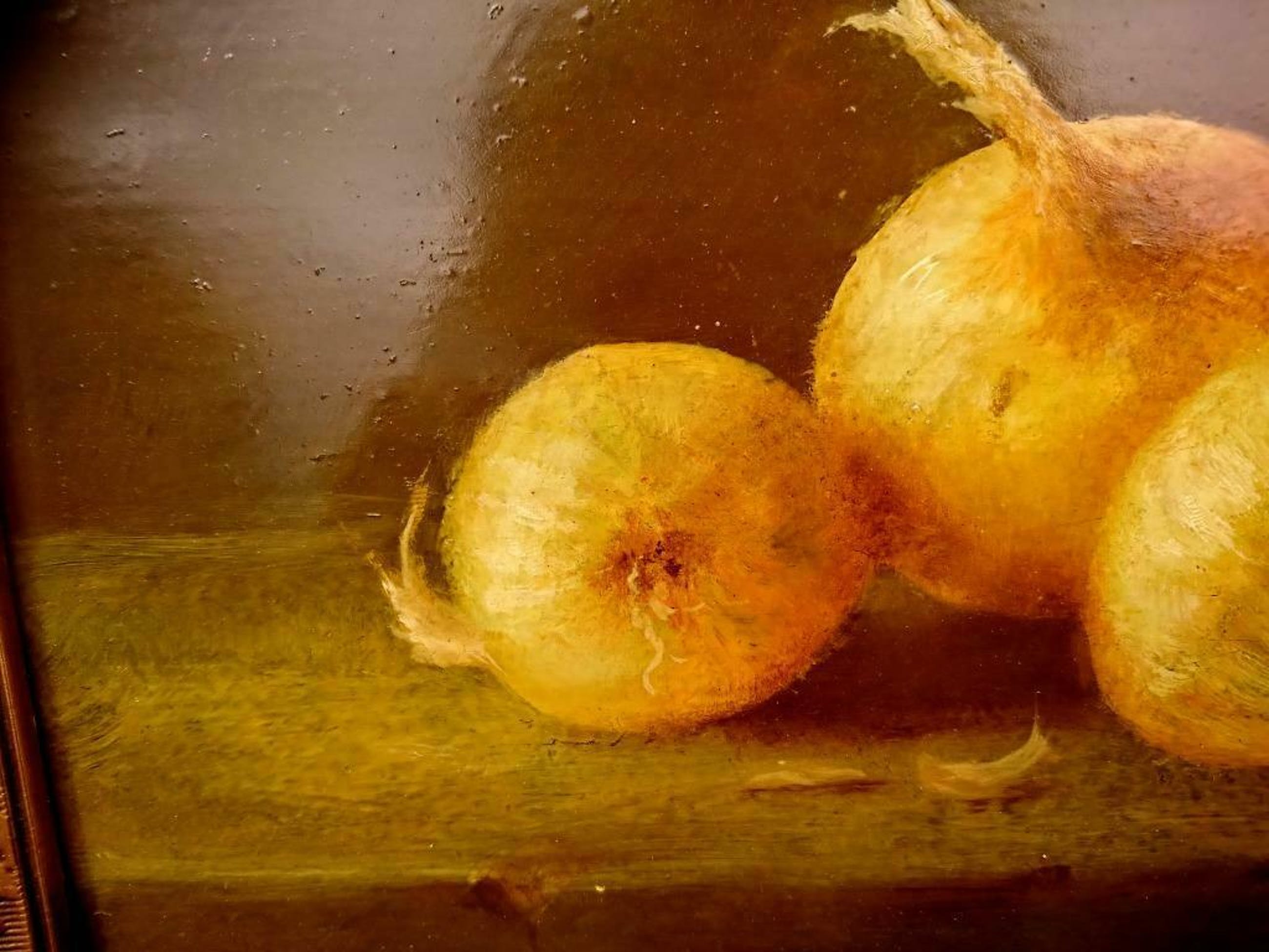 Schitterend hyper-realistisch olieverfschilderij op metalen paneel. Stilleven met uien, geschilderd in 1976 door Thomas Heesakkers (1946-).