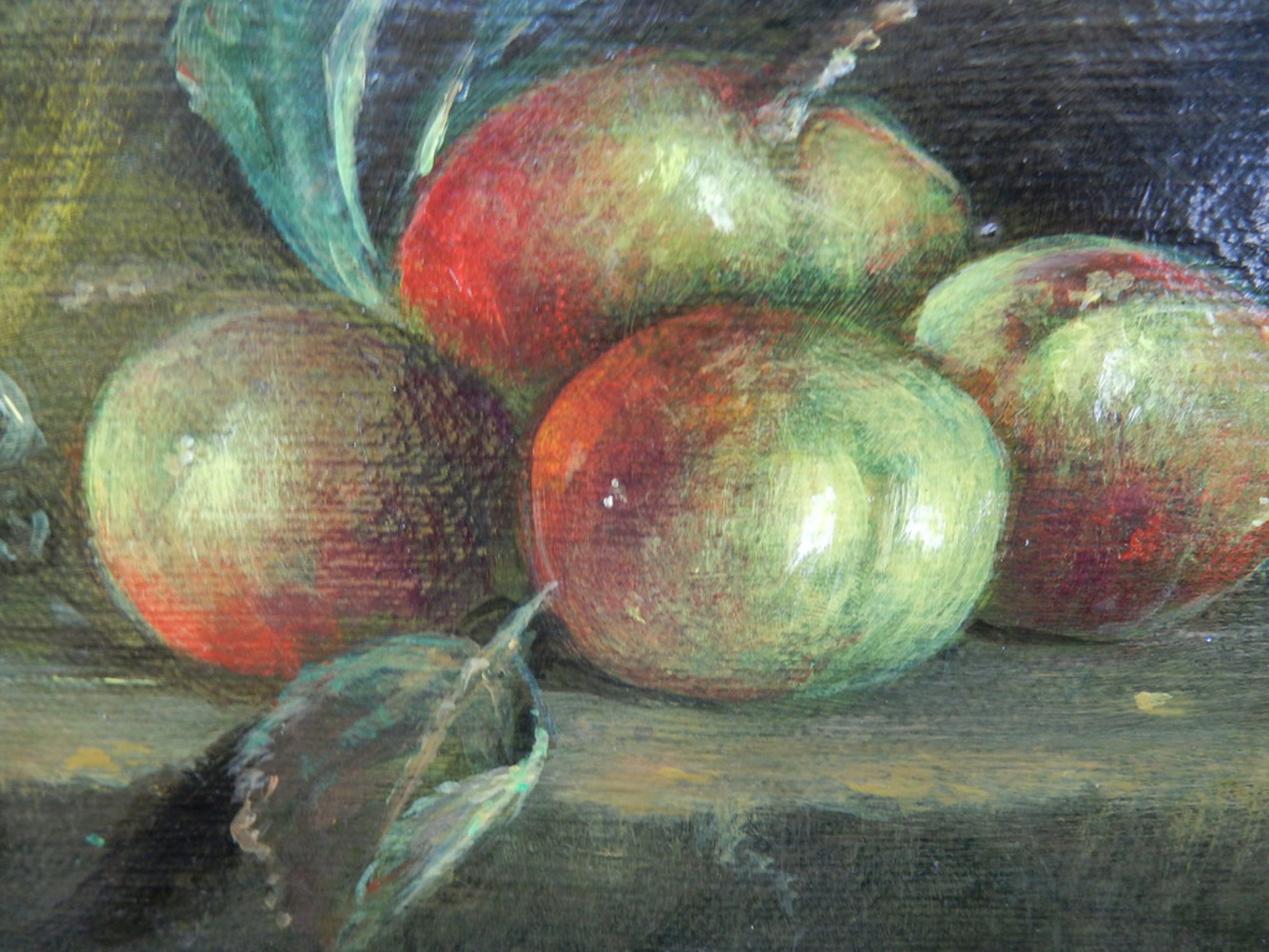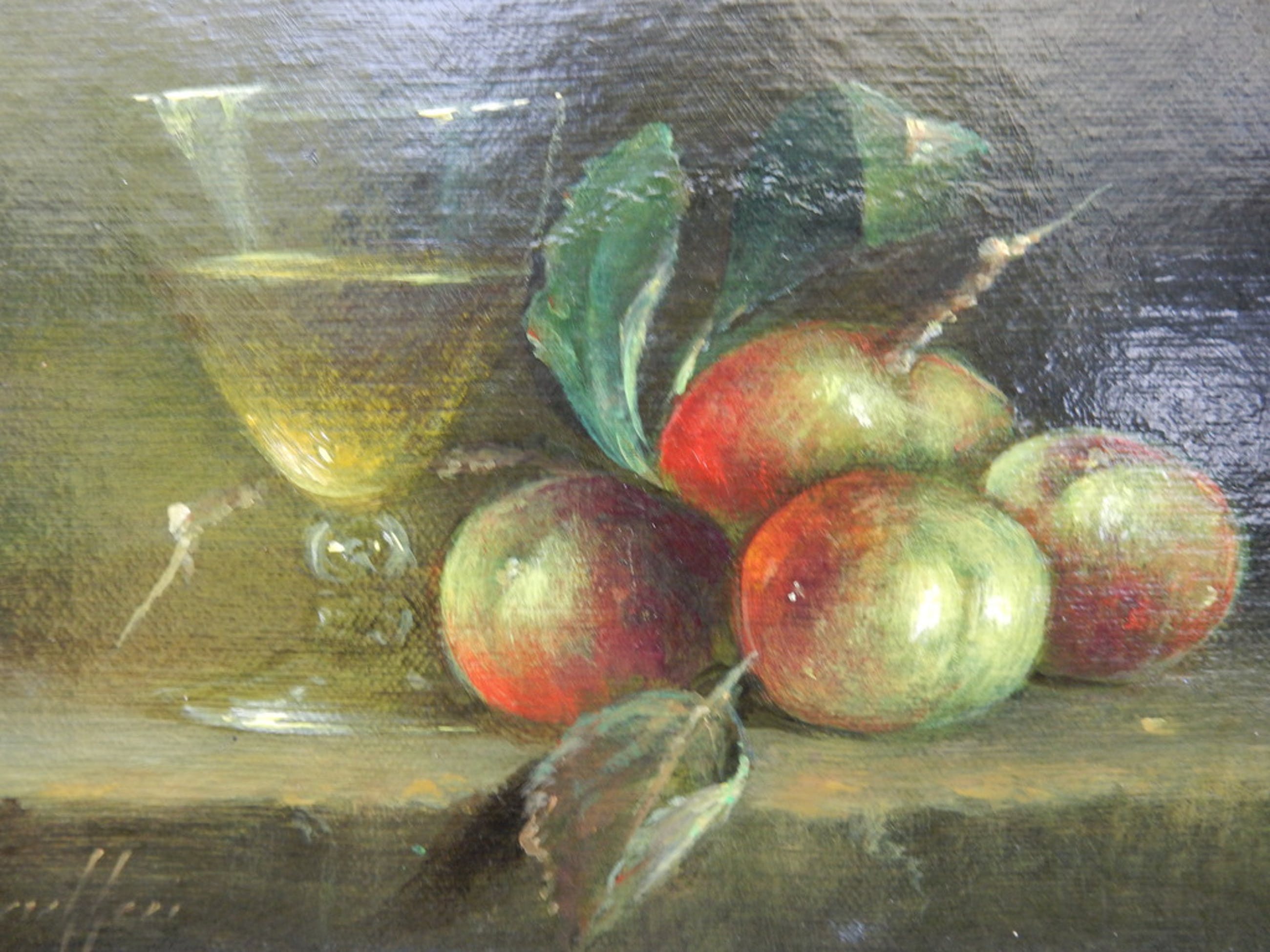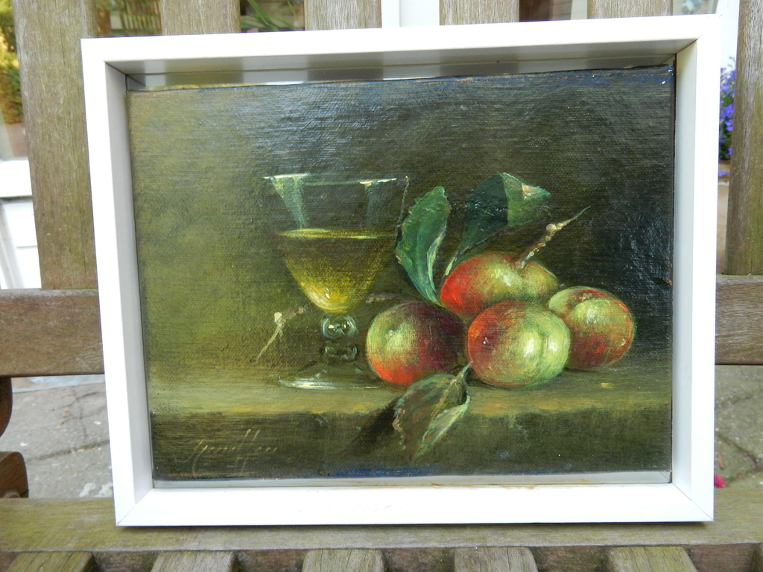 Dit werk: stilleven, glas met appels, olieverf op doek, op paneel., l.o. gesigneerd.