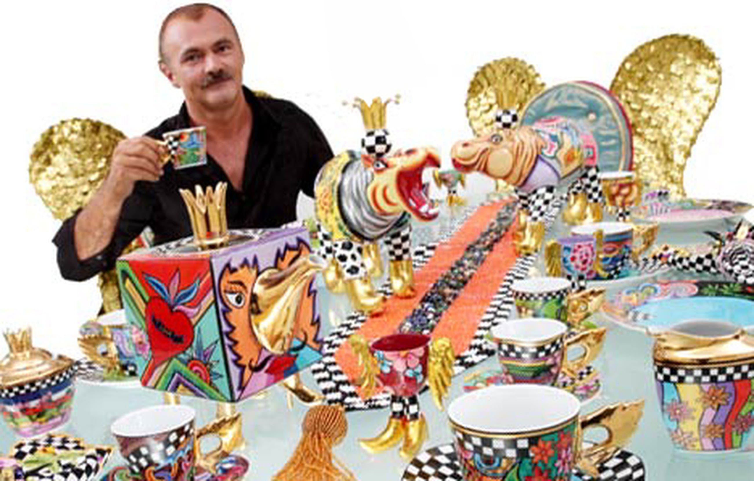 Uniek ontworpen en met de hand beschilderd, ingelegd met Strass kristallen en alle gouden details zijn bewerkt met 24 karaats bladgoud. Het basismateriaal is marmorin, een composiet van gemalen marmer en synthetische hars. Dit levert een materiaal op dat vergelijkbaar is met hoogwaardig keramiek.