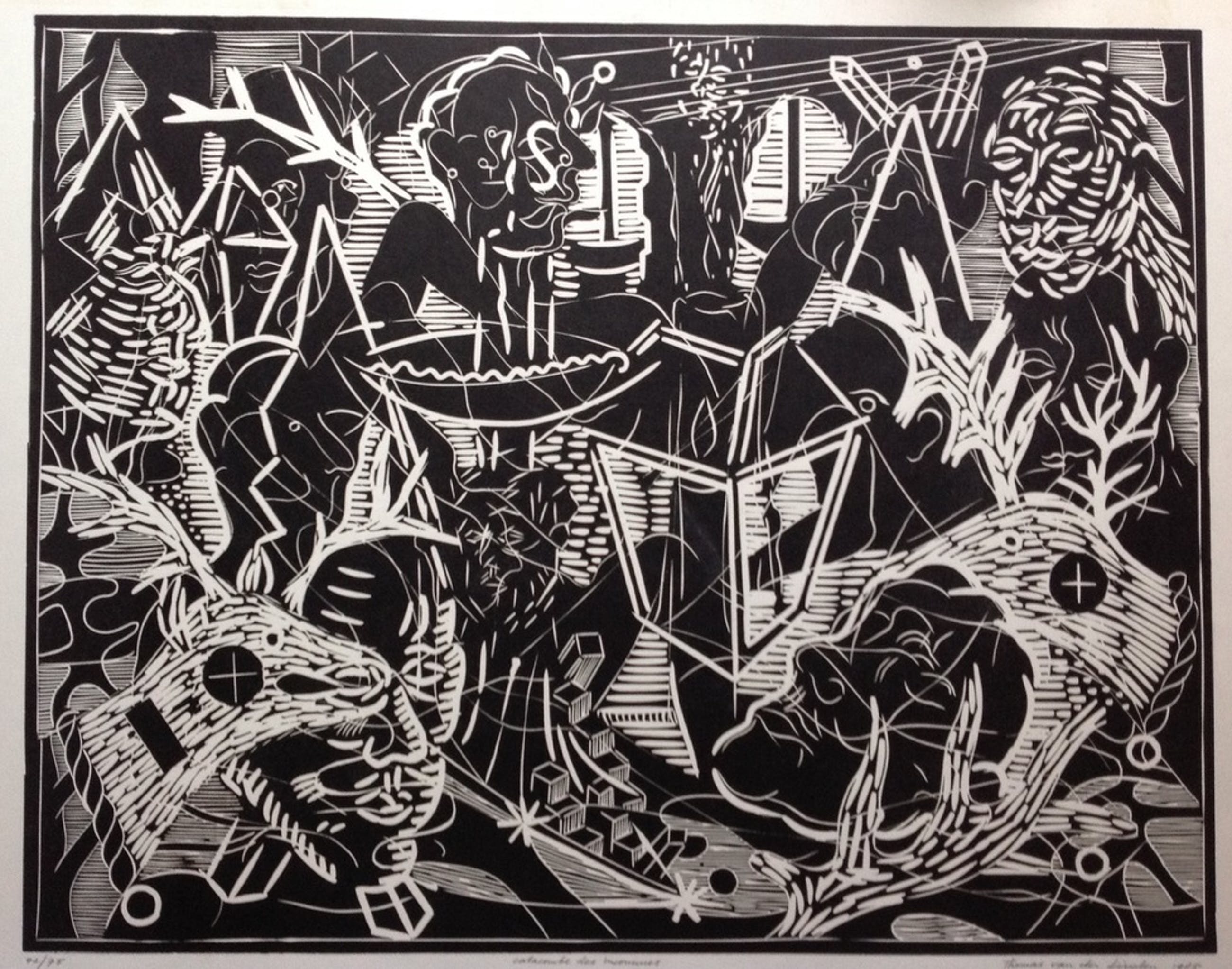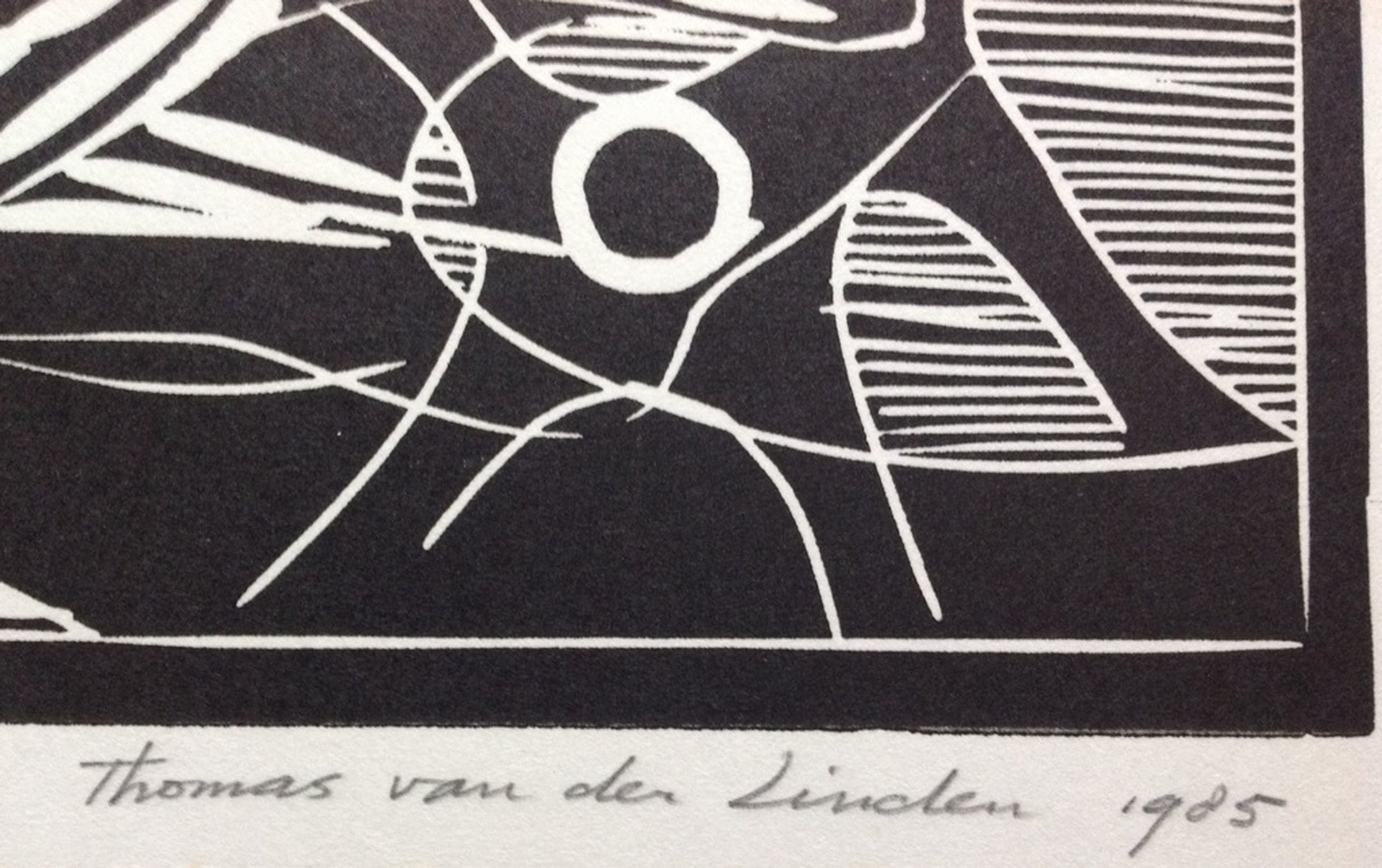 Lino 'catacombes des inconnues', van Thomas van der Linden, 1985, gesigneerd, 42/75, papierformaat 80 x 60, beeldformaat 65 x 50. Randen hebben vlekjes en verkleuringen, maar die vallen weg achter een passepartout.