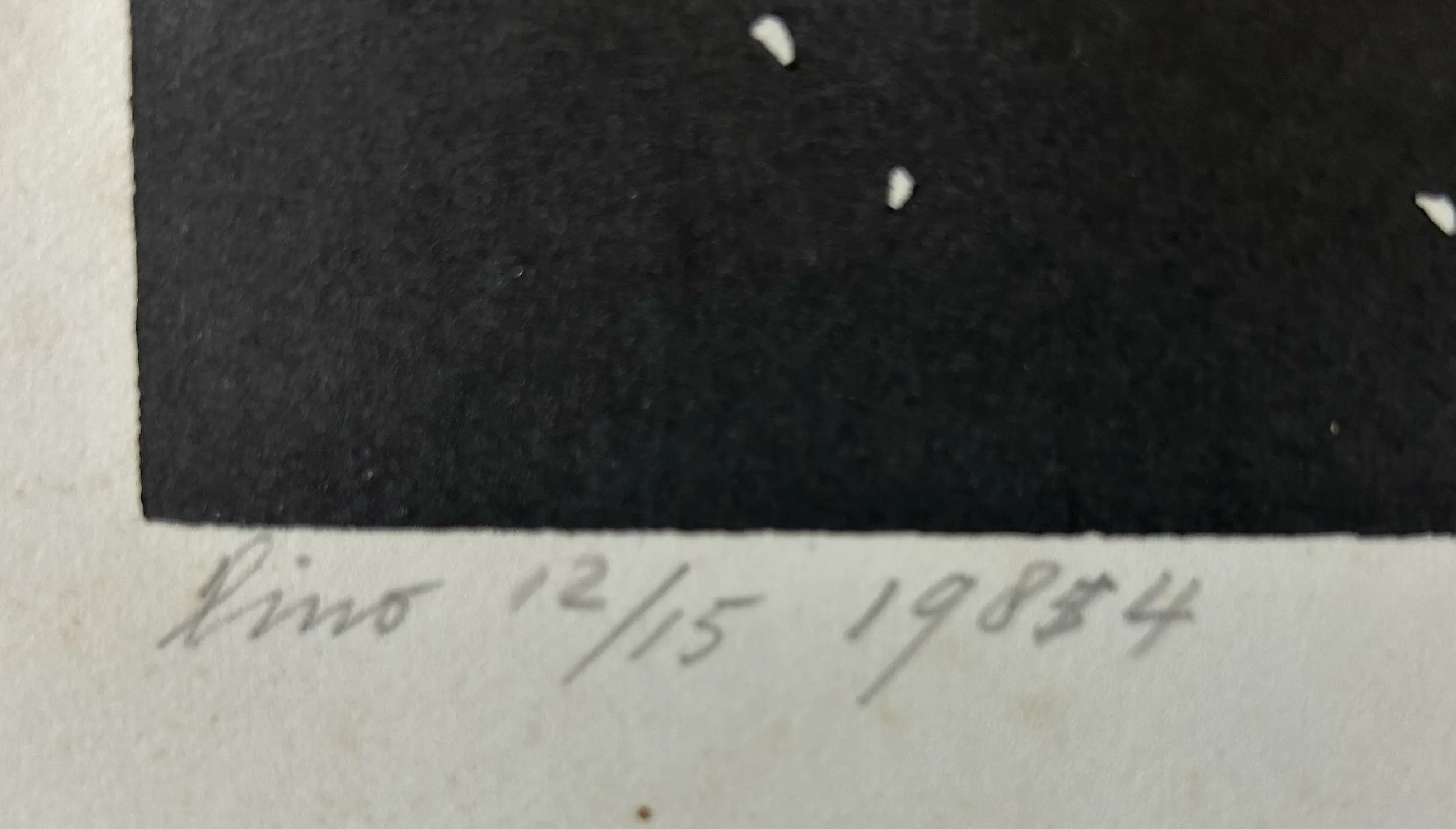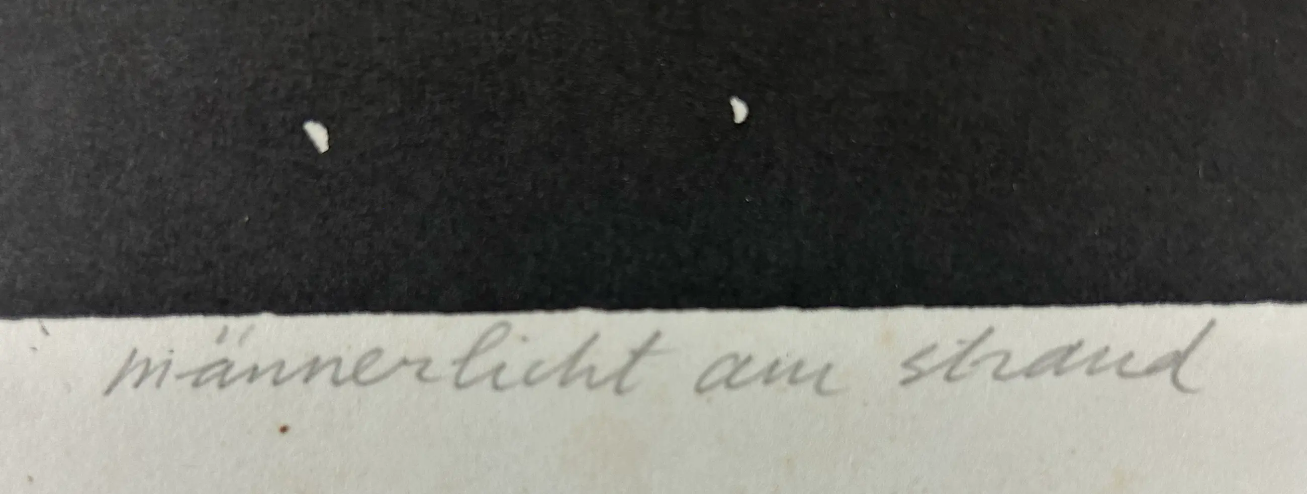 'Männerlicht am Strand' is een grote lino in een kleine oplage van de bekende kunstenaar Thomas van der Linden. Het werk is handgesigneerd, gedateerd en genummerd (nummer 12 van 15).