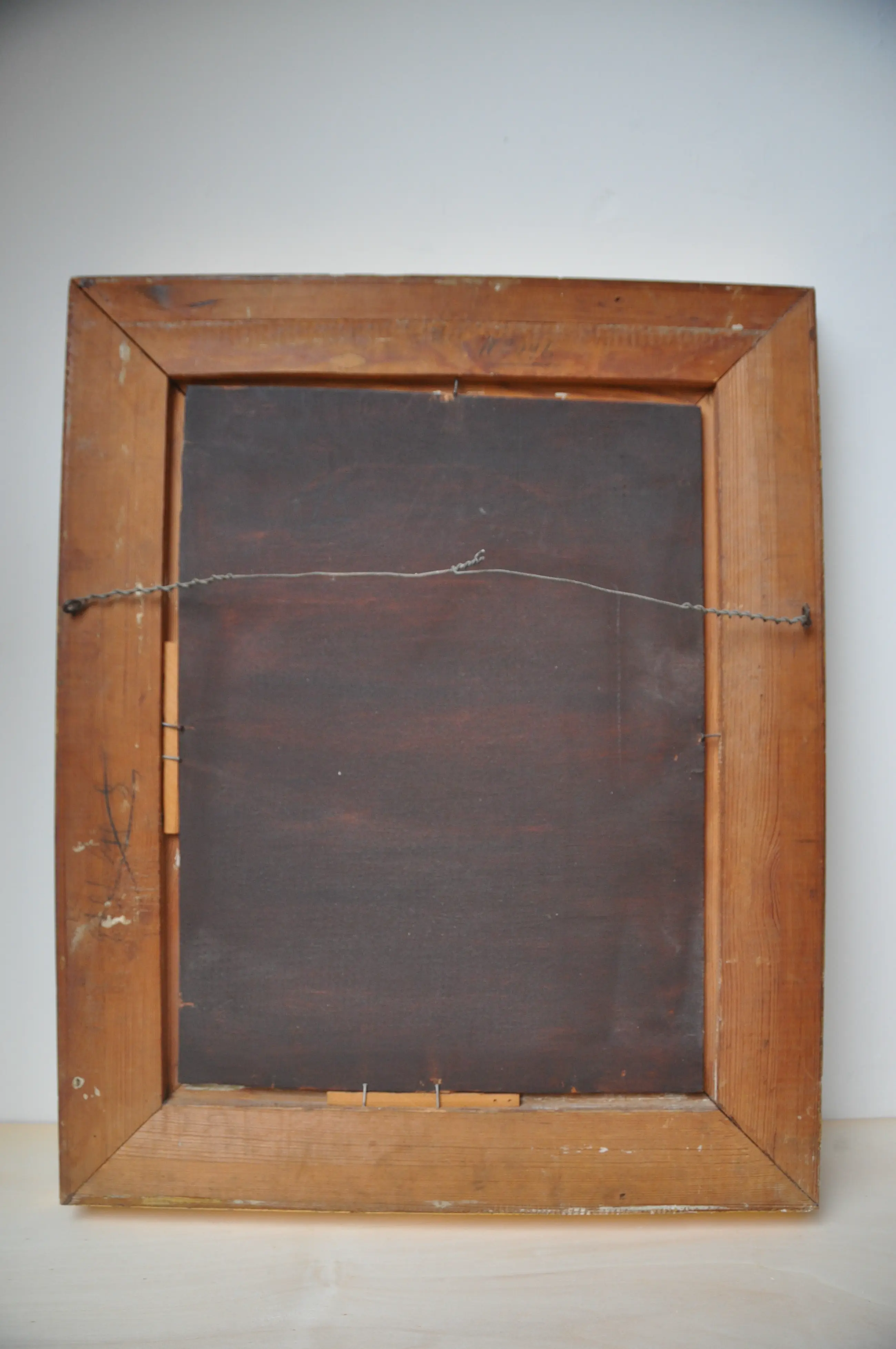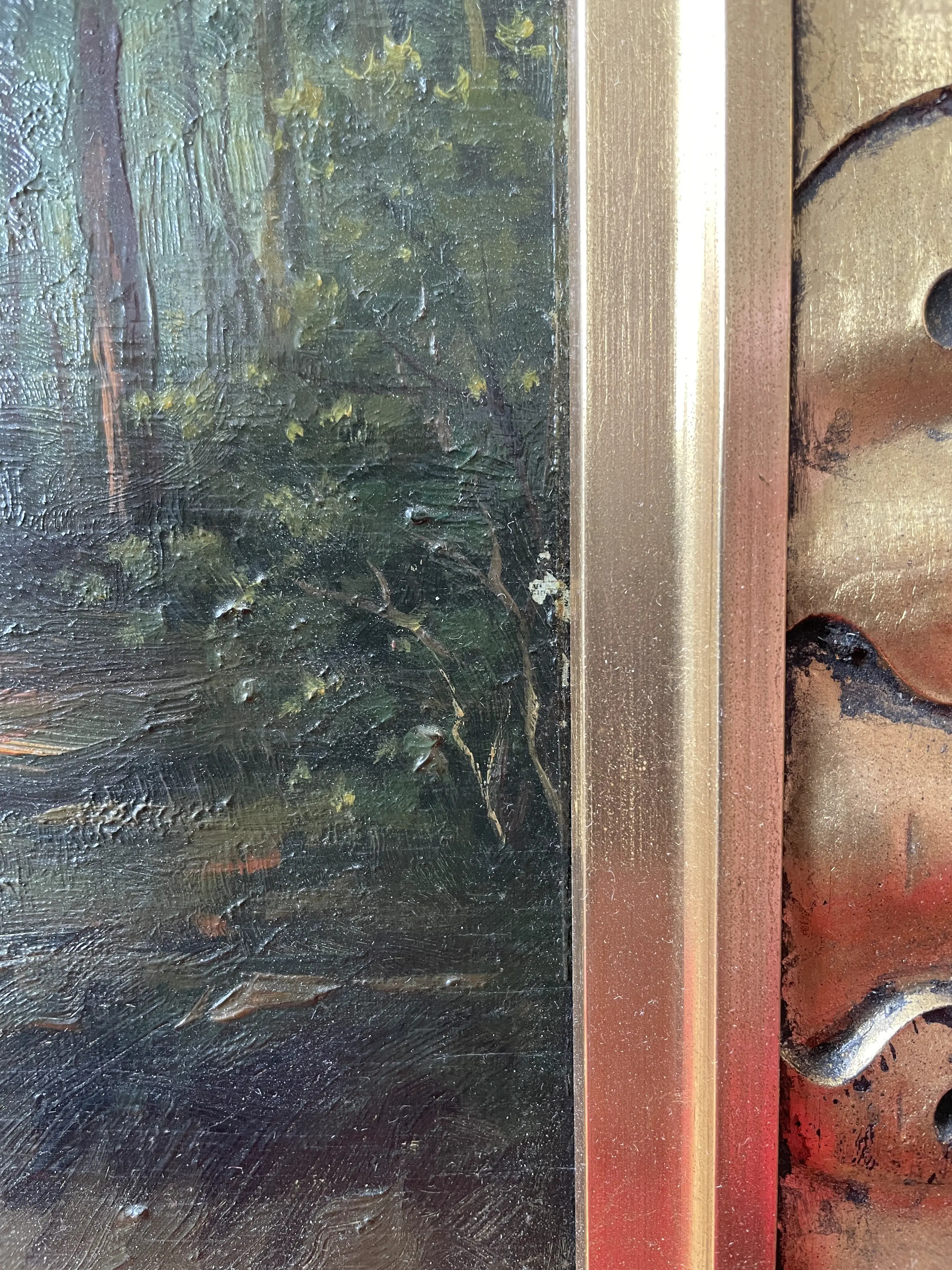 Het schilderij heeft aan de rechterkant bij de lijst een chipje van een paar mm (zie foto) en de lijst toont ook z'n ouderdom met een aantal kleine plekjes.Verder verkeren schilderij en lijst in goede staat.