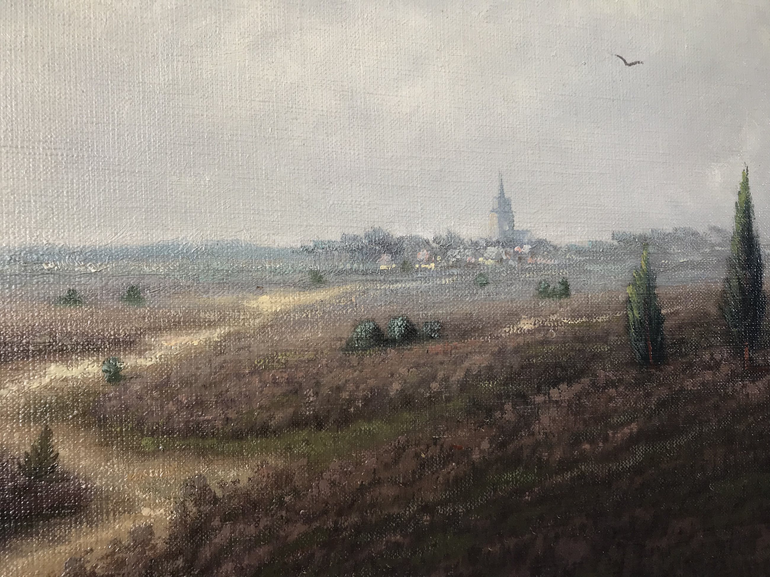 Heide landschap, met loop pad en vee schuur. Met in de verte en dorpje met kerk.