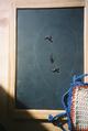 Schiefertafel, in der Mitte geteilt, mit Metallösen als ein Gesicht zusammengefügt, links am Rand signiert, nummeriert 7/30, datiert 2004 mit gehäkeltem Läppchen, 20 x 30