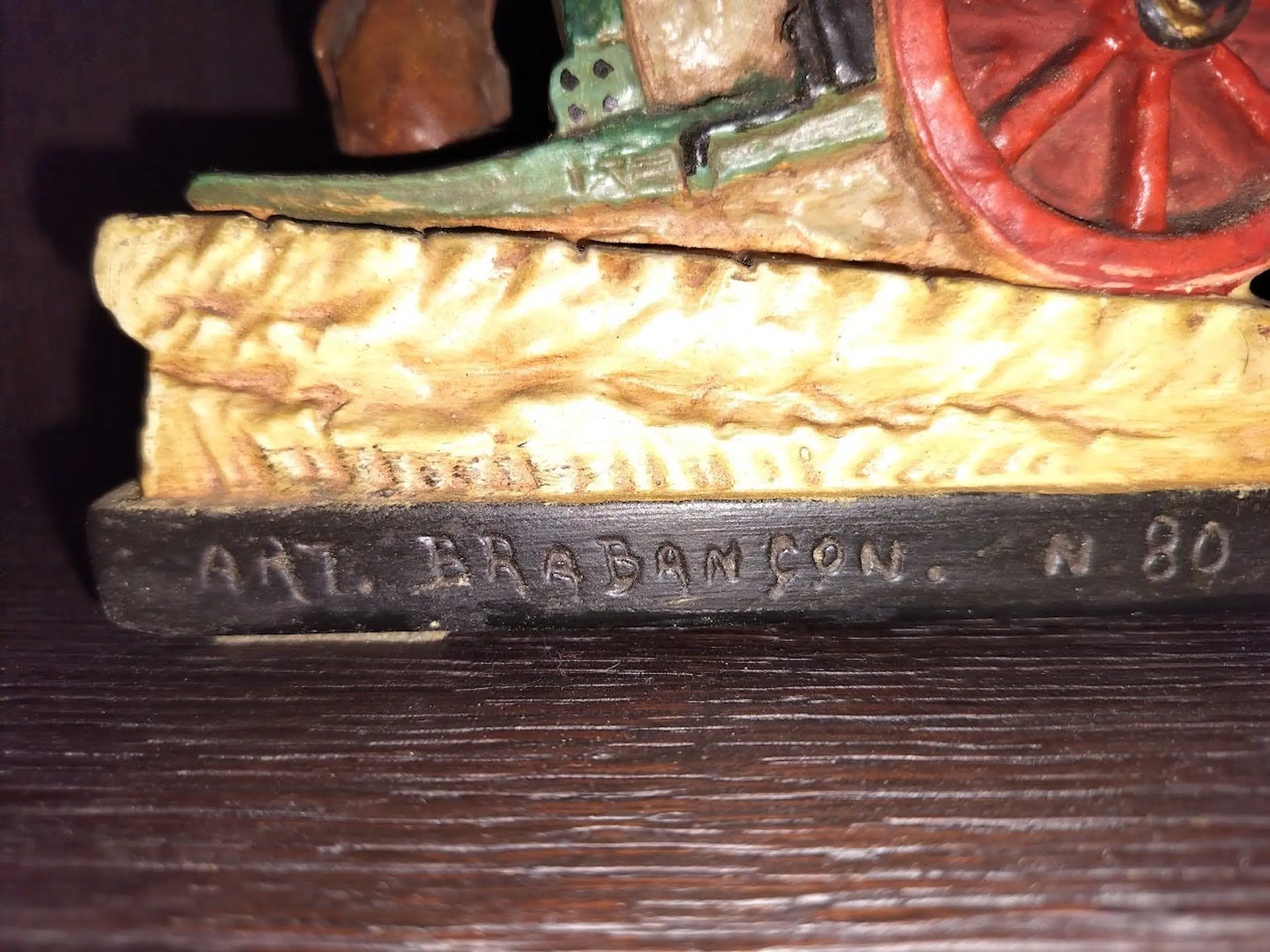 Het beeldje met modelnummer 80 is een exemplaar uit de bekende reeks "Art Brabançon", ontworpen door de Brusselse kunstenaar Tich (Jean-Baptiste) Vandenbalck (1926–1952). Omdat nummer 80 een relatief laag nummer is in hun catalogus , is het waarschijnlijk ontworpen in de jaren 30. Model nr. 80 stelt een Brussels draaiorgel voor. Het is een van de vele volkse scènes die Vandenbalck vastlegde om de sfeer van het naoorlogse Brussel te vereeuwigen. Het nummer 80 is achteraan in het gips gestanst of geschreven, wat gebruikelijk was voor de administratie van hun familieatelier. Productieproces "Art Brabançon" De kracht van deze beeldjes lag in de samenwerking tussen de drie broers Vandenbalck in hun atelier in Schaarbeek: • Tich: Boetseerde het oorspronkelijke model in terracotta. • Pierre: Maakte de gietvormen en goot de exemplaren af in zwaar plaaster (gips). • Désiré: Was verantwoordelijk voor de polychromie; hij schilderde elk beeldje met de hand, waardoor geen twee exemplaren exact hetzelfde zijn.