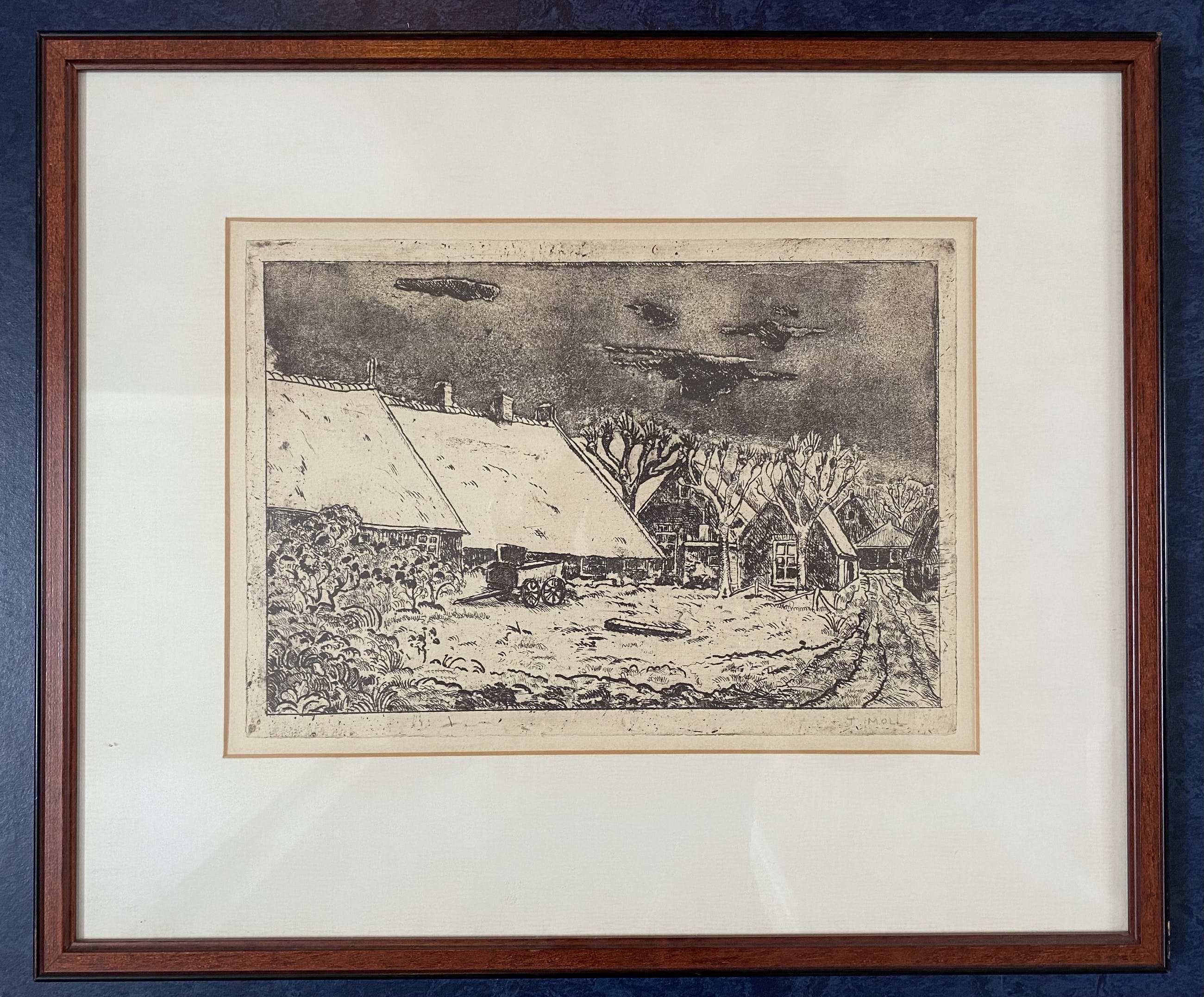 Afbeelding van een boerderij met schuur en huizen op de achtergrond. Aangezien Tijmen Moll uit Huizen komt en het soort afgebeelde huizen nog steeds in het dorp bestaan, is het vermoeden dat het uit zijn eigen geboortedorp komt. Gesigneerd met potlood rechtsonder.
