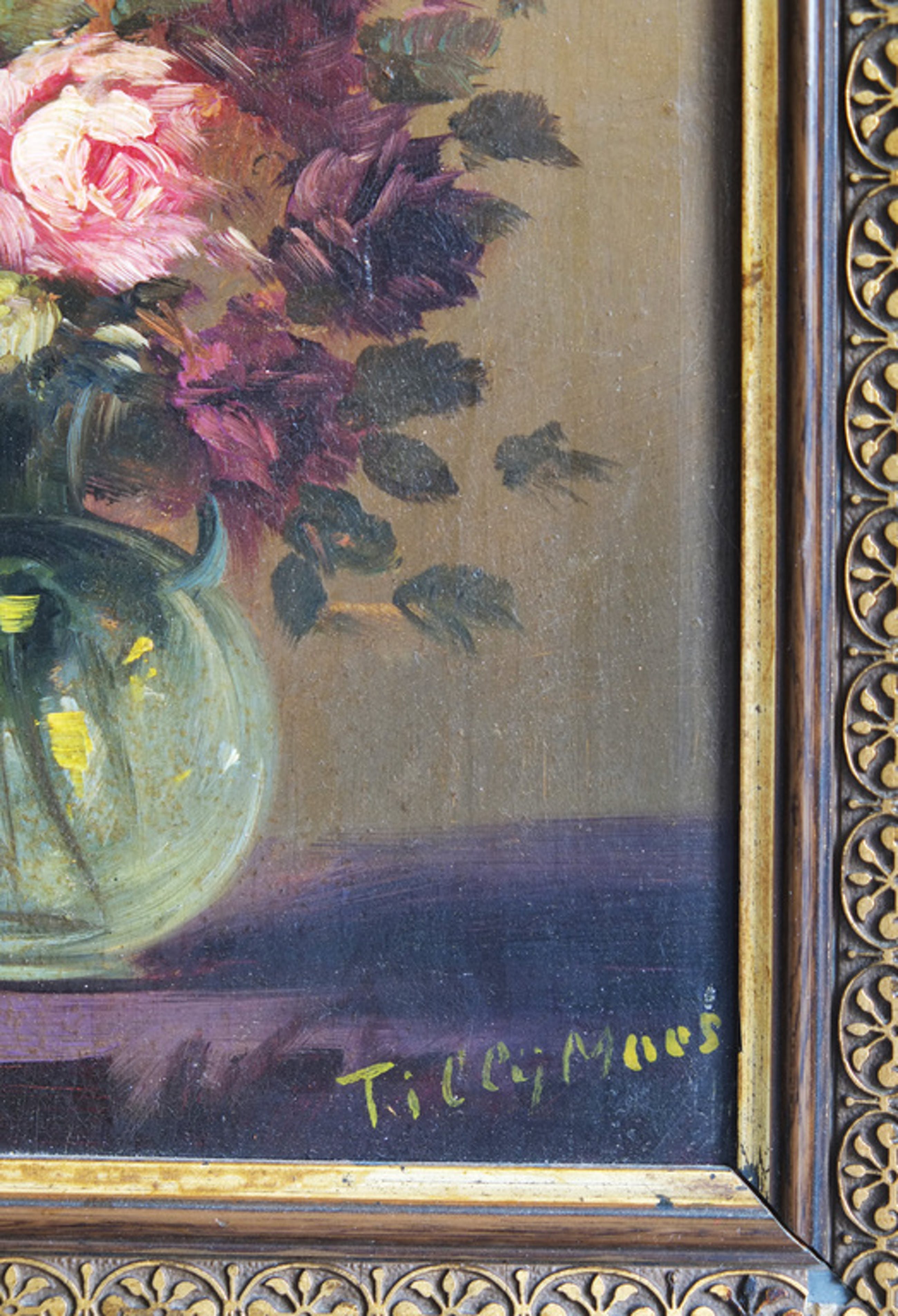 Mooi stilleven Van Tilly Moes ( Dusseldorf 1899- Arnhem 1979)) volgde haar opleiding aan de tekenacademie te Den Haag, voor verdere info over haar vindt u ruimschoots anecdotes op internet. Het hier aangeboden werk betreft een intiem bloemstilleven met olieverf op paneel geschilderd. Het is nog in smetteloze conditie en is ingelijst.