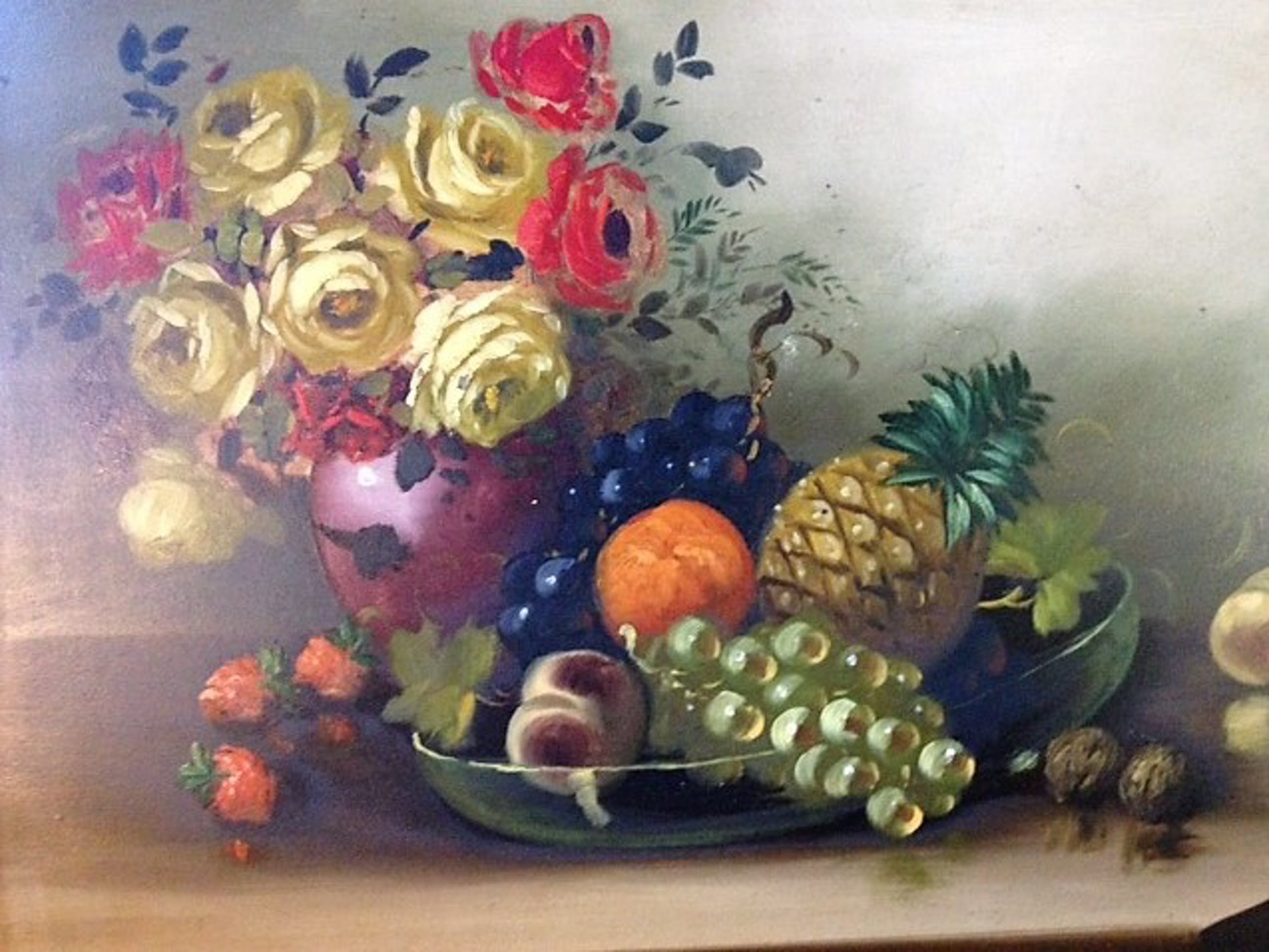 Stilleven: bloemen en fruit. Geschilderd door Tilly Moes (1899-1989). 20e eeuw. Techniek: olieverf op paneel. Gesigneerd aan de rechter onderzijde. De afmetingen van het paneel zijn: 60 cm x 40 cm. Inclusief de lijst zijn de afmetingen: 74 cm x 54 cm.