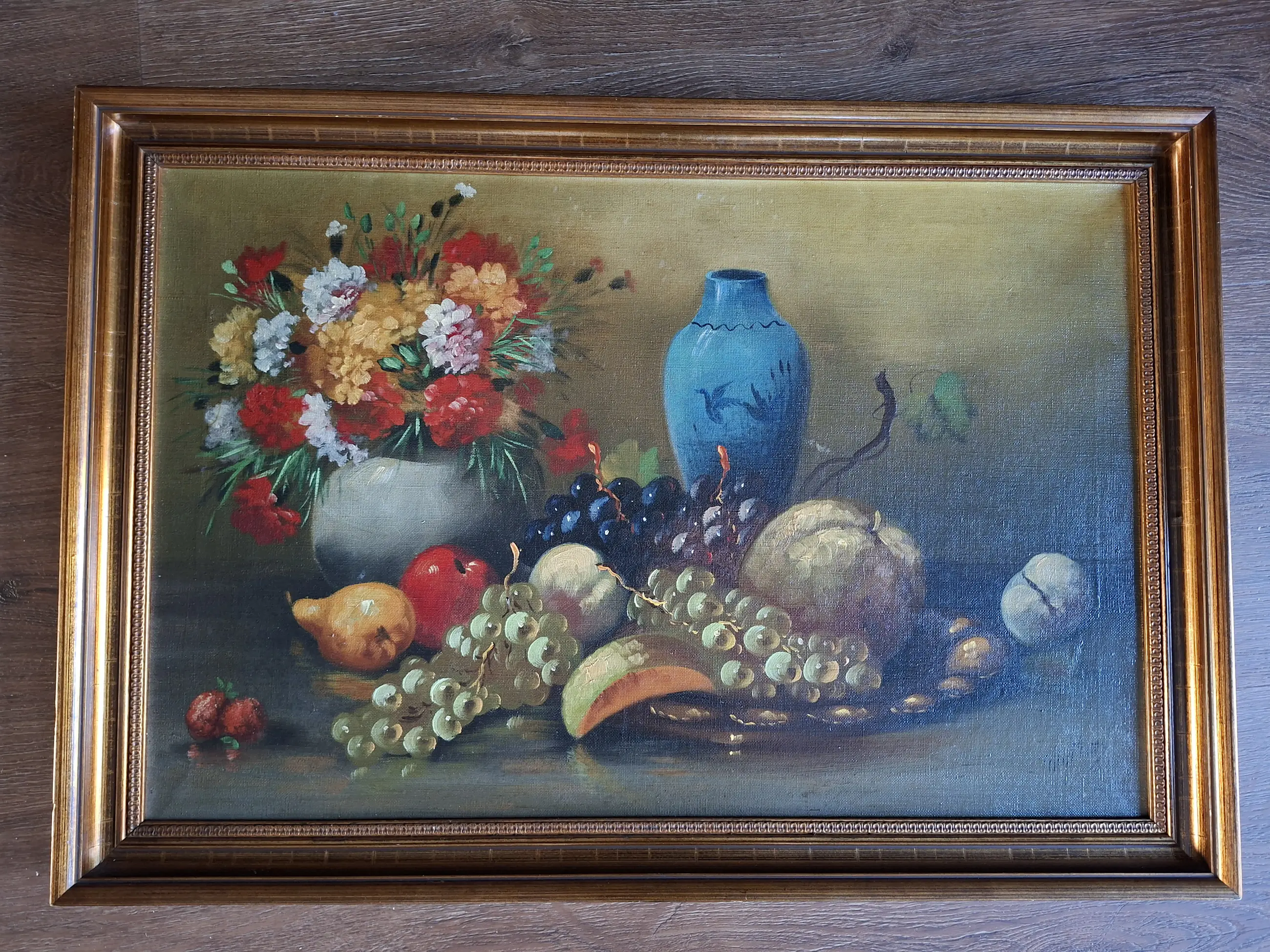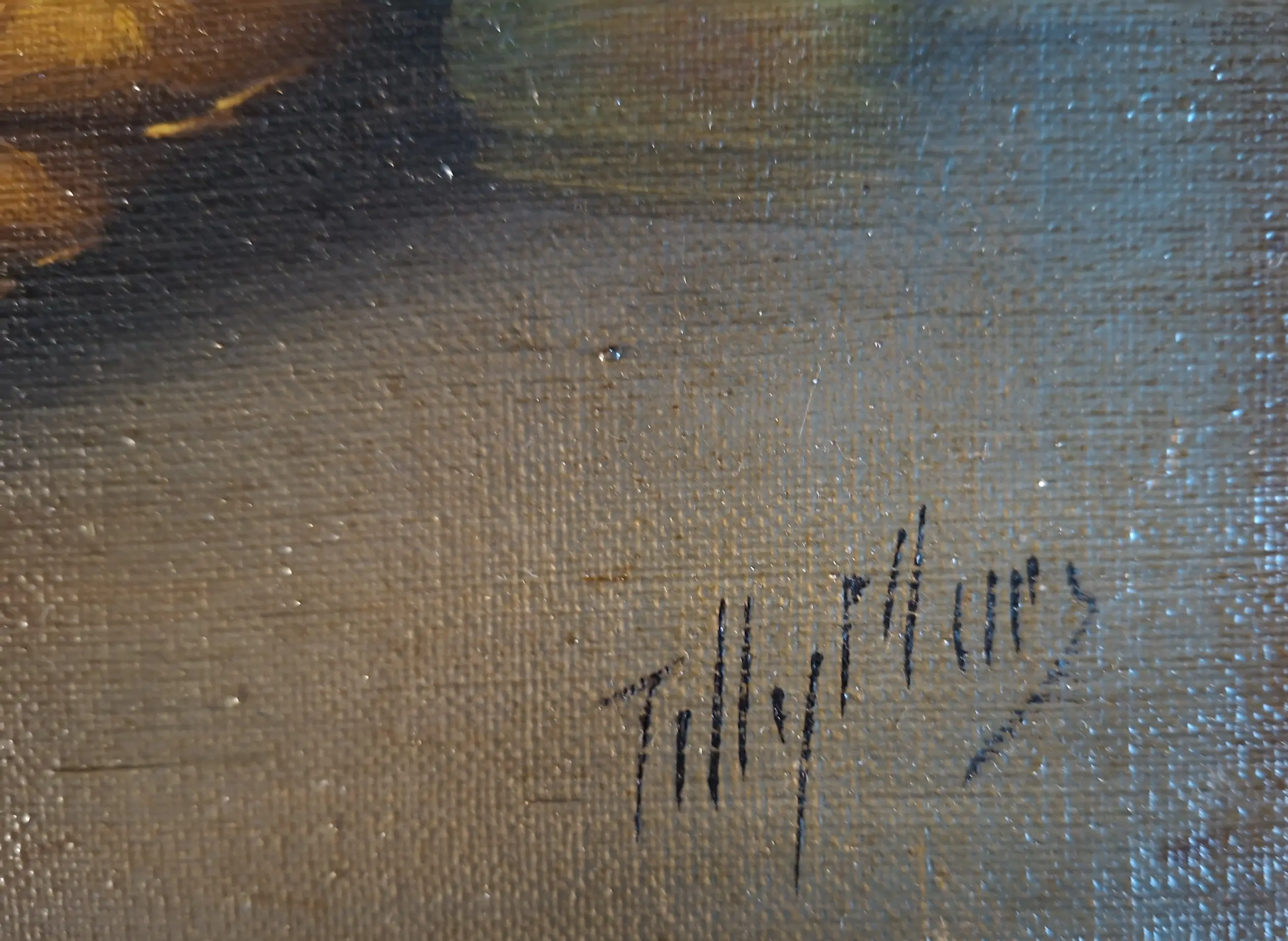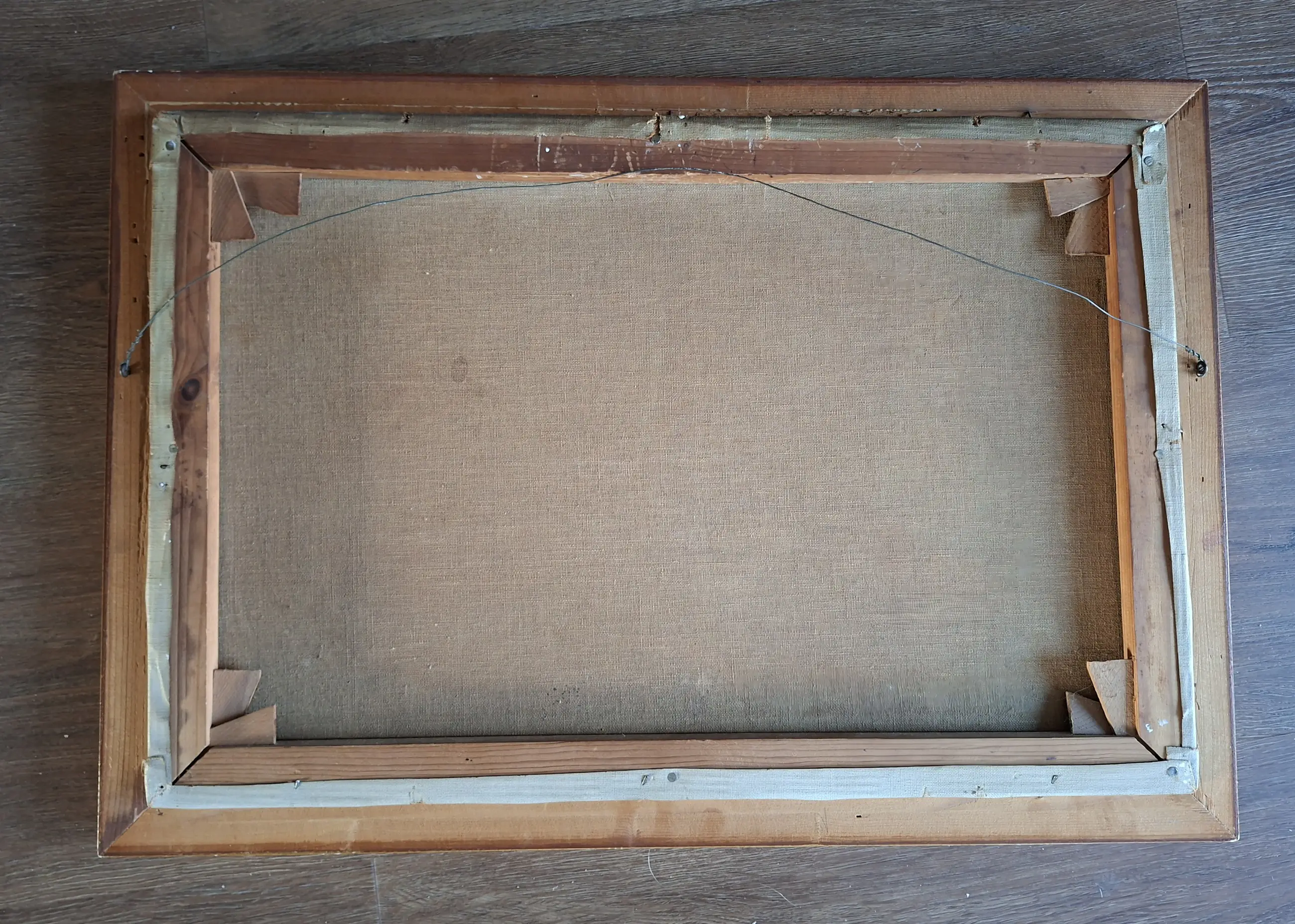 Een prachtig werk van Tilly Moes met een mooie klassieke koperkleurige houten lijst. De lijst heeft aan een zijkant enkele kleine kleurbeschadigingen.