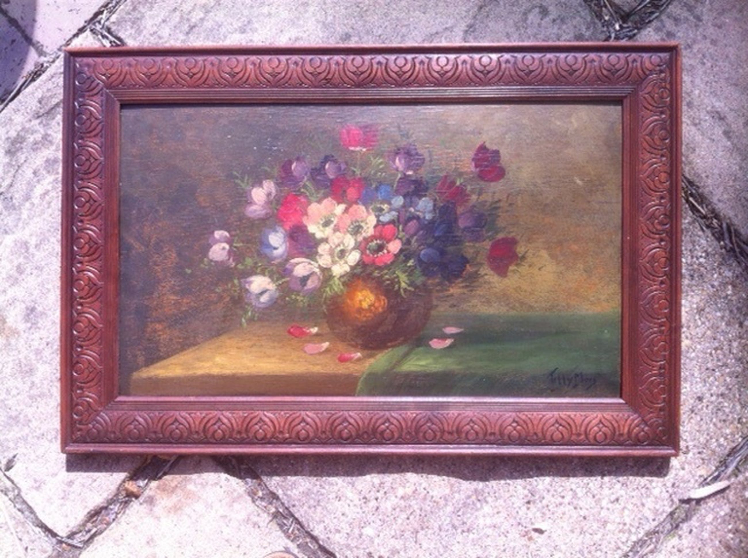 Een verhaal apart betreft en motief dat zeer succesvol bleek. Haar man Nico, ook een kunstschilder, had veel succes met een stilleven-opstelling van een elegant vaasje bloemen naast een gedrapeerd gordijn, op een spiegelend tafelblad. De zorgvuldige maar traag werkende Nico deed echter veel te lang over een exemplaar. Om tot een hogere productie te komen nam Fia eerst een deel van de taak over: ze vulde de bloemen in. Tenslotte maakte zij, vanaf 1940, het hele stilleven onder haar aloude naam Tilly Moes.