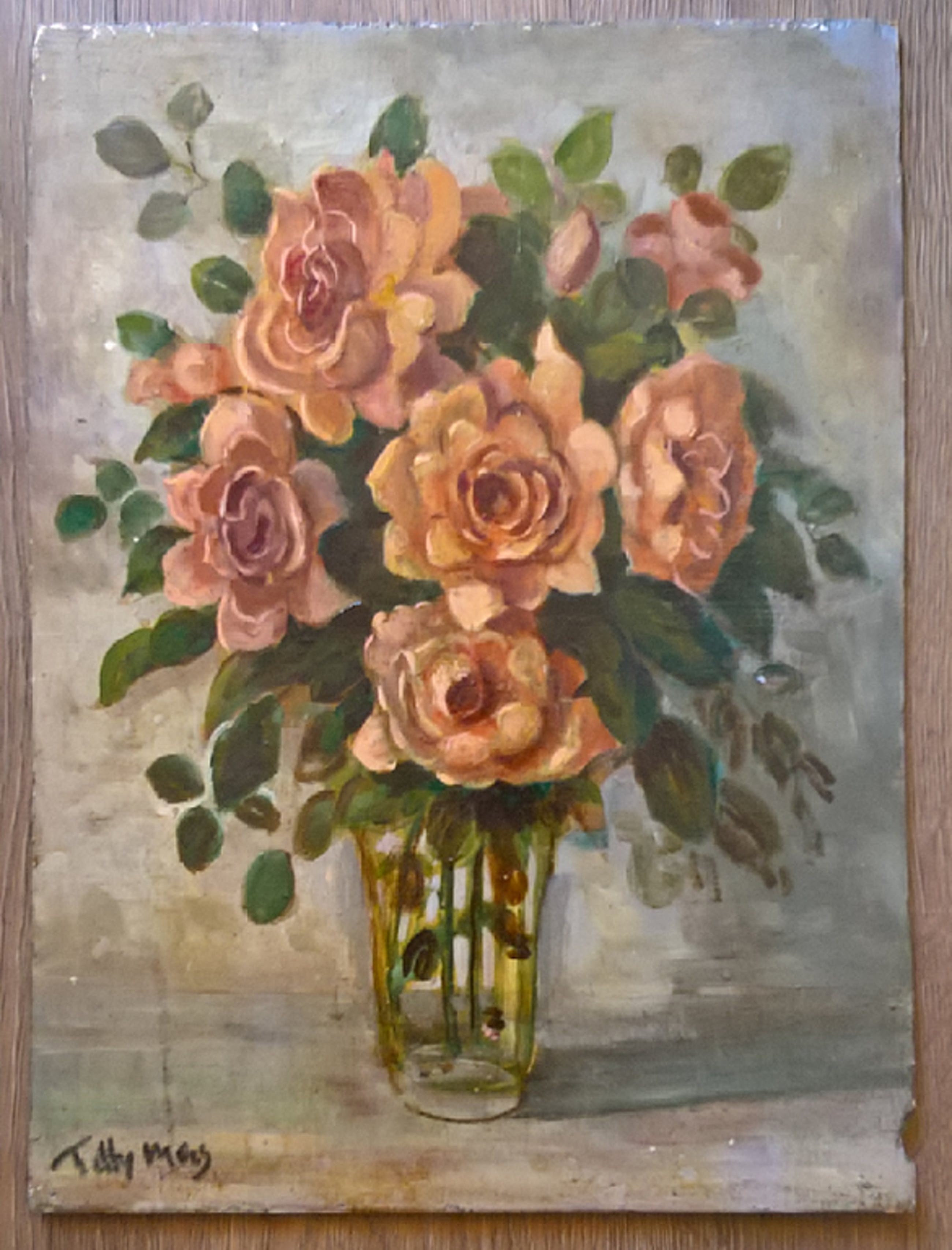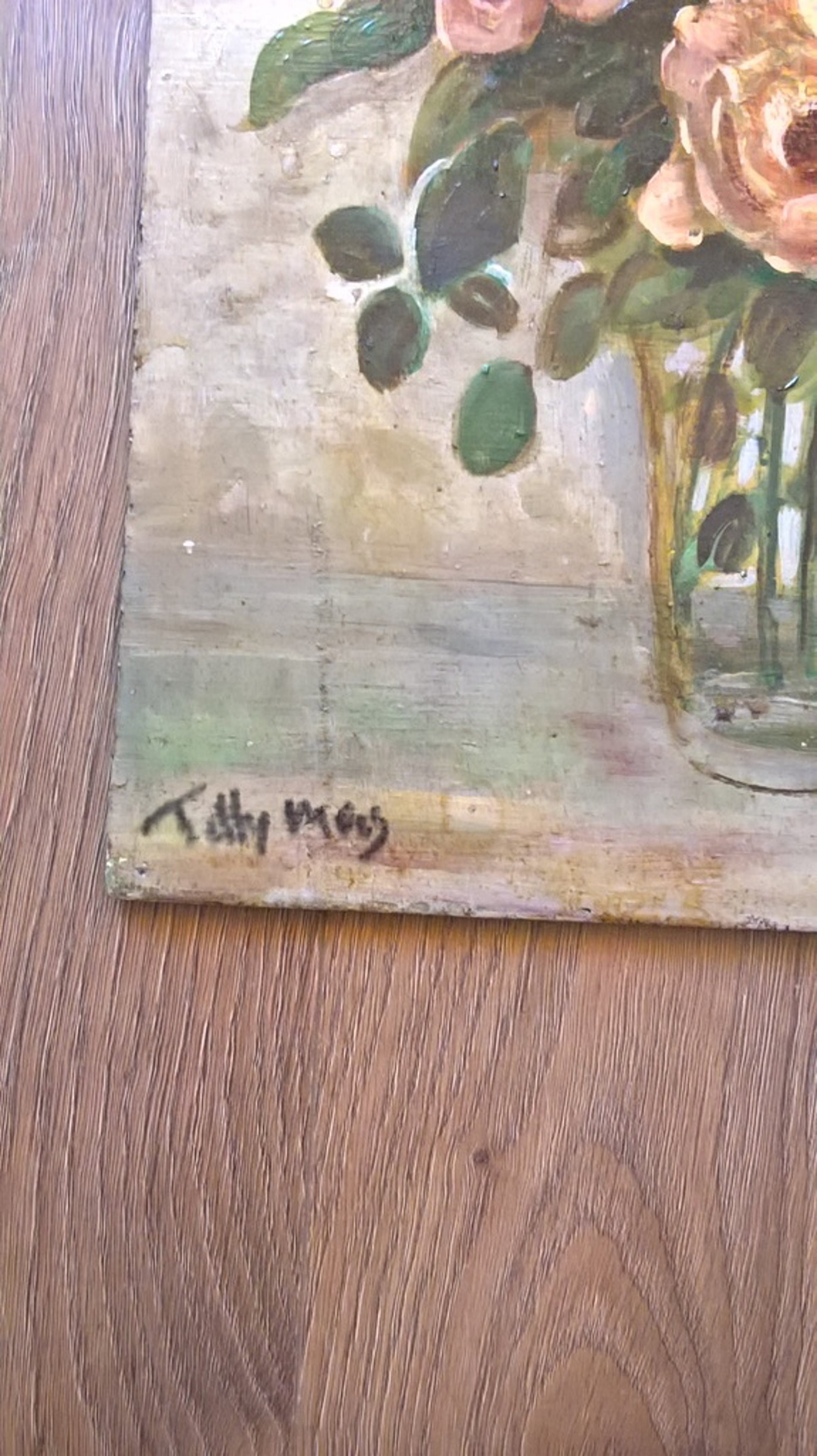 Olieverf op triplex. Rozen in vaas geschilderd door Tilly Moes. Rechts is een klein stukje van het triplex maar dat zal wegvallen in de lijst. Gesigneerd, niet ingelijst. Formaat 30 bij 40 cm.