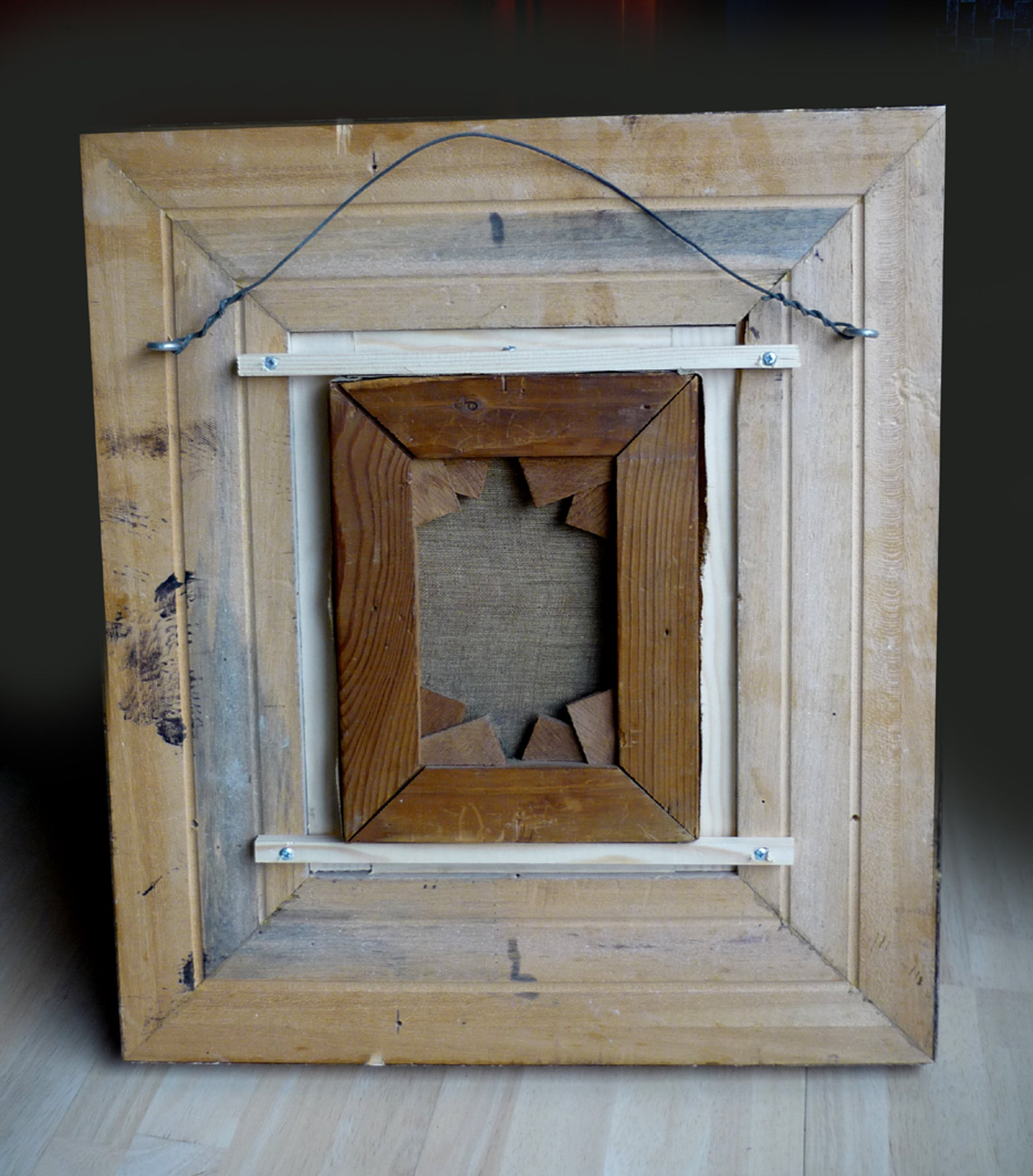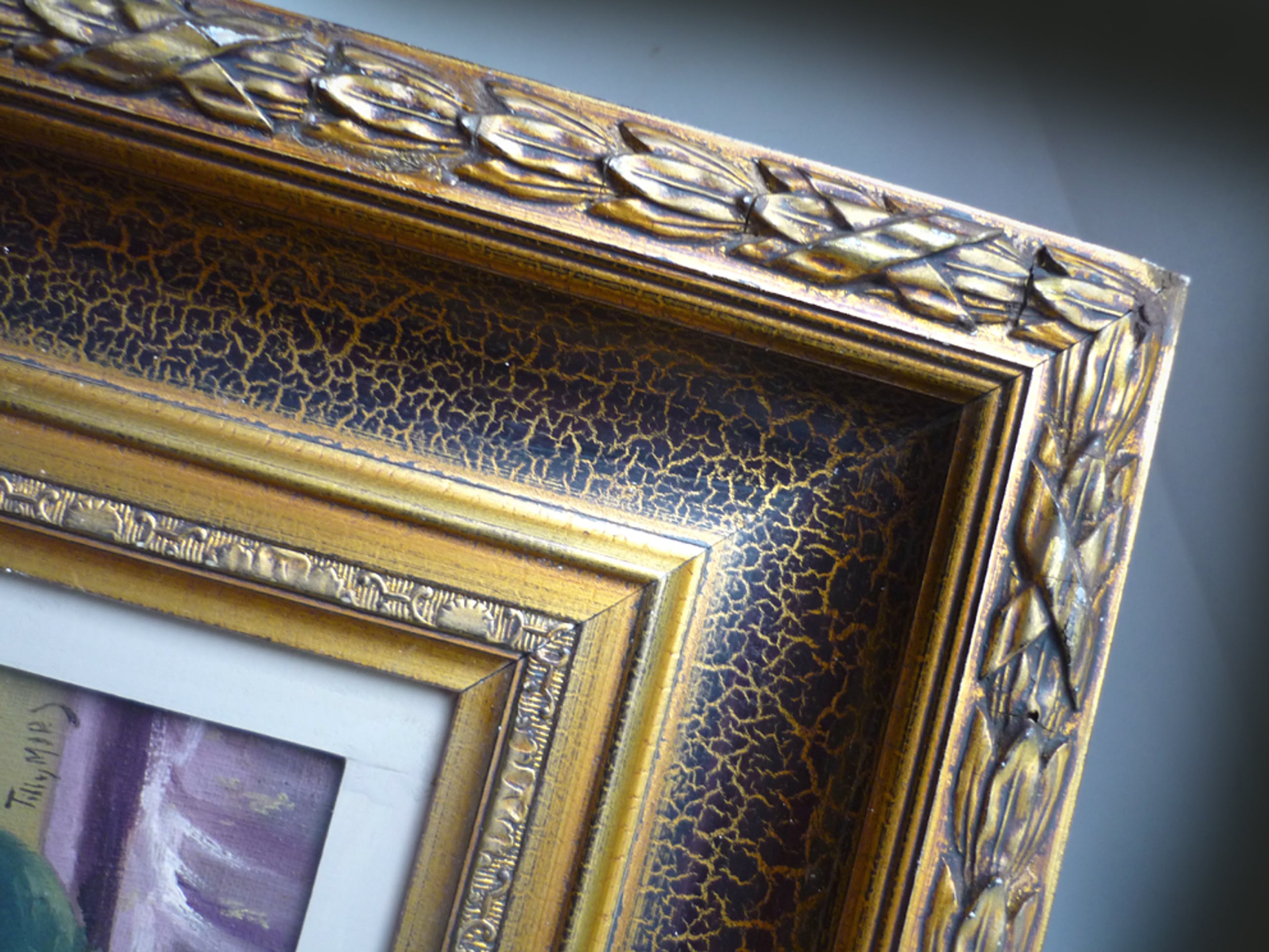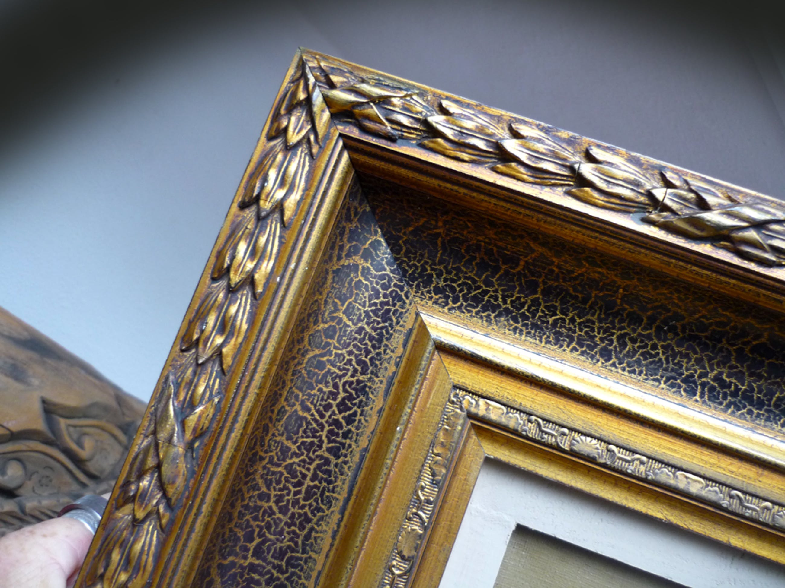 In een zware vergulde houten lijst met fraaie ornamenten. Geeft het geheel veel uitstraling.