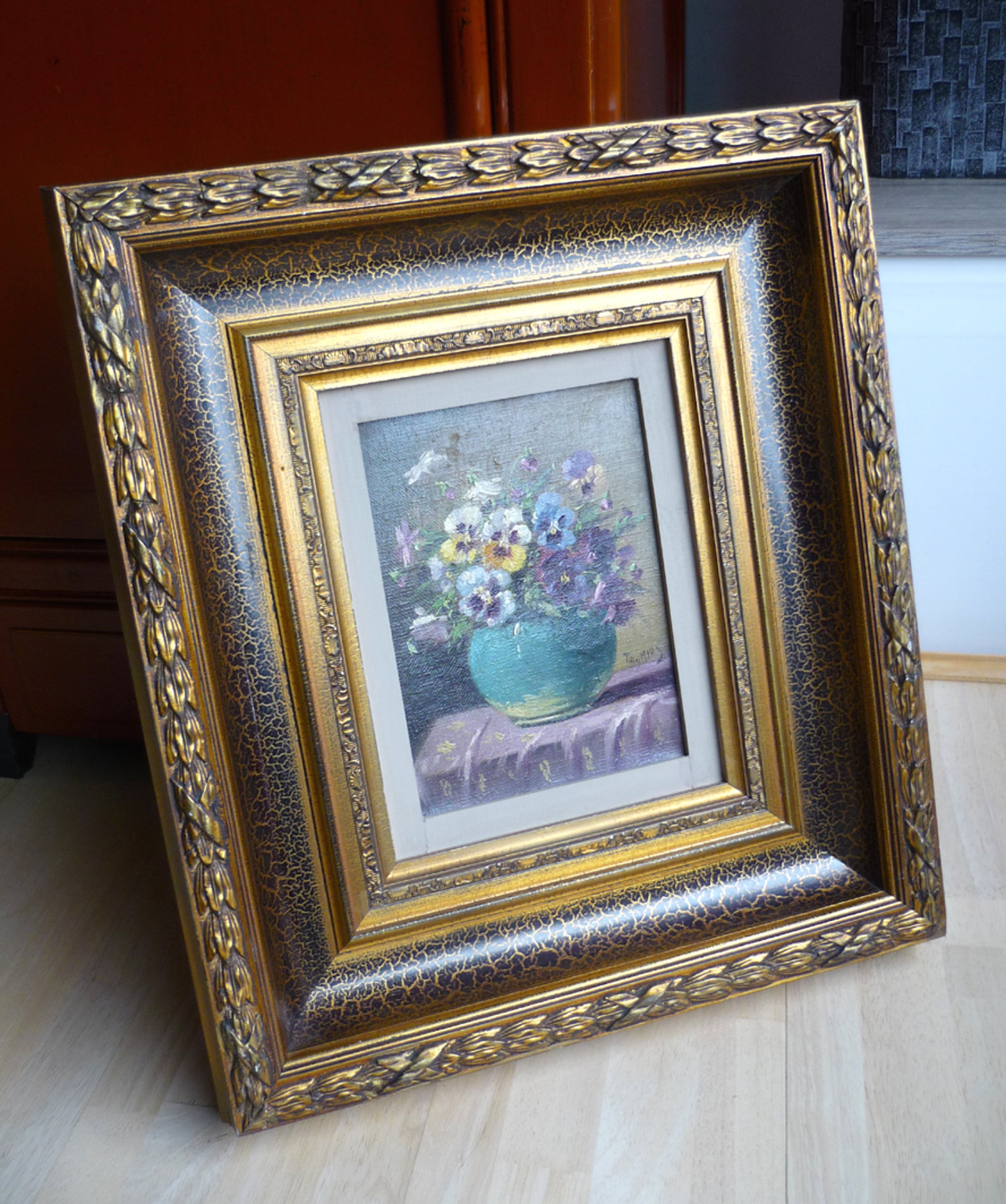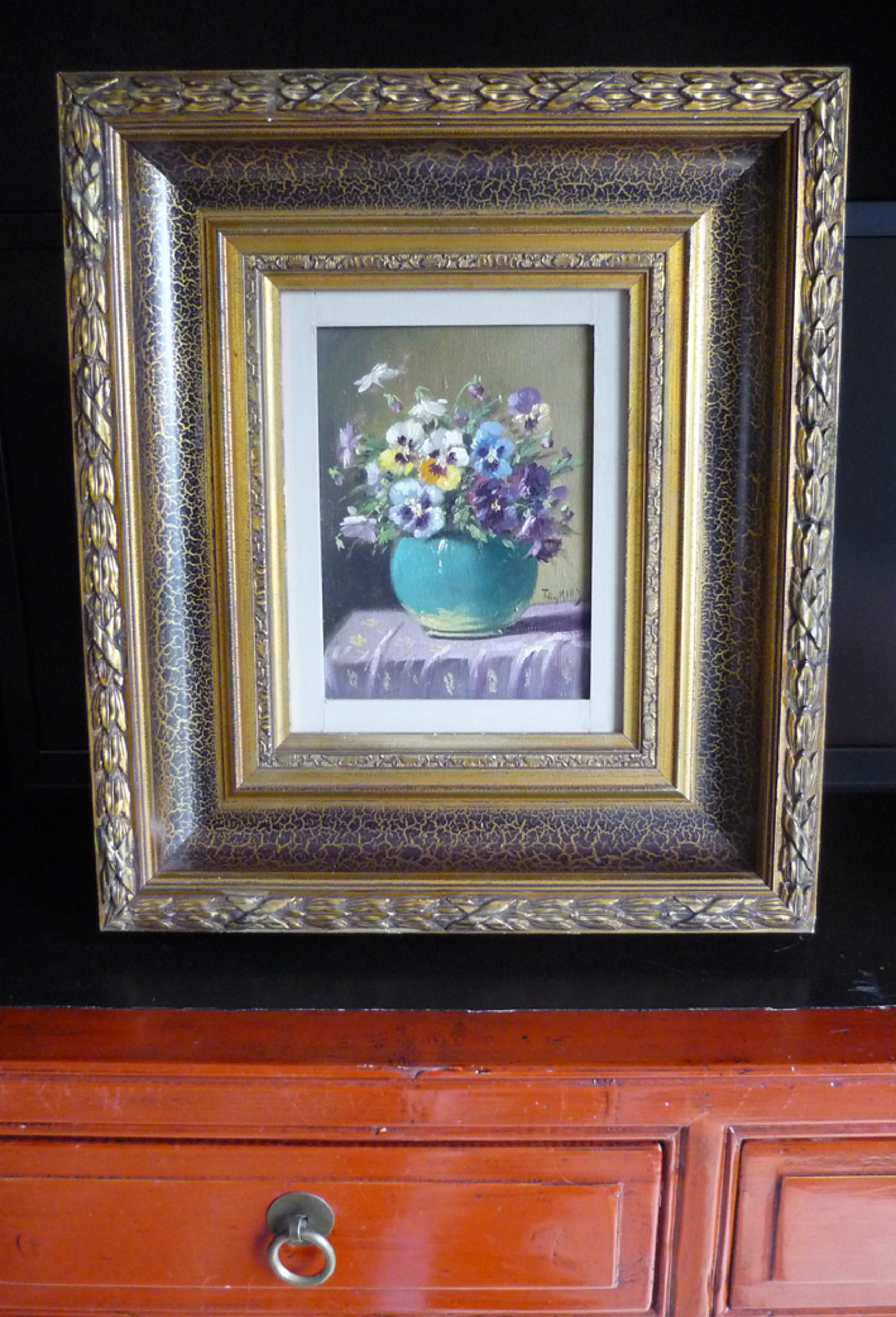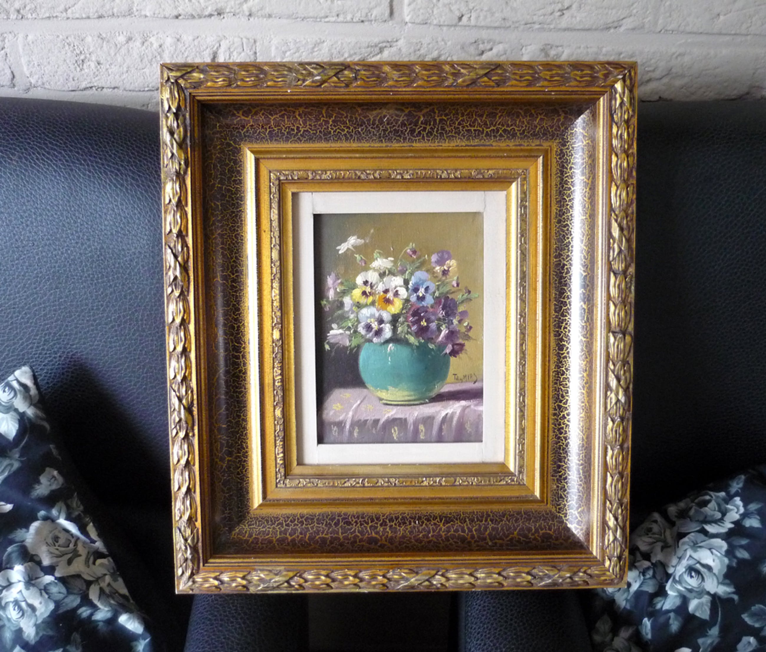 Een mooi geschilderd bloementafereel. Viooltjes vallen altijd erg in de smaak. Het is een boeketje viooltjes in mooi coloriet.