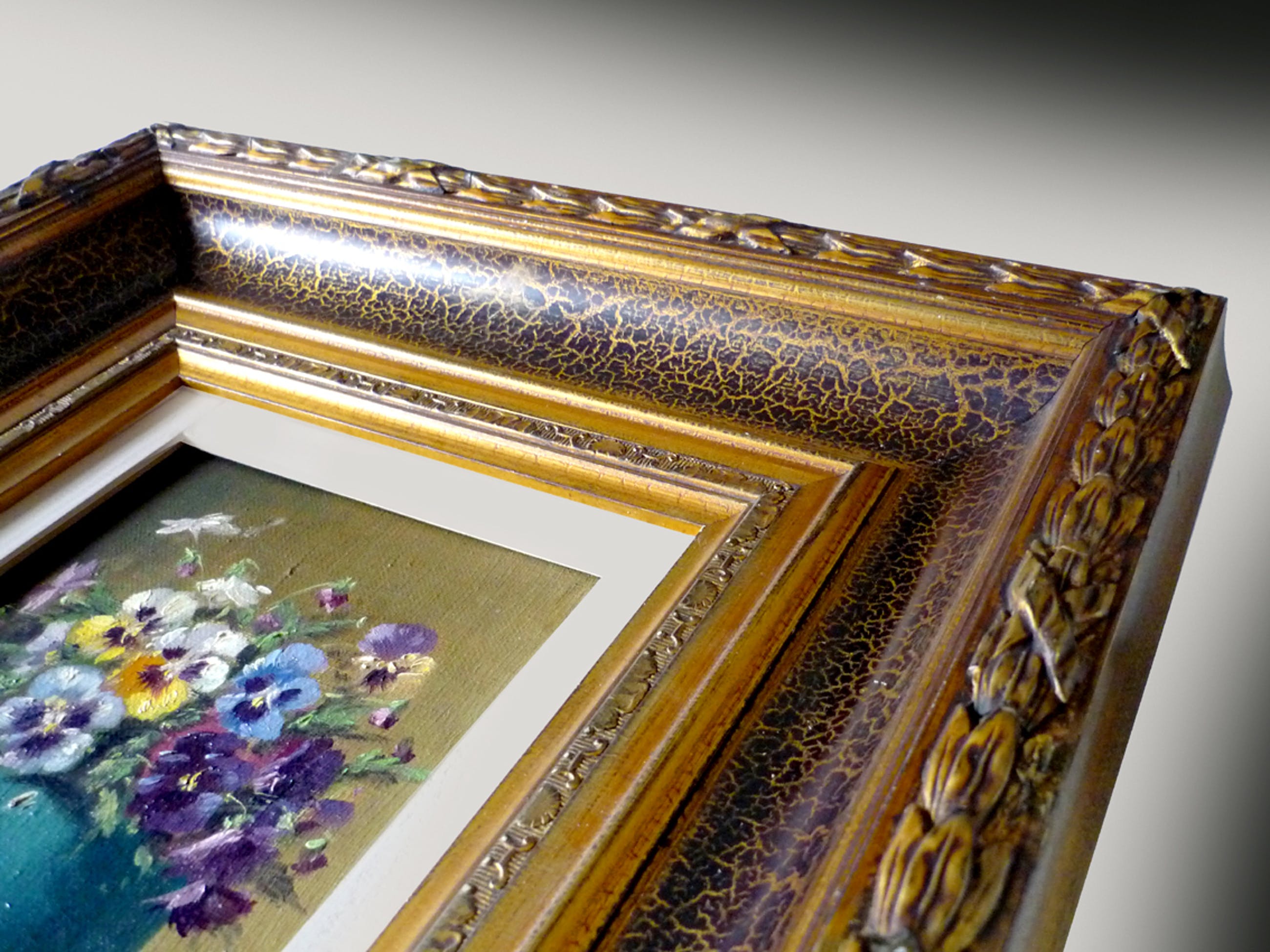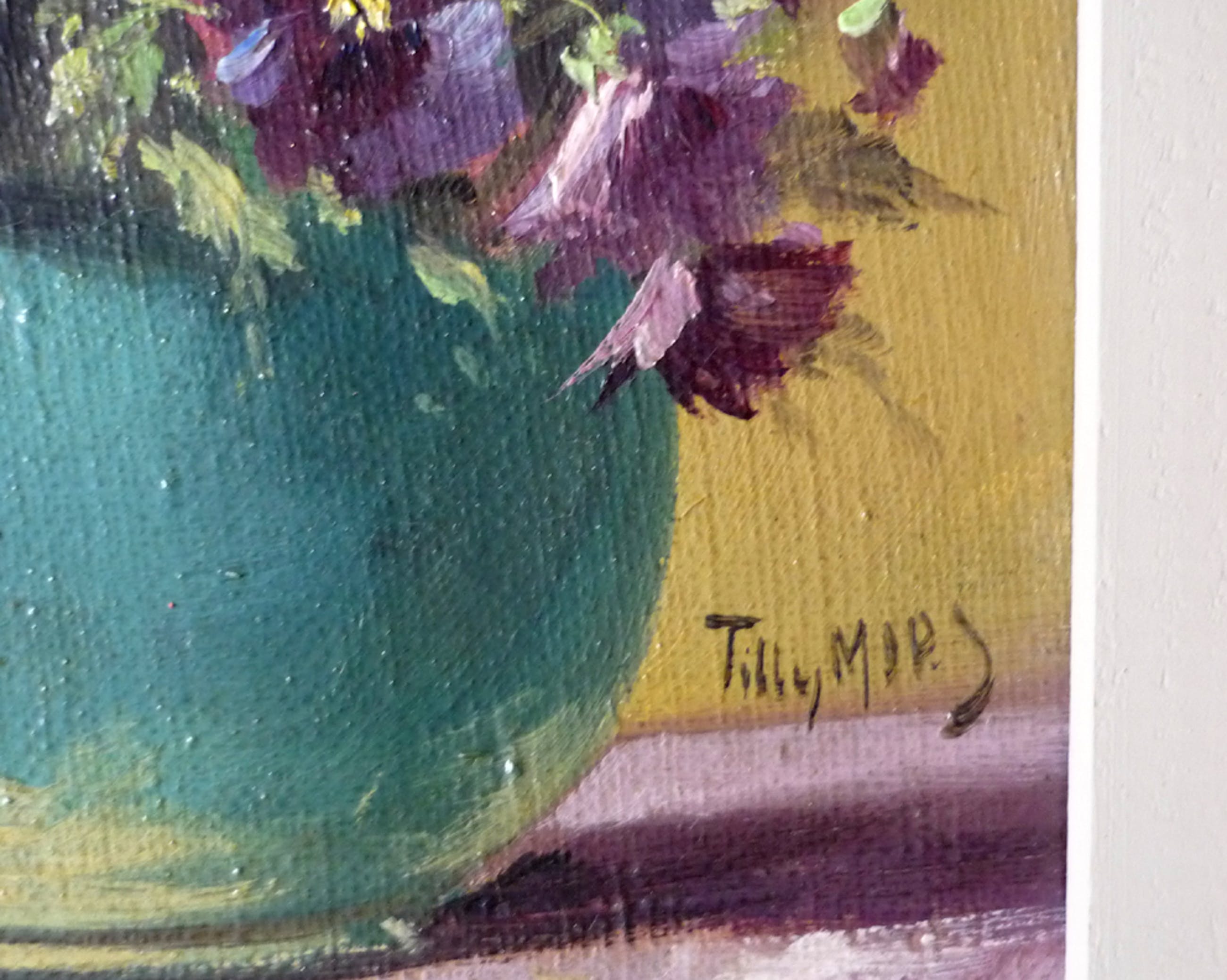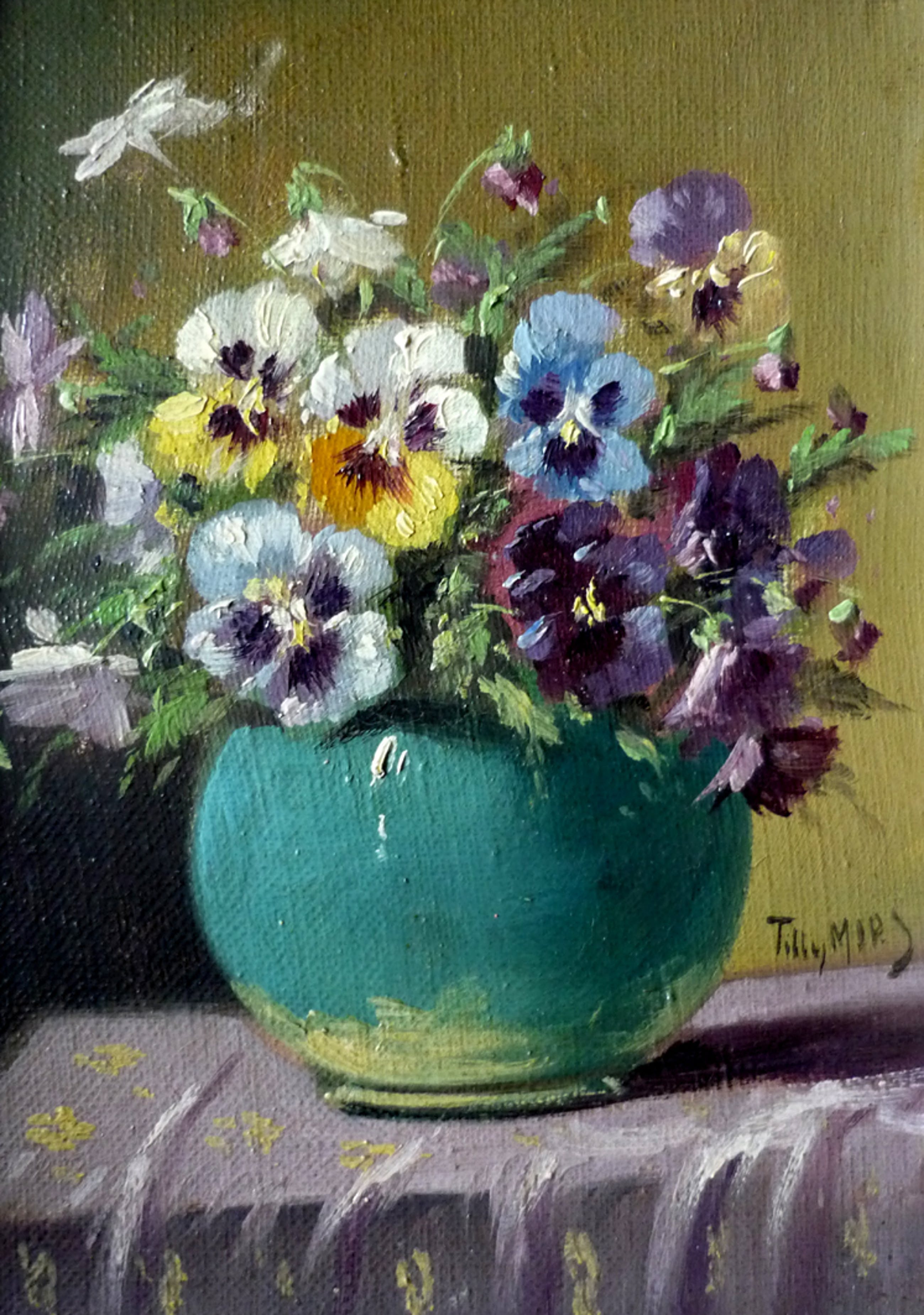 Een mooi geschilderd bloementafereel. Viooltjes vallen altijd erg in de smaak. Het is een boeketje viooltjes in mooi coloriet.
