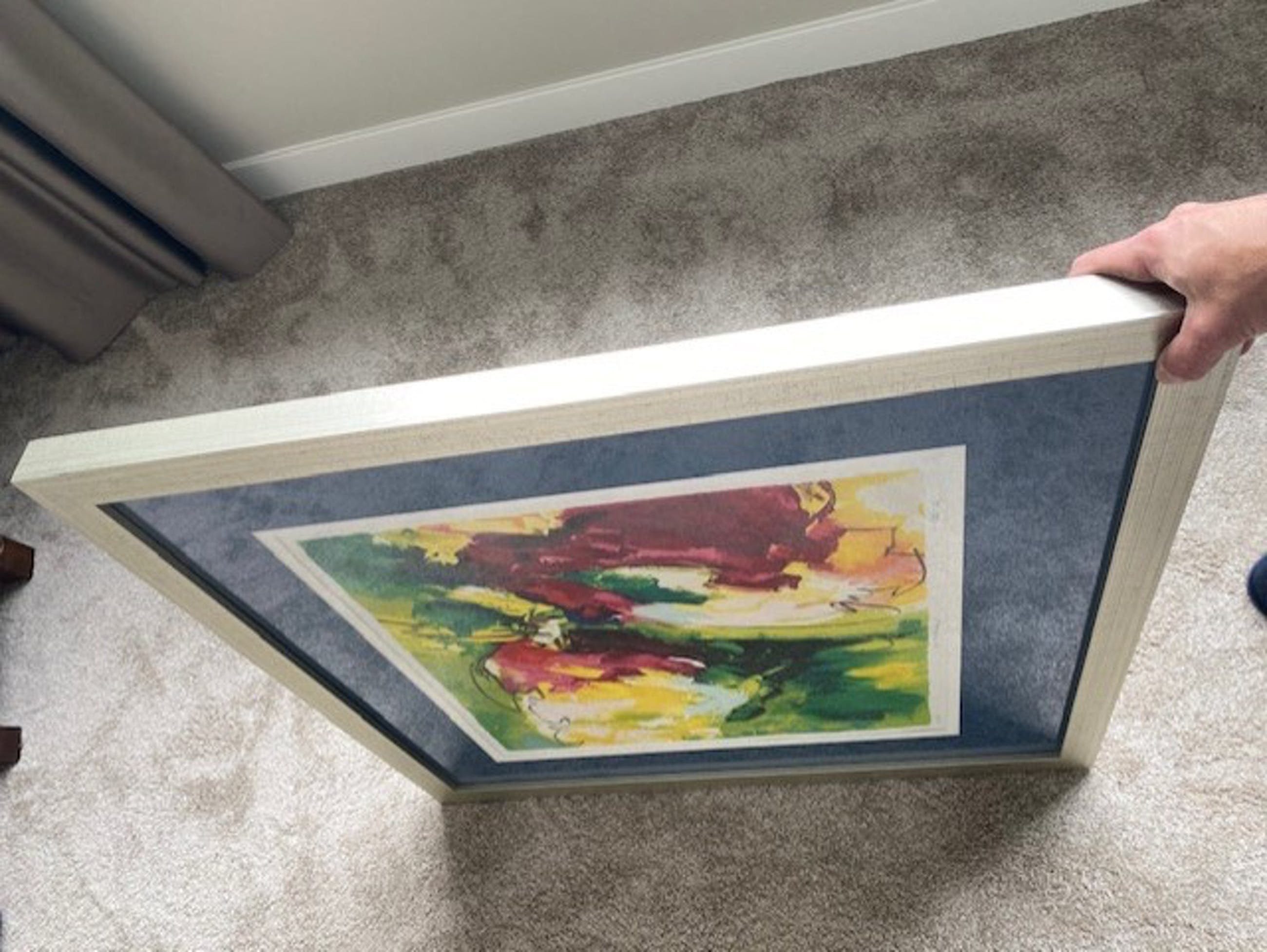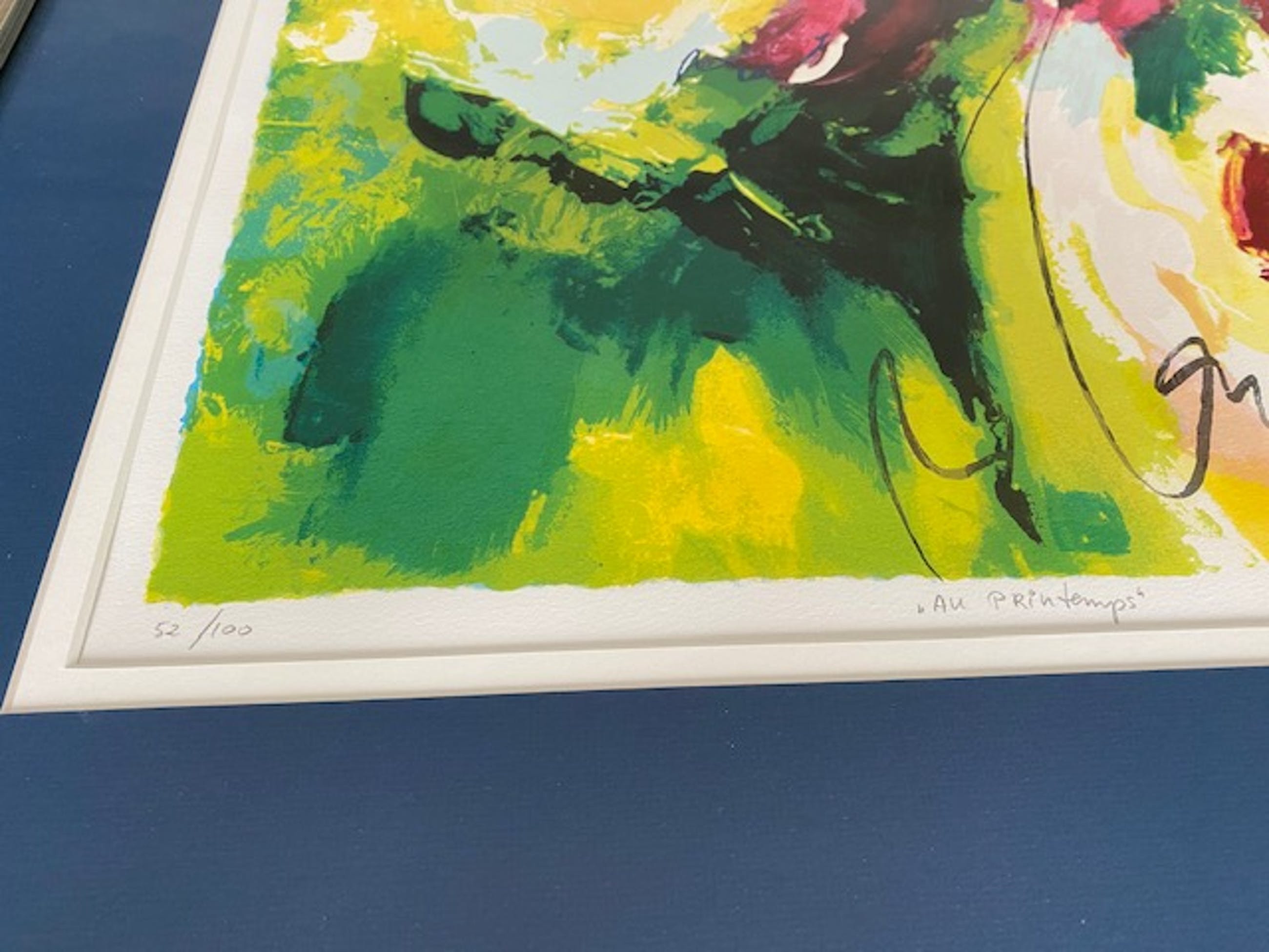 Zeefdruk "au printemps"van Tilly Wils. Oplage 52/100. Afmeting zeefdruk 55 x 55cm in een passe-partout van 58 x 58cm. Het frame van de bronskleurige lijst is 4cm dik en heeft een afmeting van 87cm hoog en 83cm breed. Aan de achterkant is de lijst voorzien van een gladde afdekplaat met stevig ophangmechanisme. Door verhuizing overbodig.