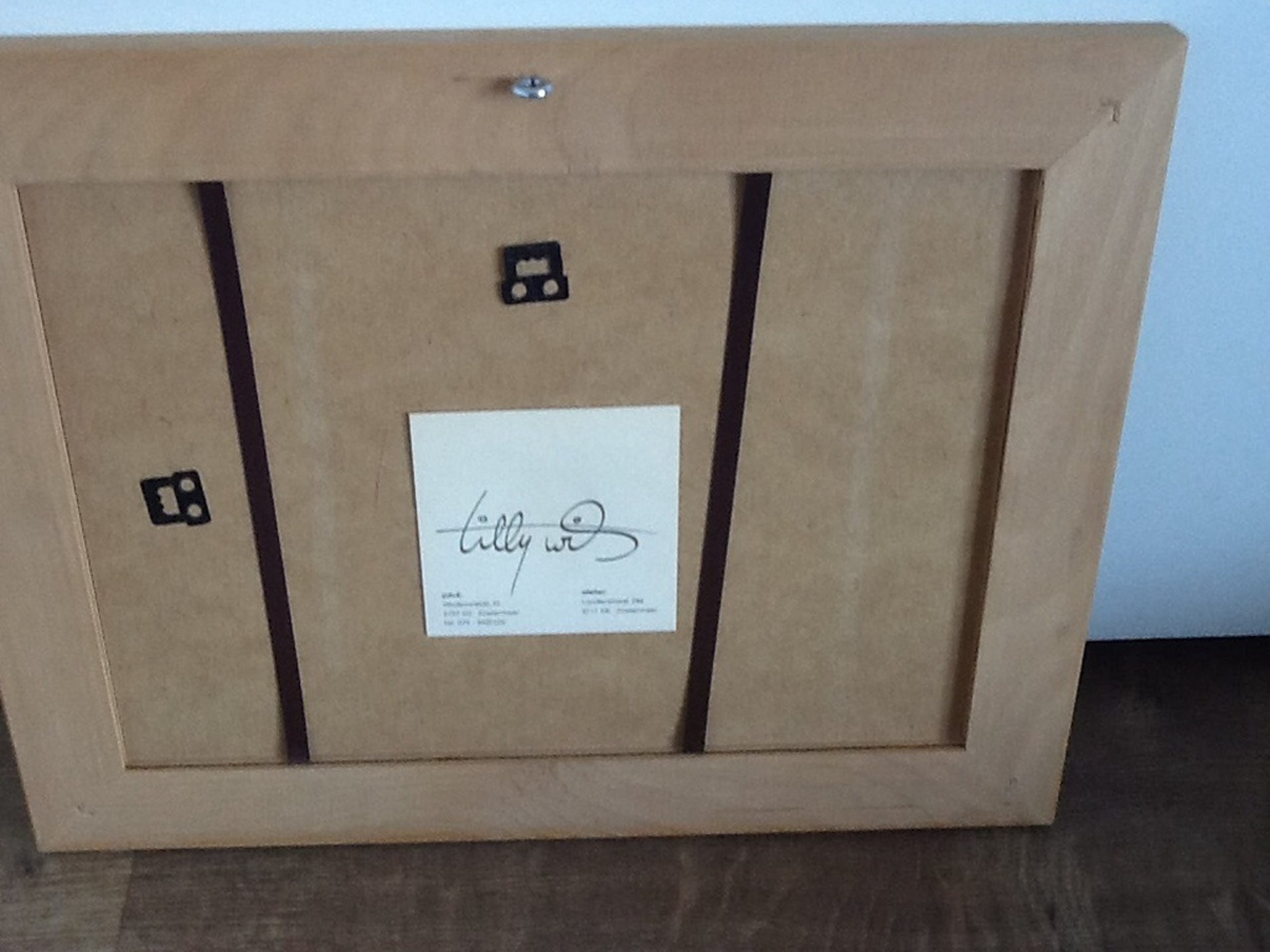 Gouache van Tilly Wils. Titel : Door de bomen het bos. Gesigneerd : Ja, op de achterzijde. Ingelijst : Ja, met houten lijst. Afmetingen : Blad 35 x 27 cm en beeld 17 x 12 cm.