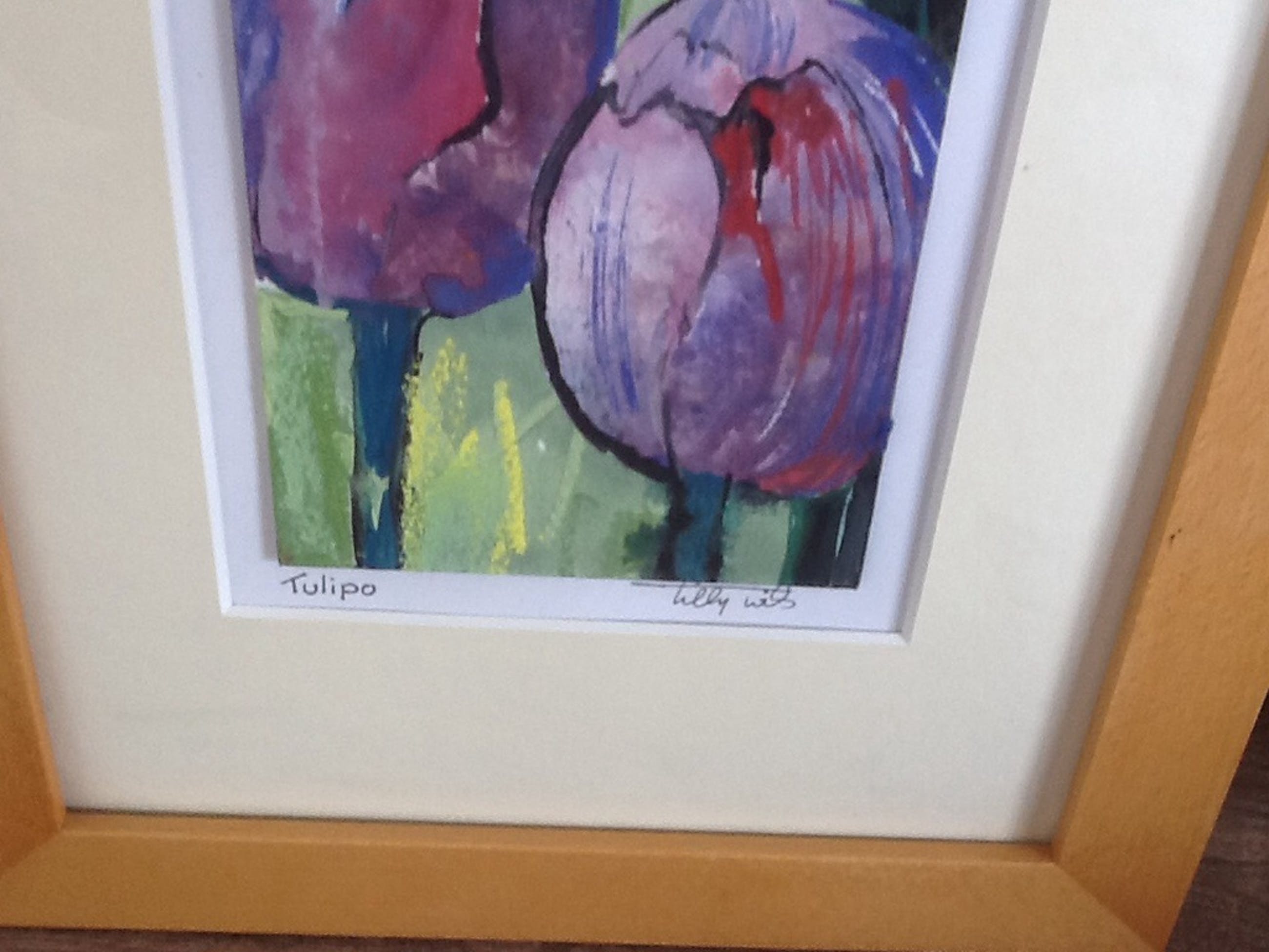Gouache van Tilly Wils. Titel : Tulipo. Ingelijst : Ja, met houten lijst. Gesigneerd : Ja, r.o. met potlood en ook op de achterzijde. Maten : Blad 32 x 24 cm en beeld 17 x 12 cm.