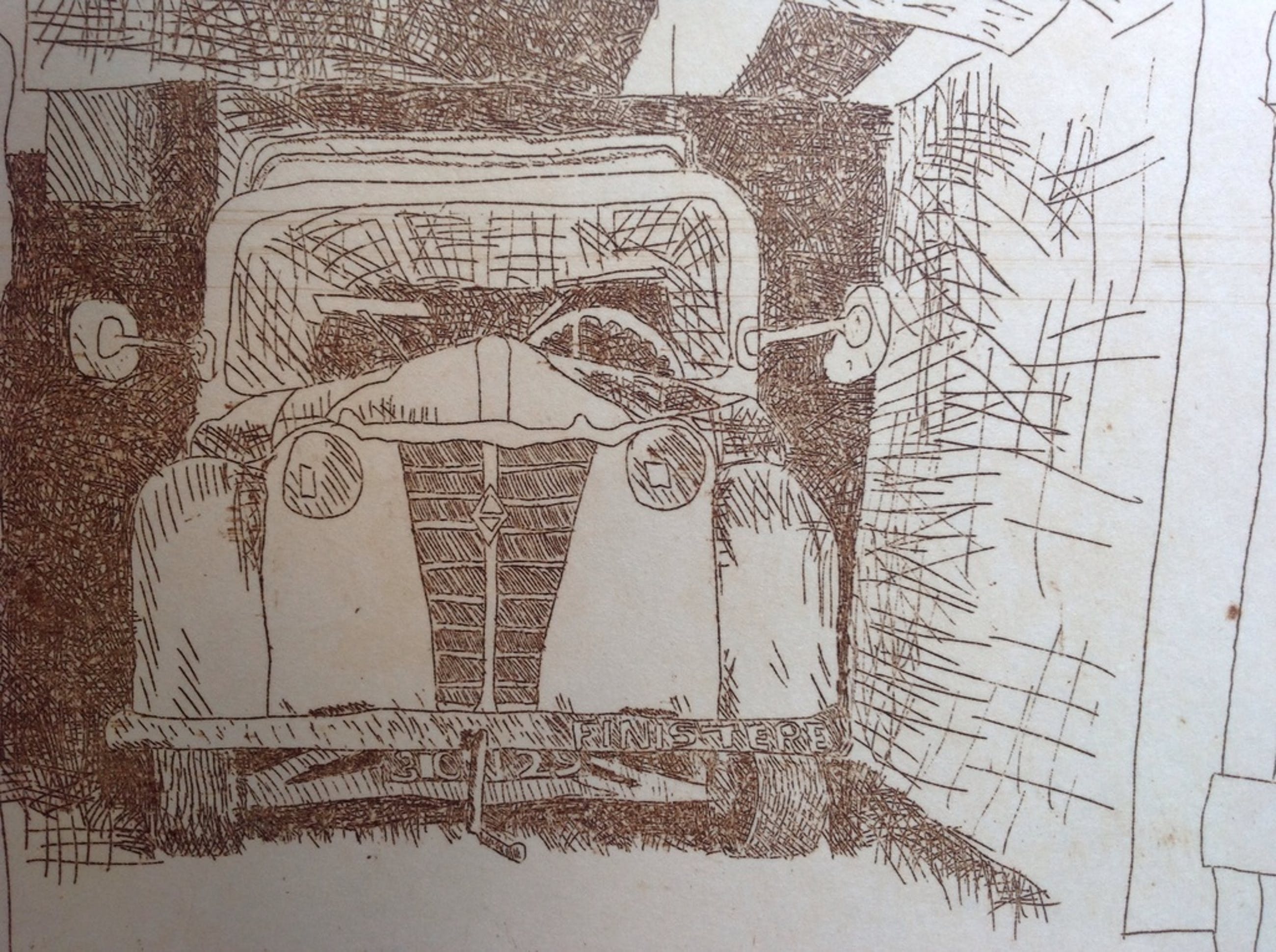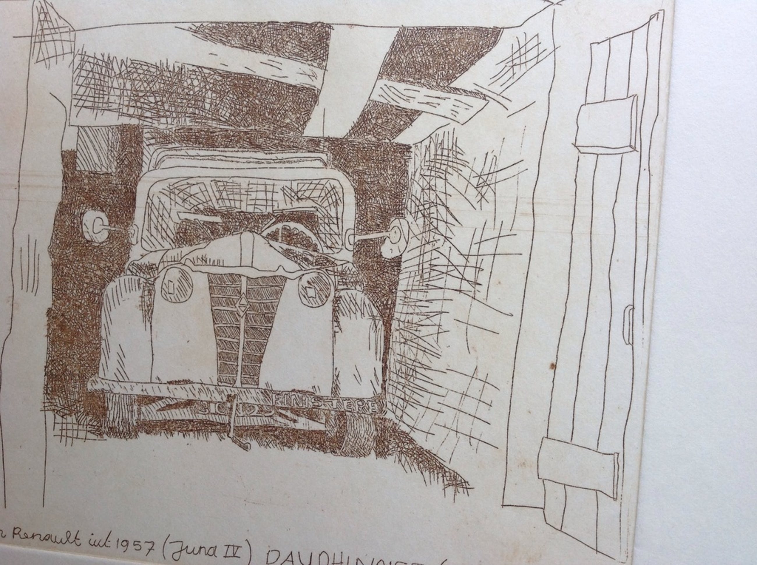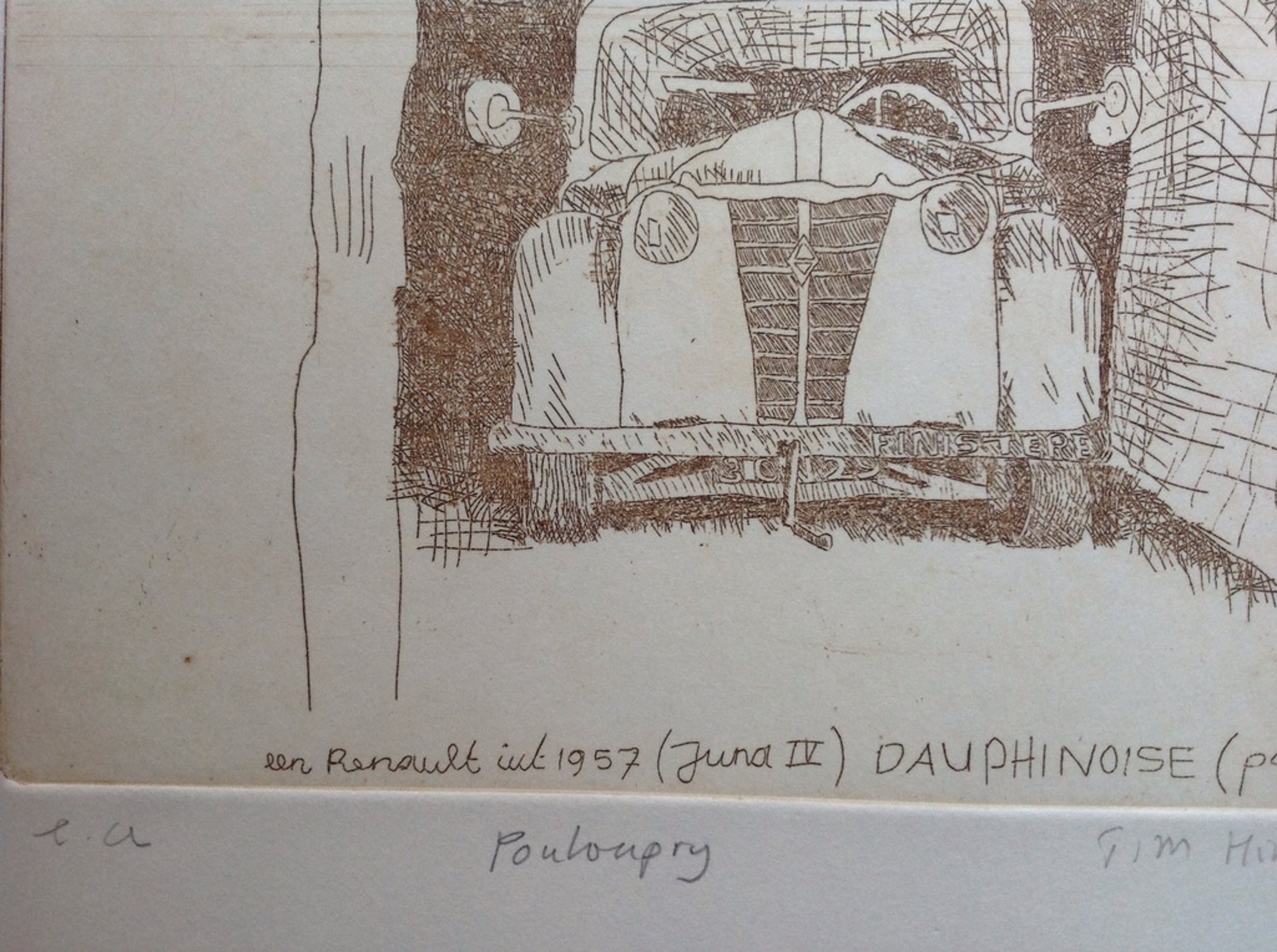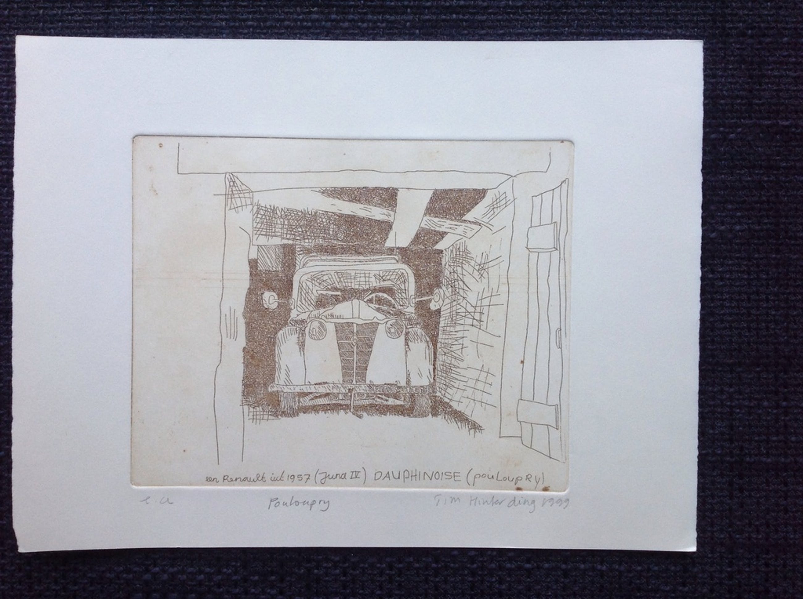 Een ets afdruk , eigen afdruk met als titel Pouloupry , op de afbeelding is te zien een schuur vondst van een Renault Juvaquarte uit 1957 op de ets vermeld tevens Dauphinoise.
