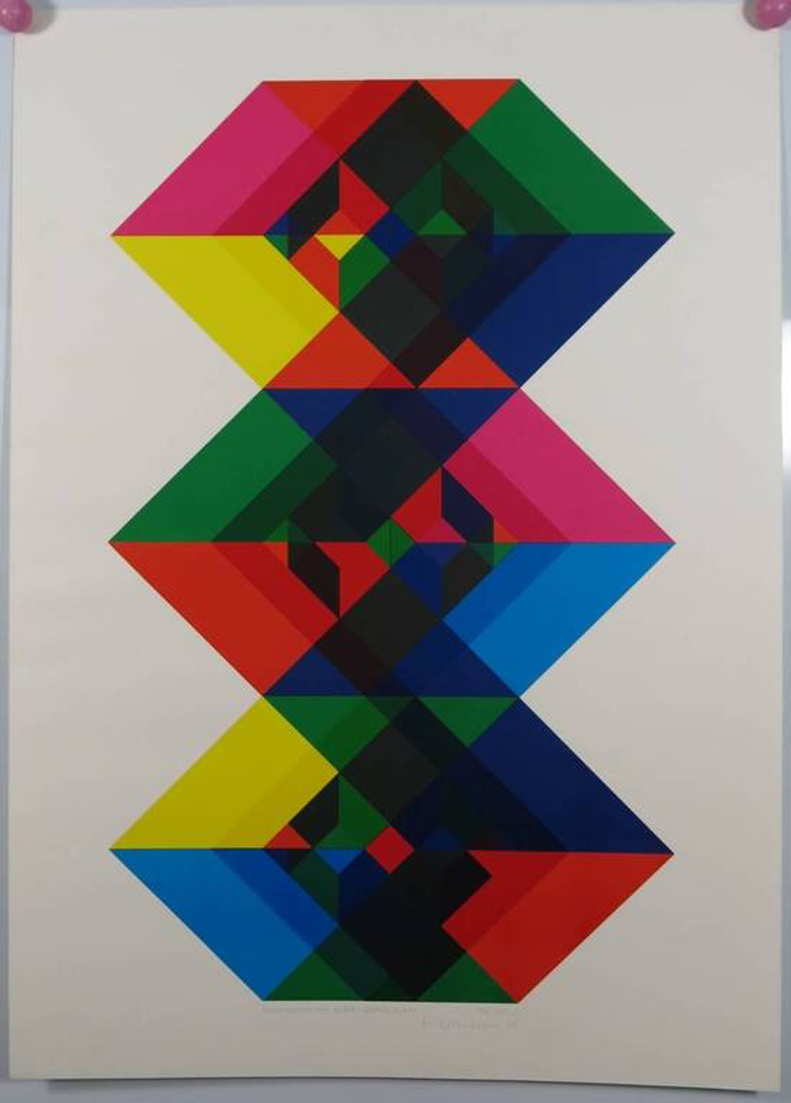 In goede staat, maar met een zeer klein krasje links ponder in de groene driehoek en lichte golving aan de linker rand van het blad buiten het beeld, ingelijst nauwelijks zichtbaar.