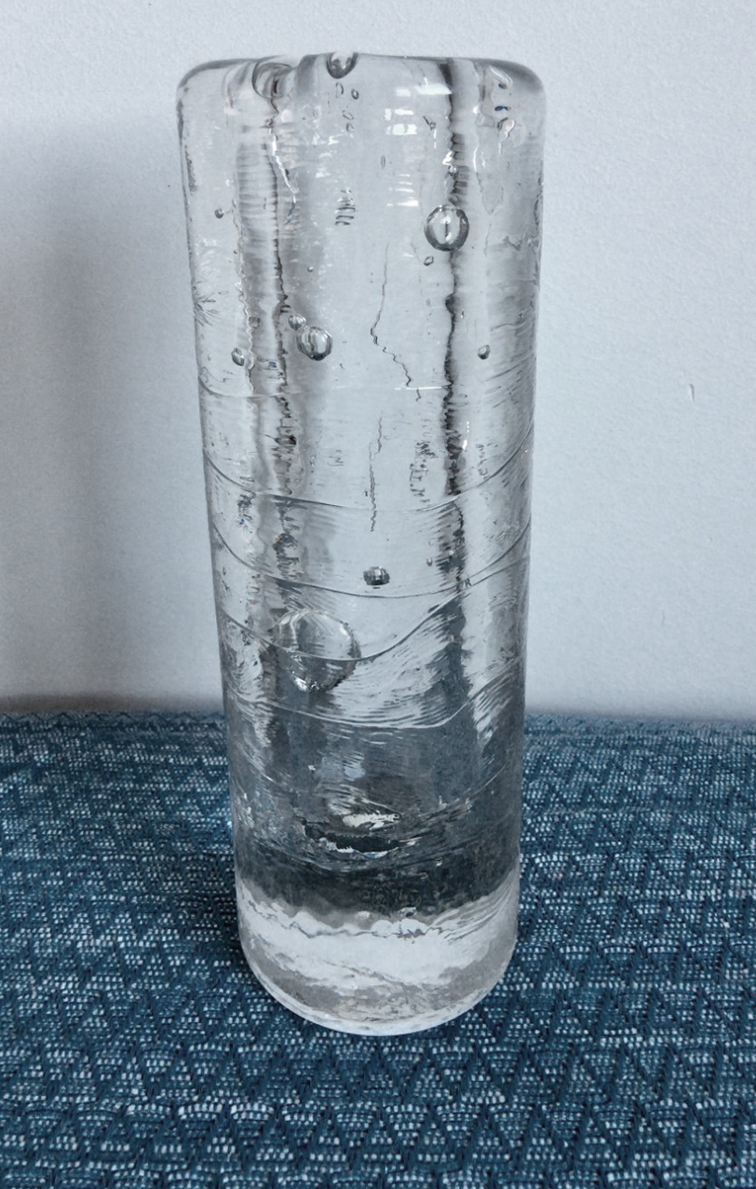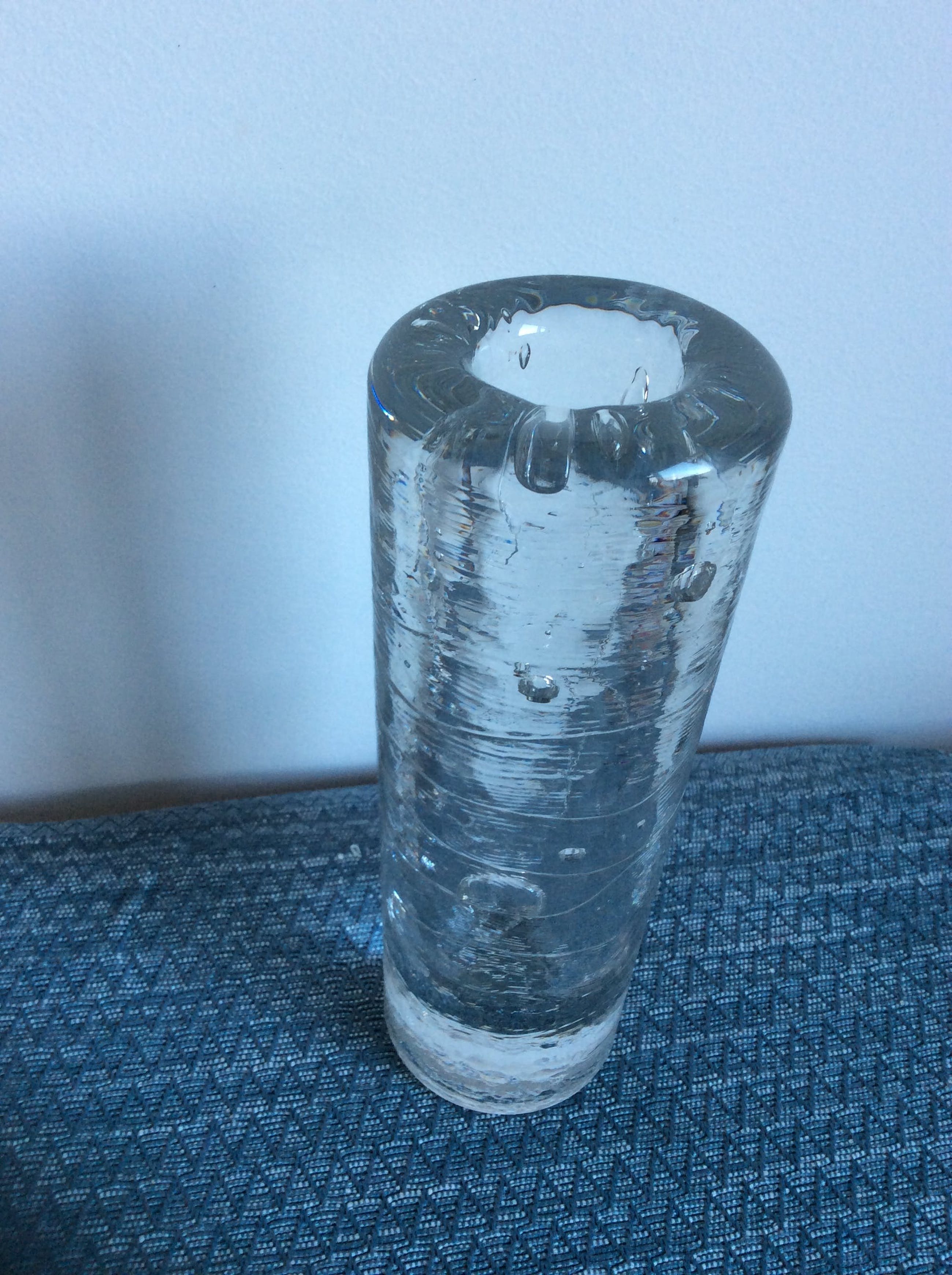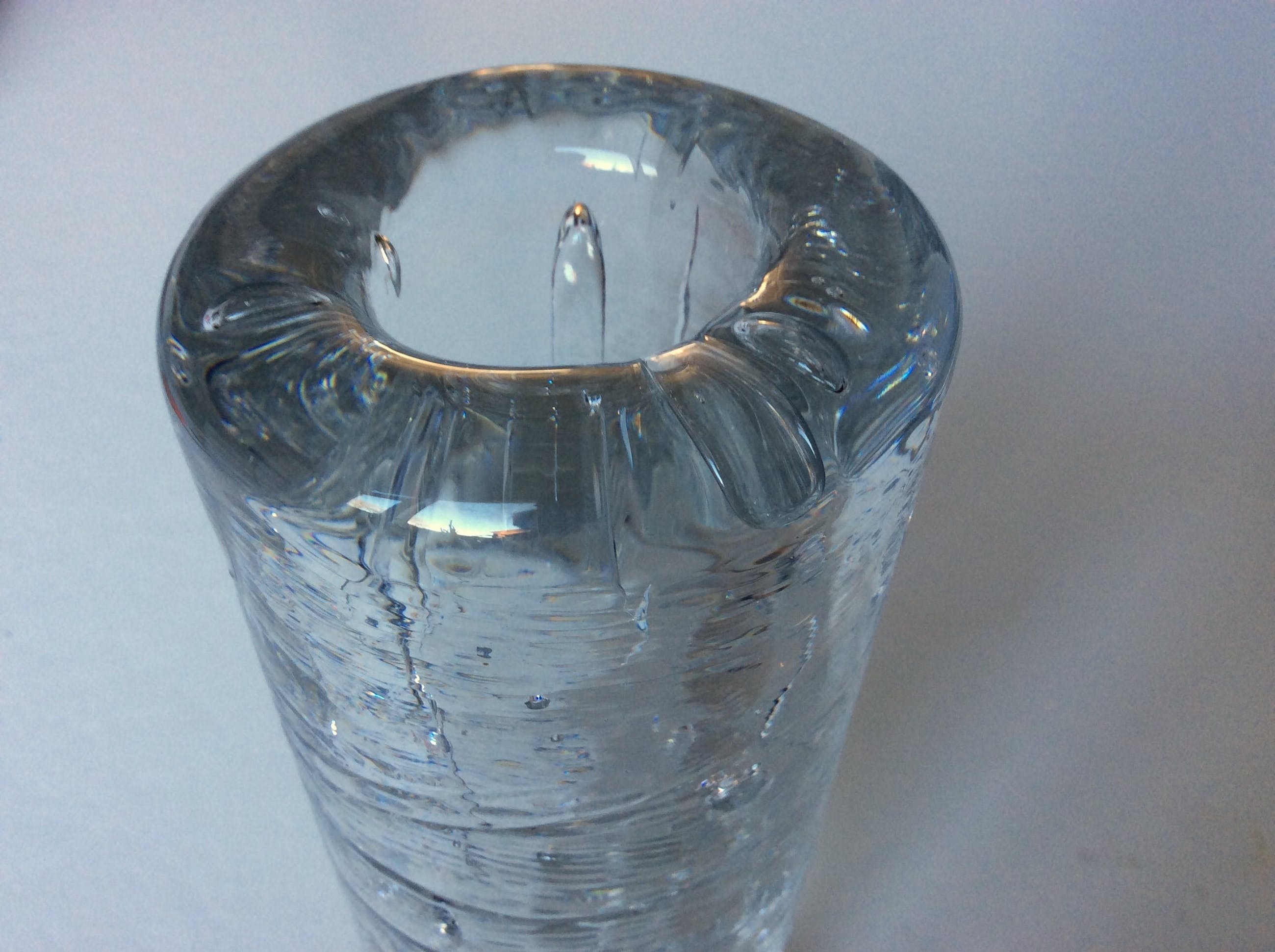 Uit de reeks ‘Arkipelago’ van Timo Sarpaneva - fraai massief glasobject met diverse luchtbellen in fijn horizontaal lijntjes spectrum, ca 1975.Hoogte 20,5 cm, max doorsnede 7 cm. Gewicht 1655 gram.Niet gesigneerd, in prima conditie, mooi helder glas.