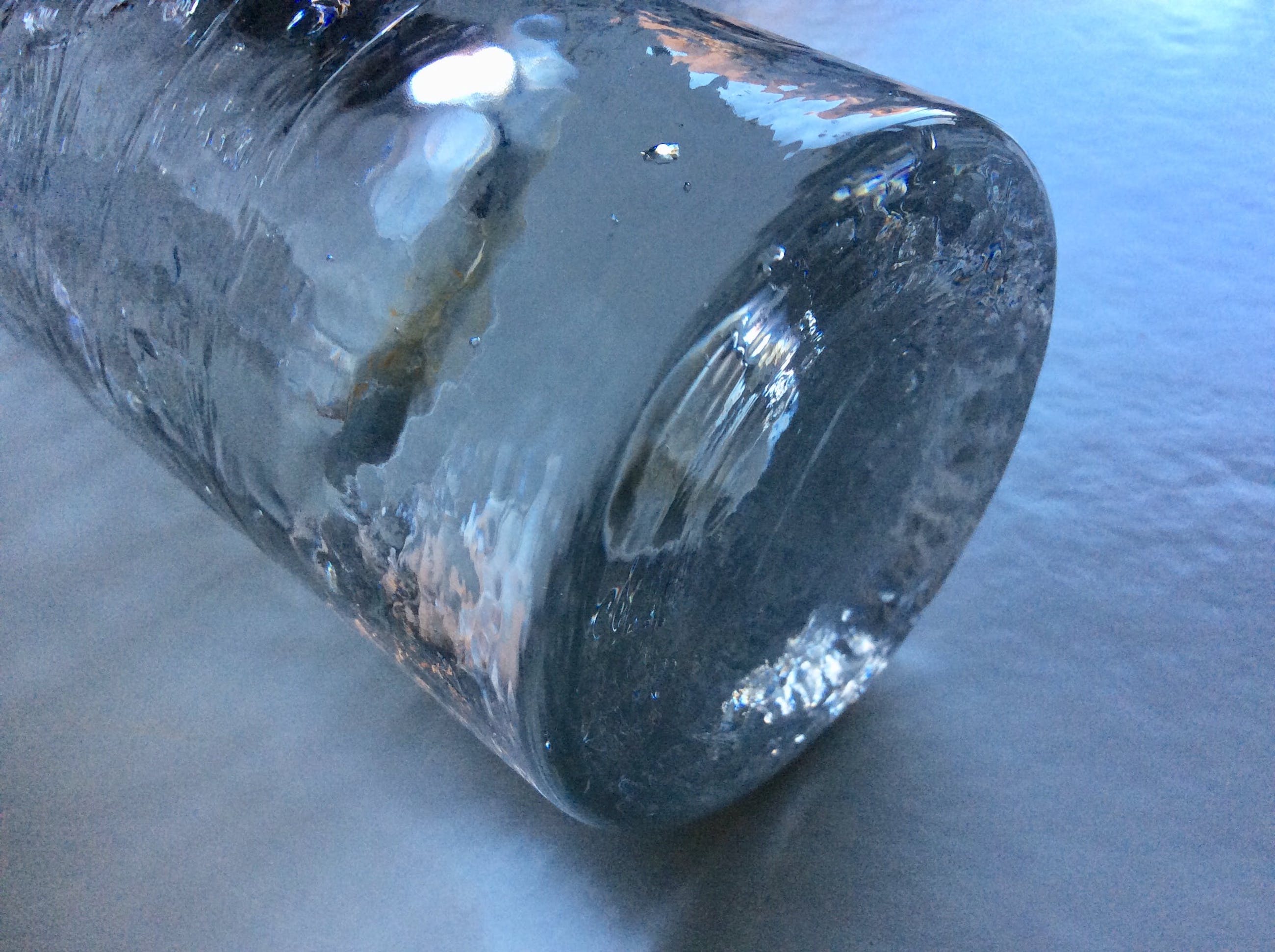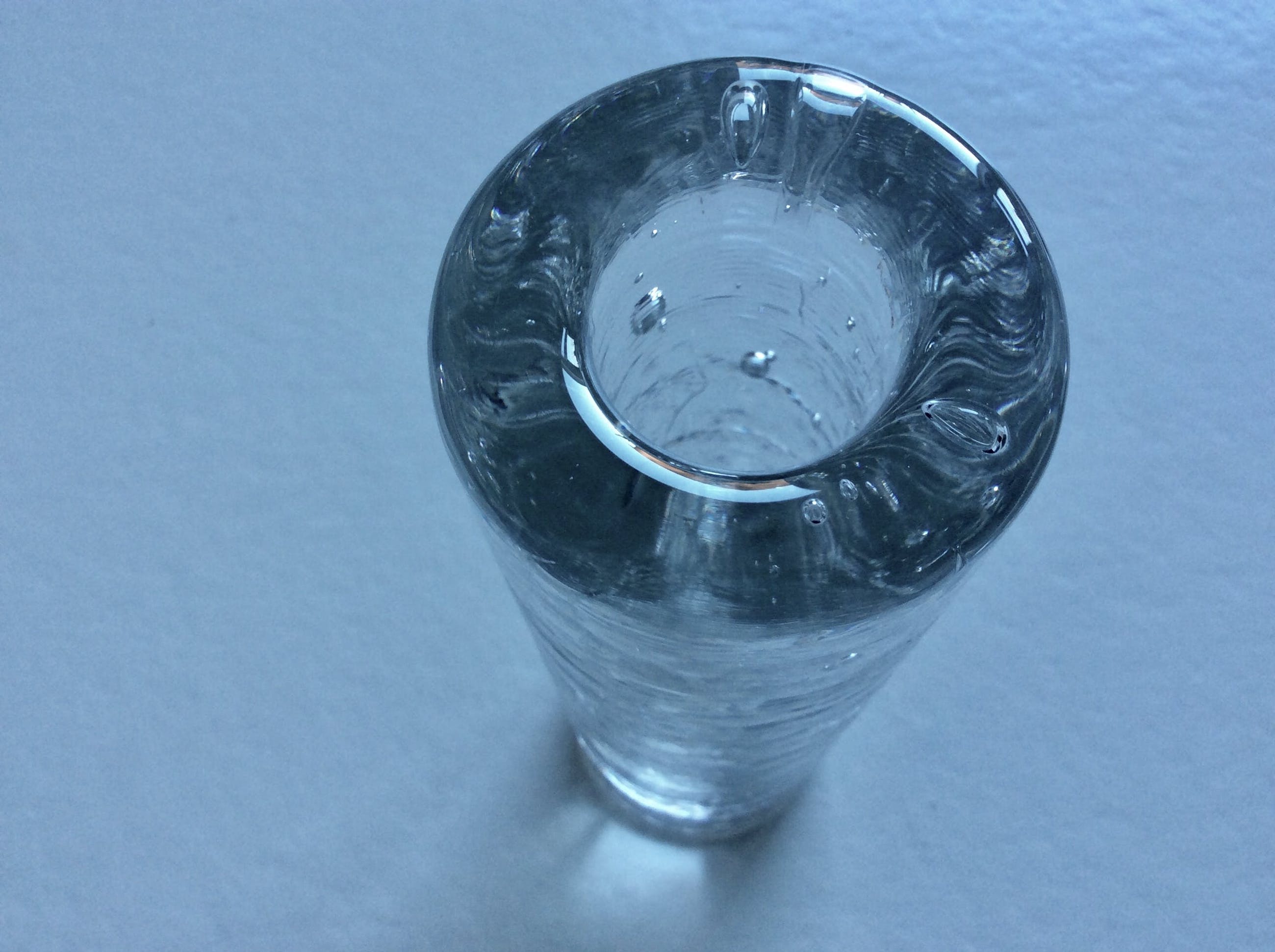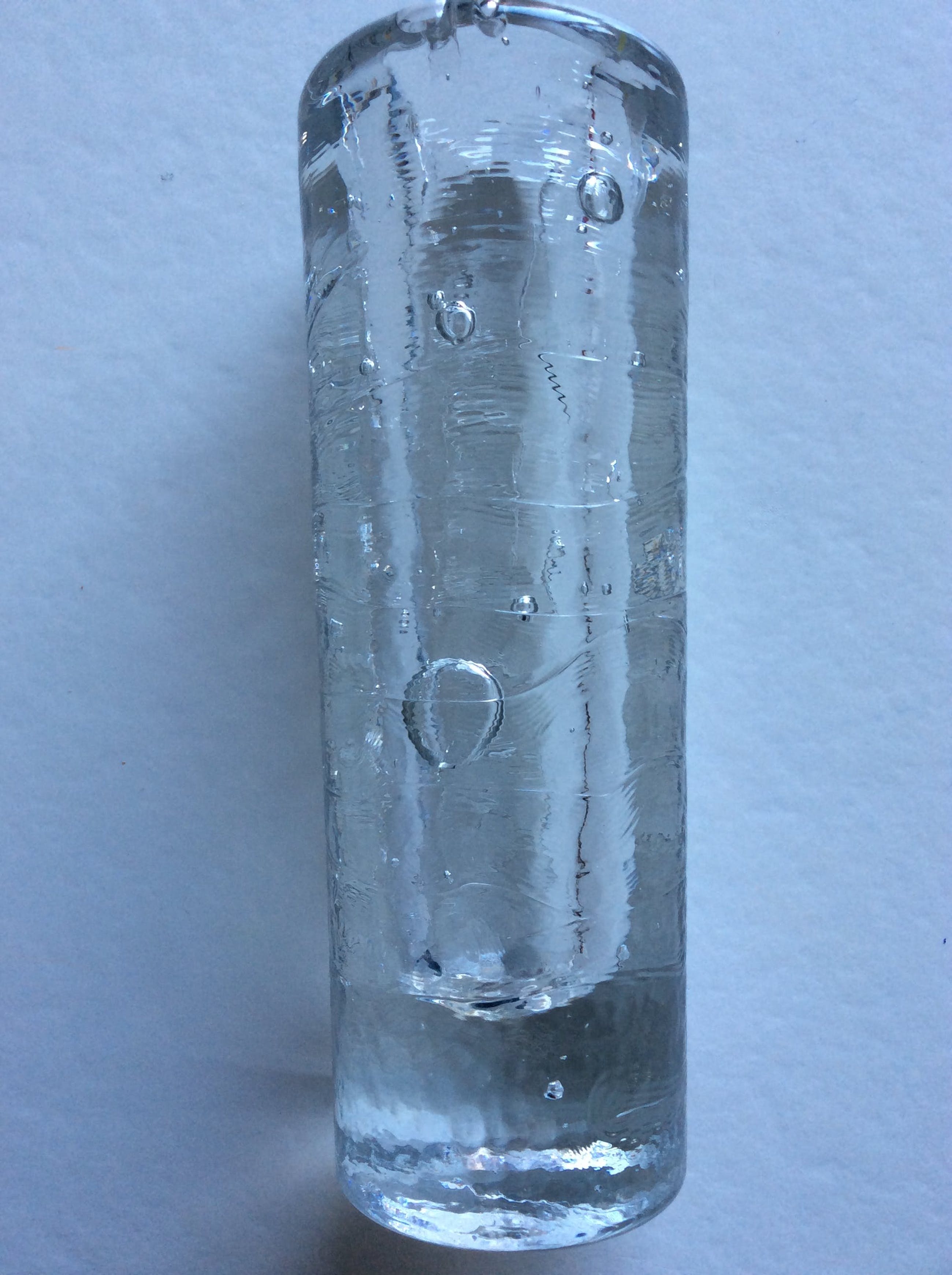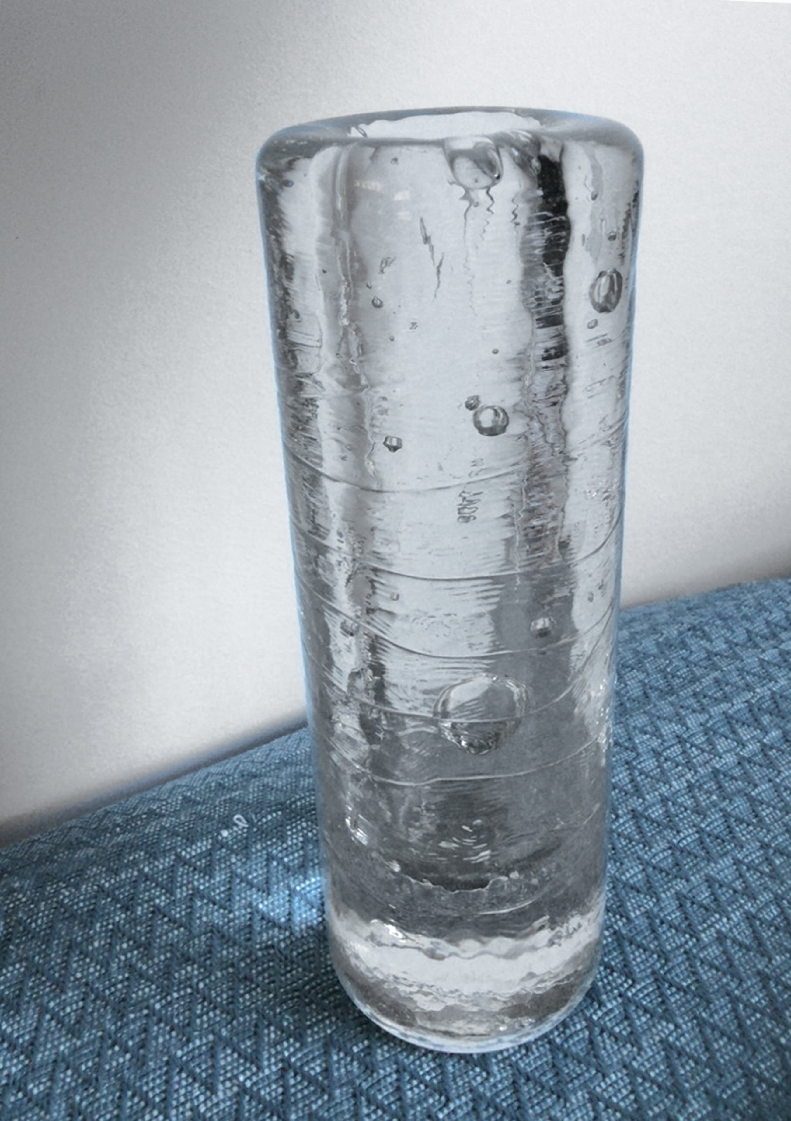 Uit de reeks ‘Arkipelago’ van Timo Sarpaneva - fraai massief glasobject met diverse luchtbellen in fijn horizontaal lijntjes spectrum, ca 1975.Hoogte 20,5 cm, max doorsnede 7 cm. Gewicht 1655 gram.Niet gesigneerd, in prima conditie, mooi helder glas.