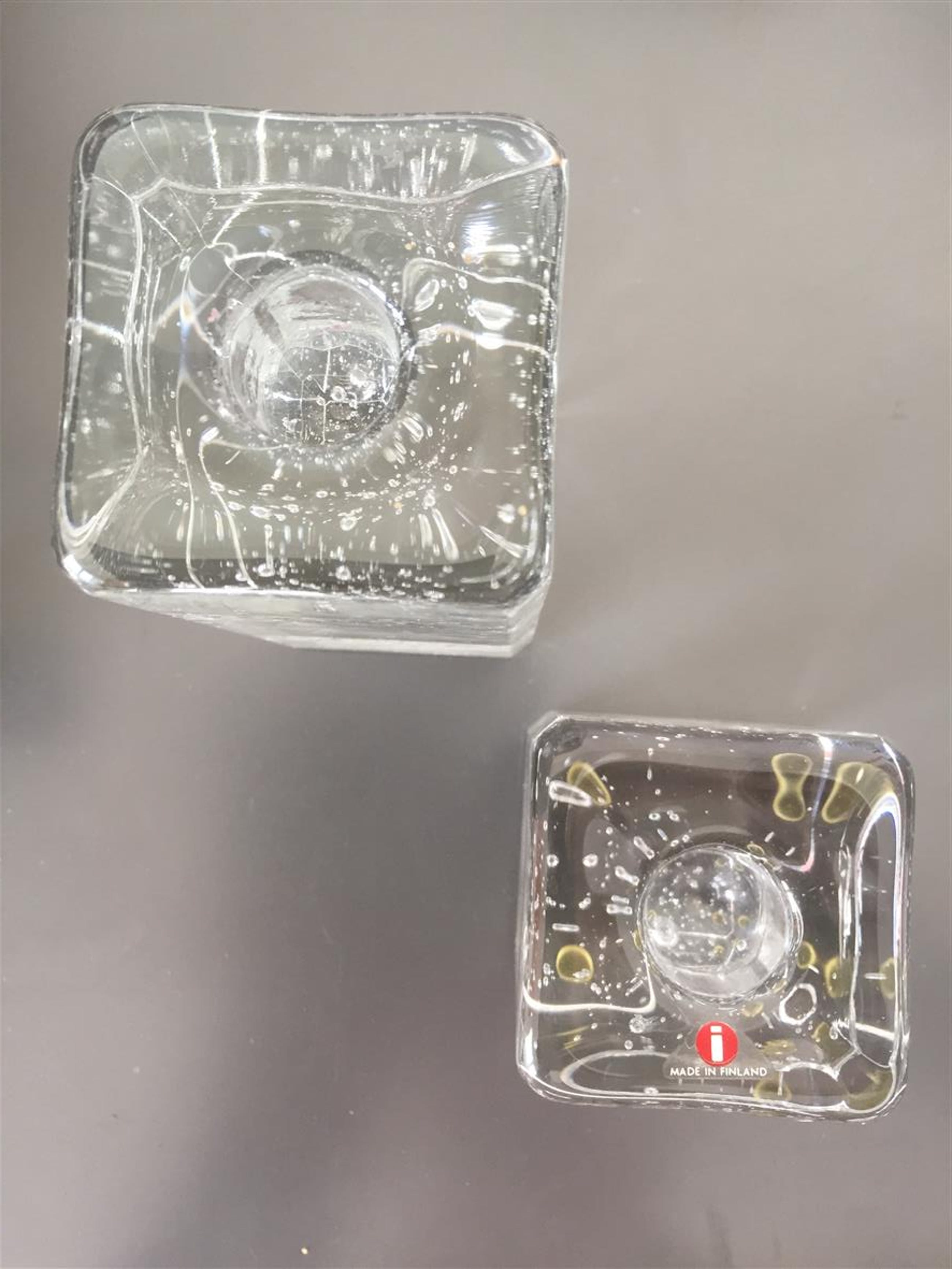 Kandelaars in zwaar Fins glas met de typische "vingerafdruk" van Sarpaneva Eerste: 1,1 kg en 13 cm hoog Tweede : 700 gr en 8 cm hoog.