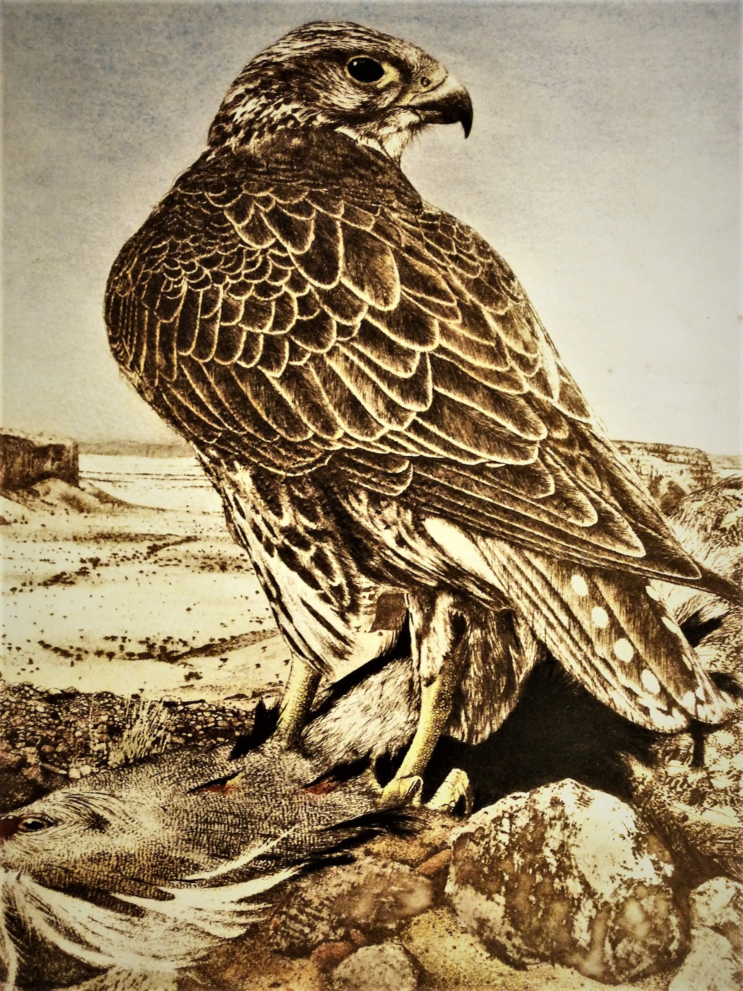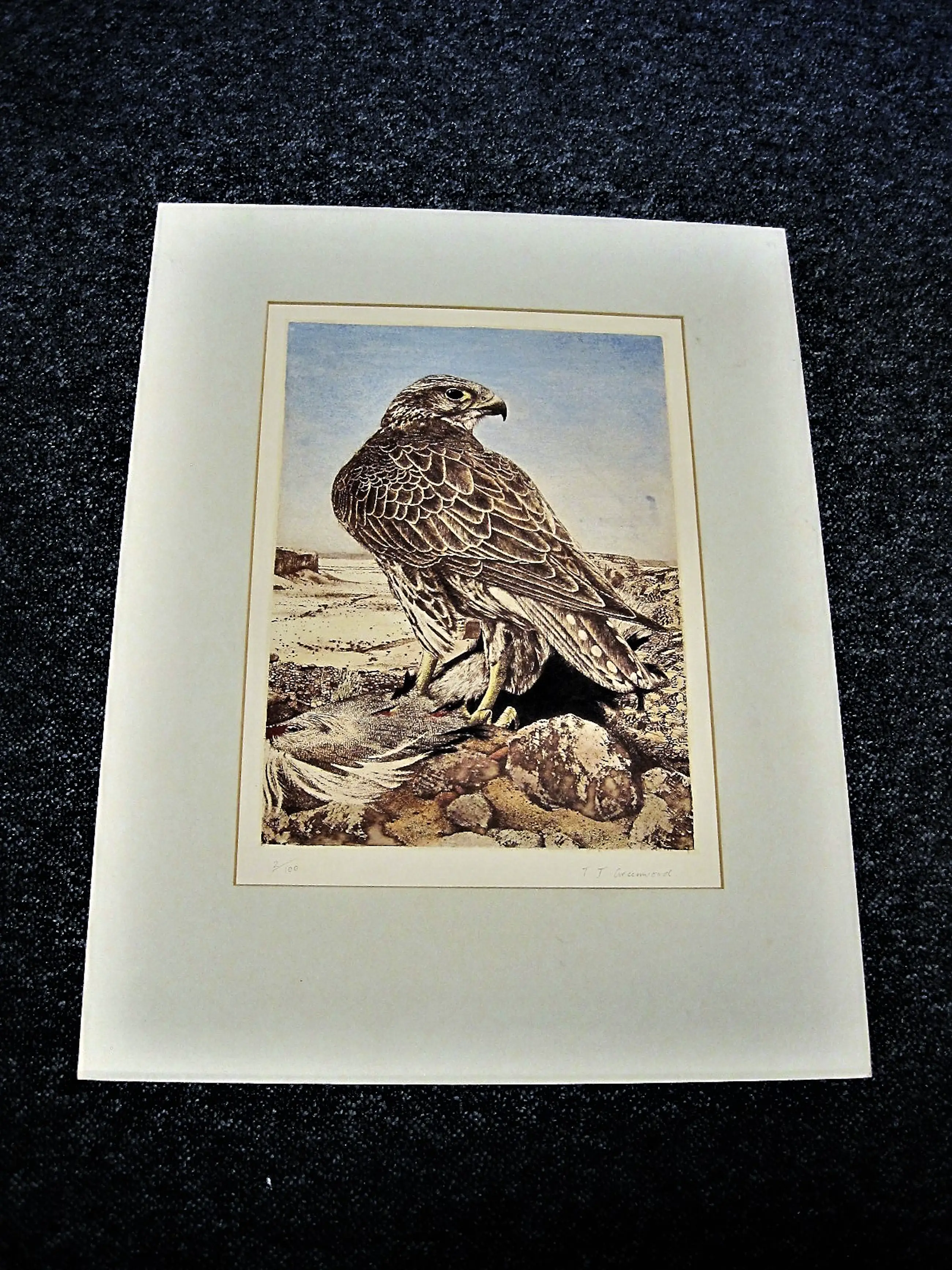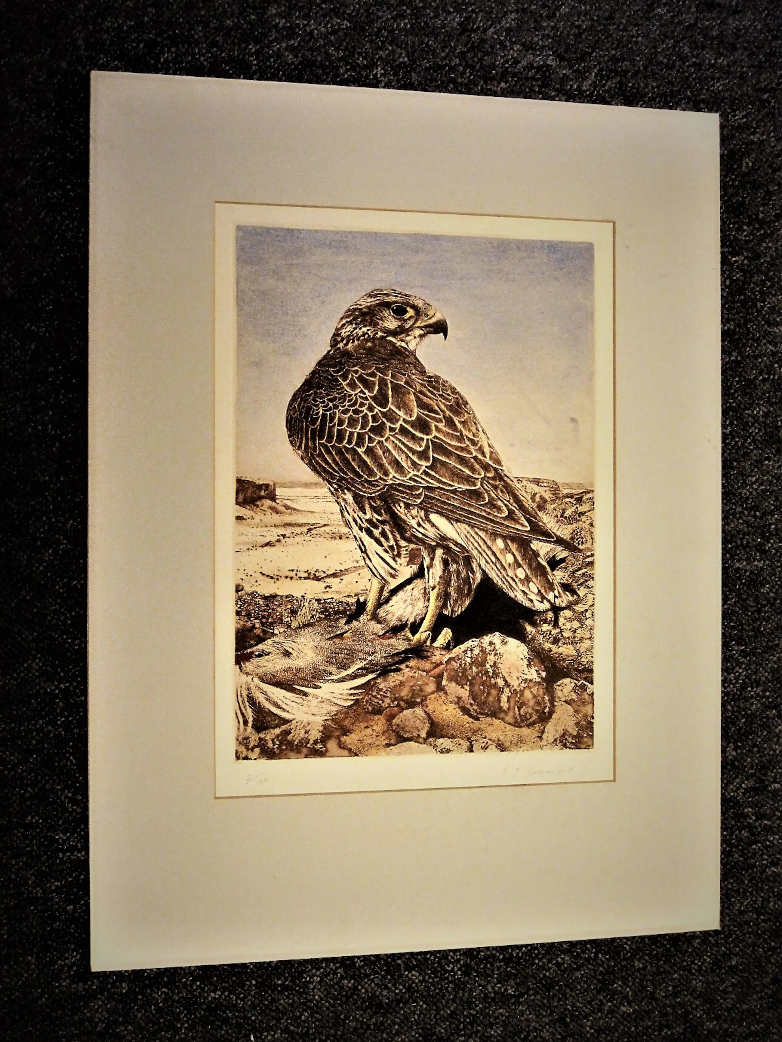 Fraaie, gedetailleerde handgekleurde ETS van een havik met zijn prooi. Zowel in de plaat alsook potloodgesigneerd en genummerd (2/100). Bladmaat 33x24 (HxB). In passe partout - niet ingelijst.