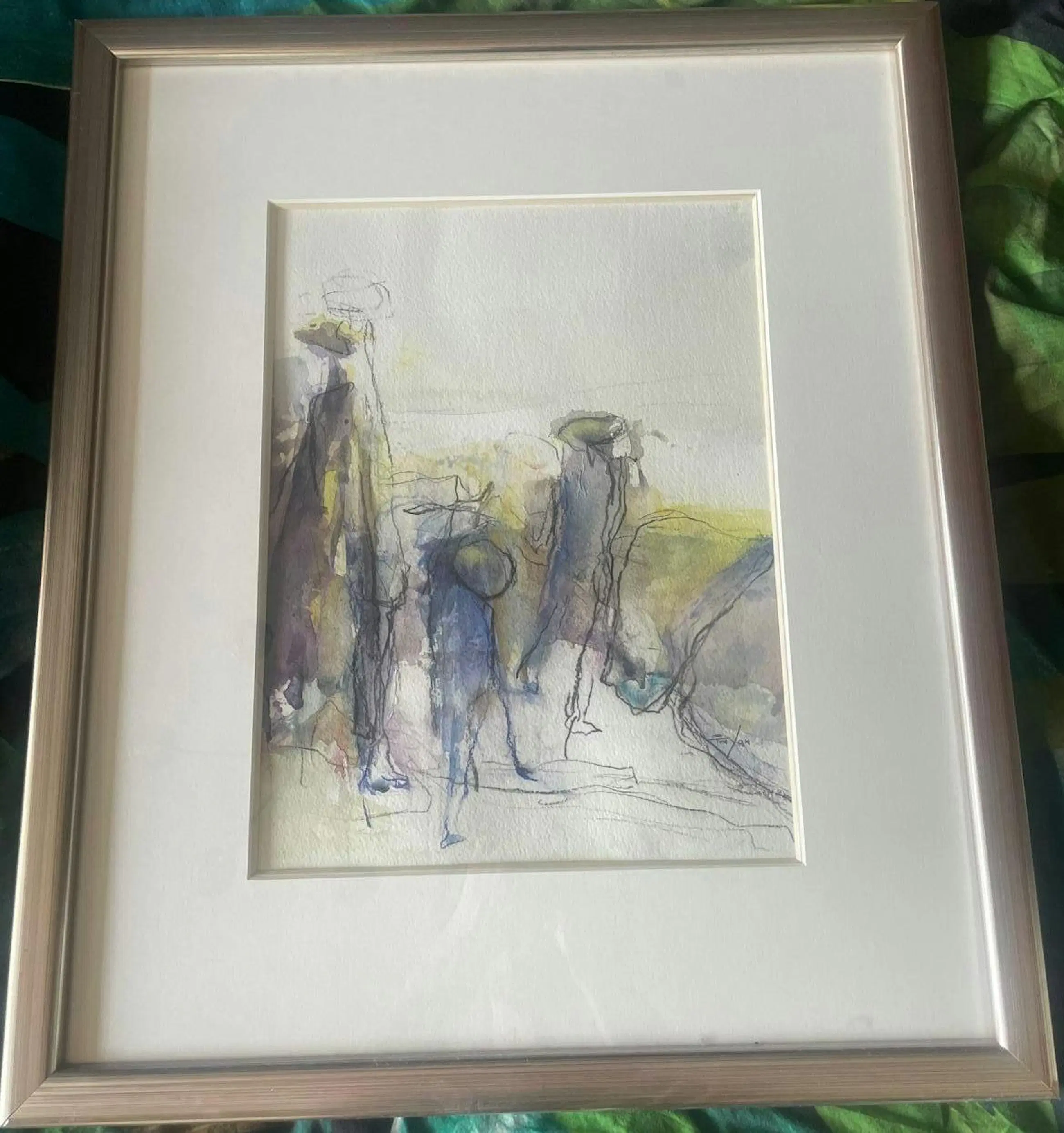 Dit kunstwerk, uitgevoerd in aquarel op papier, toont een abstracte weergave van menselijke figuren. De figuren zijn vaag en schetsmatig weergegeven, met vloeiende lijnen en zachte kleurovergangen in tinten blauw, paars en geel. De compositie suggereert beweging en interactie tussen de figuren, wat het werk een dynamisch en expressief karakter geeft.
