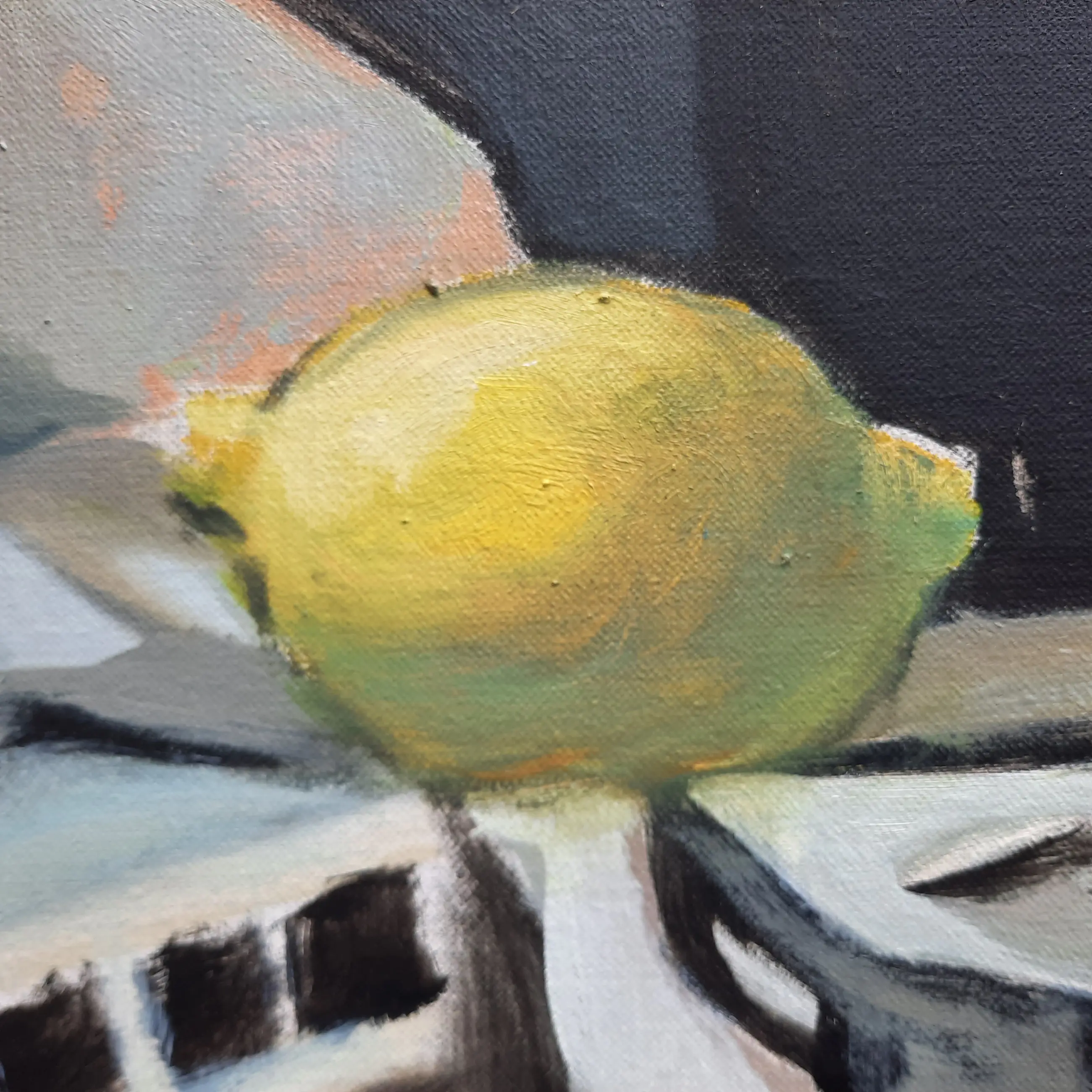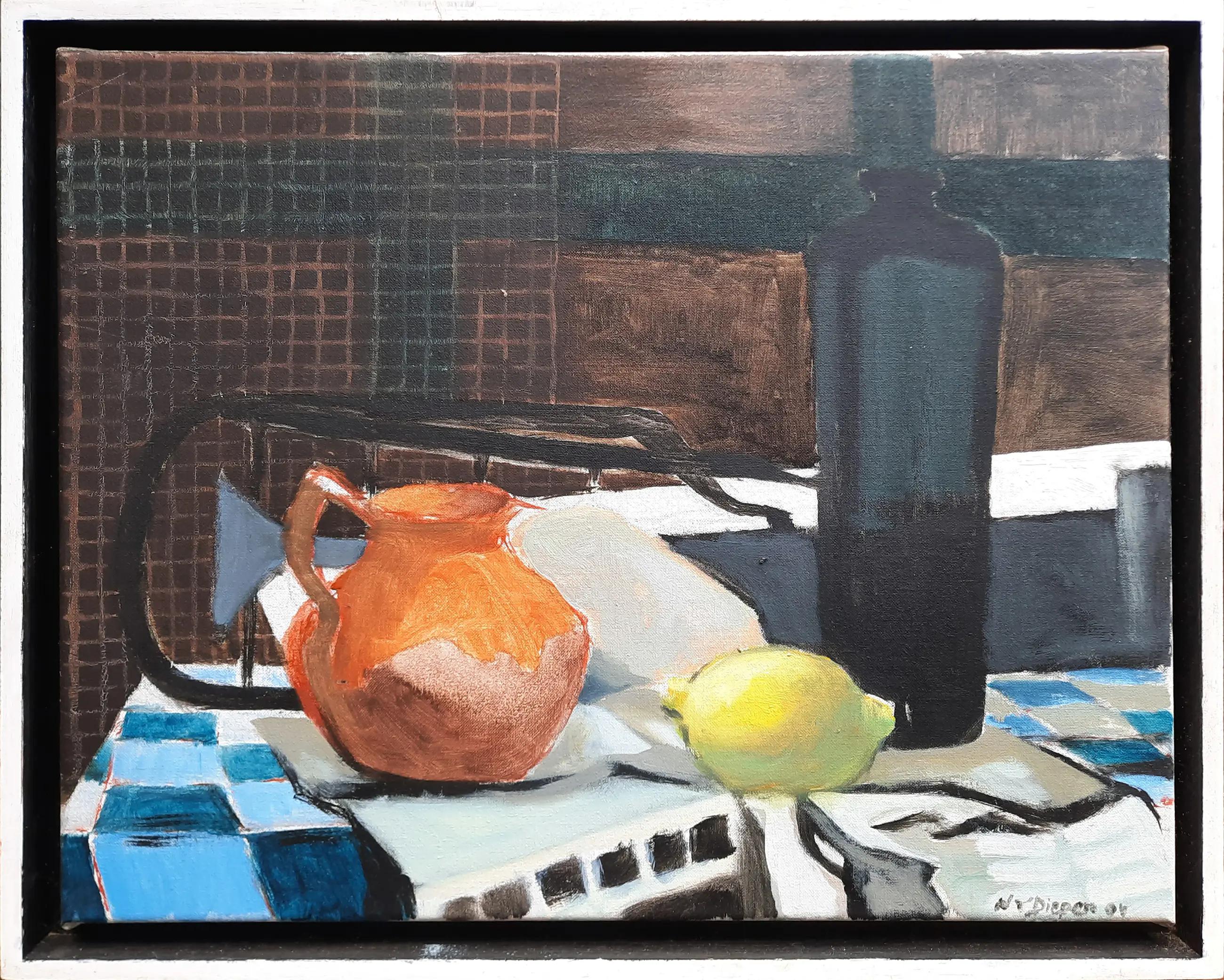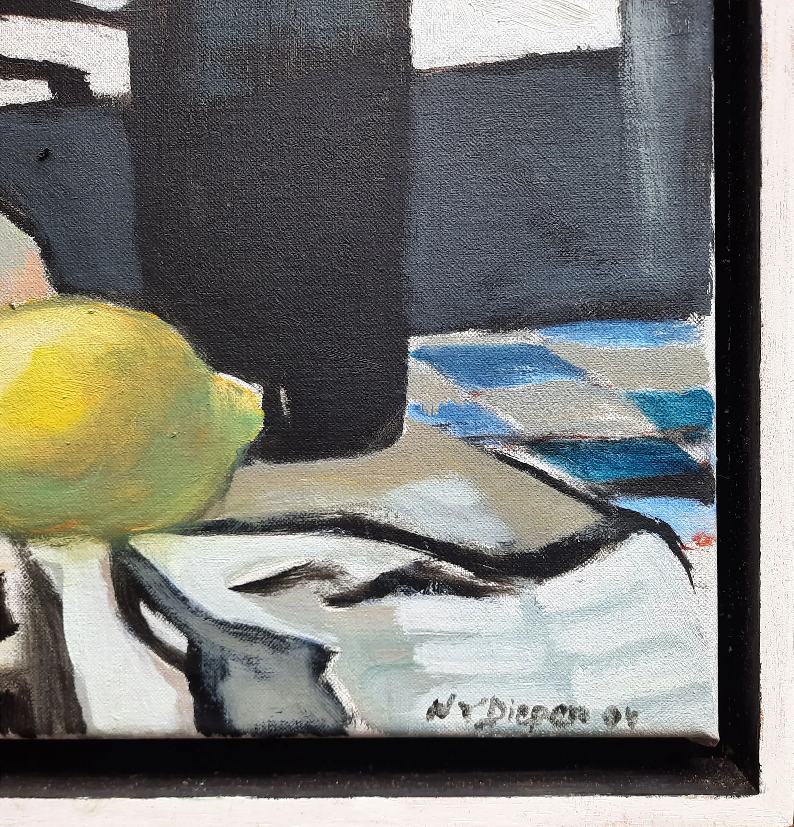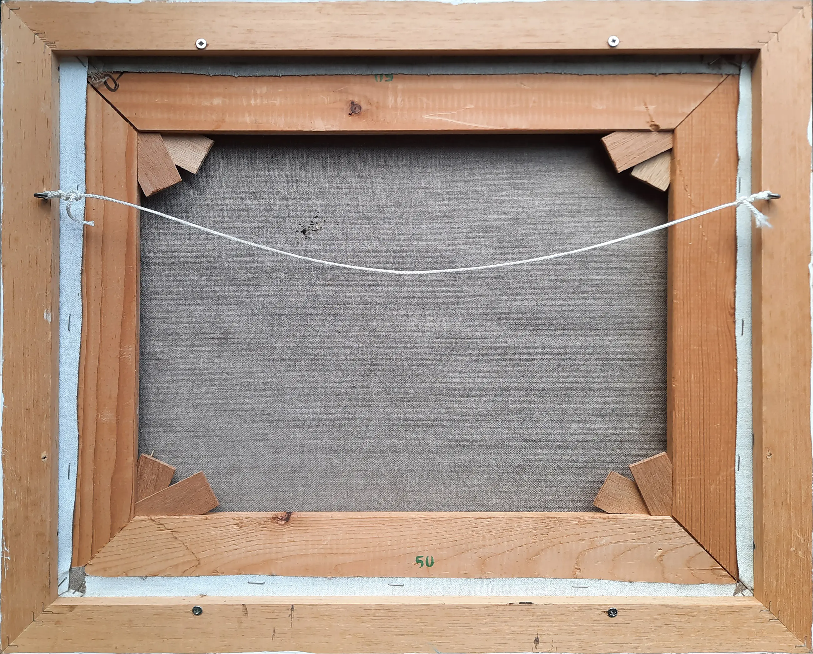 Lijst heeft wat gebruikssporen. Klein veegje op doek.