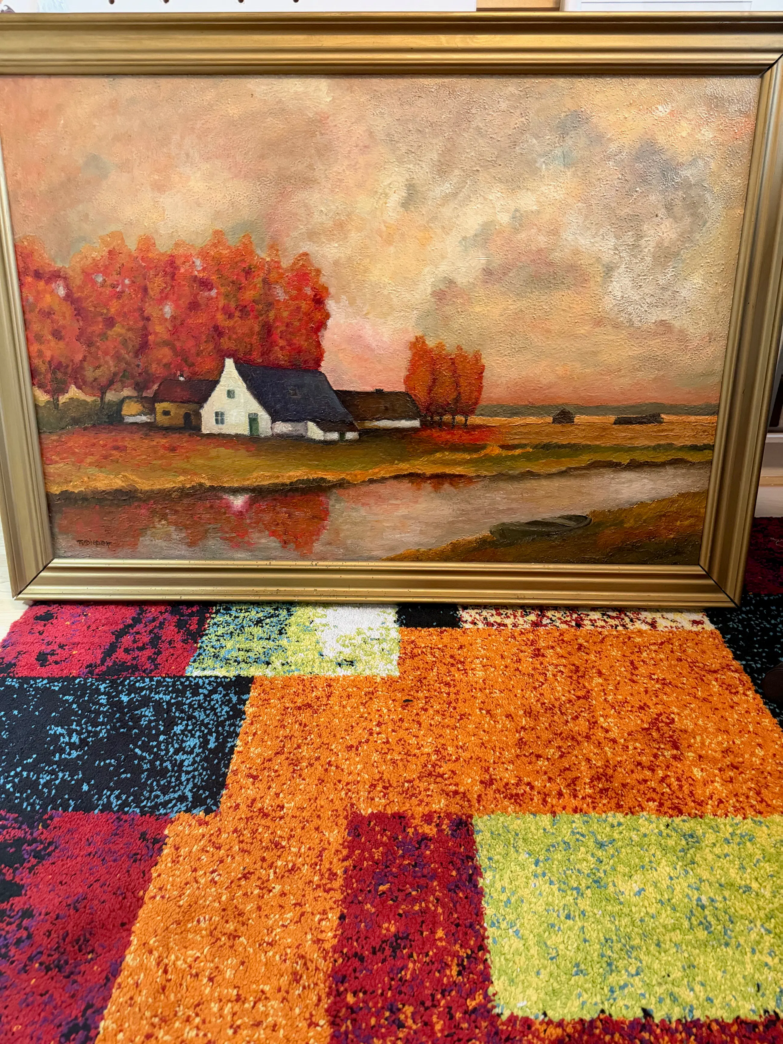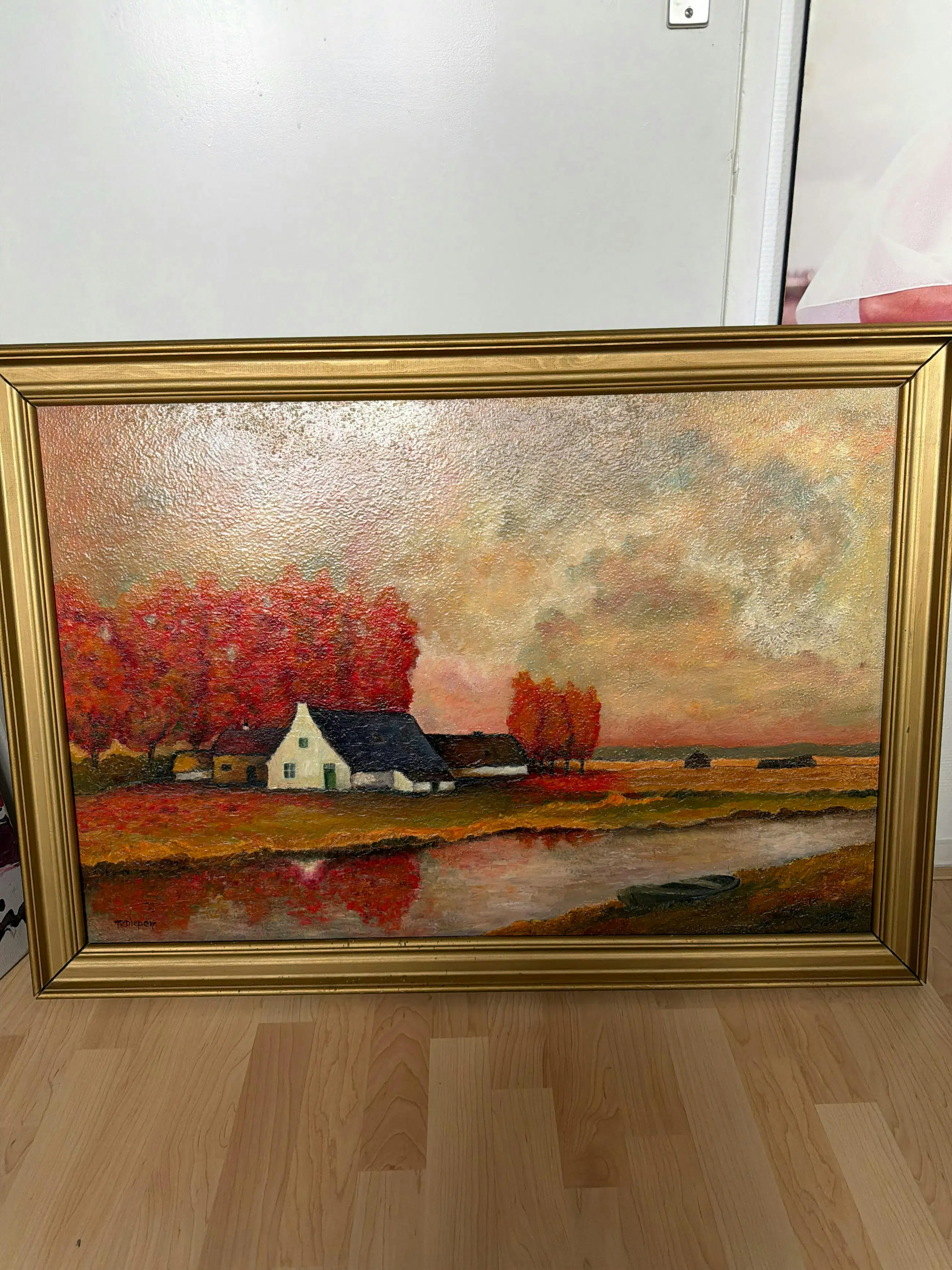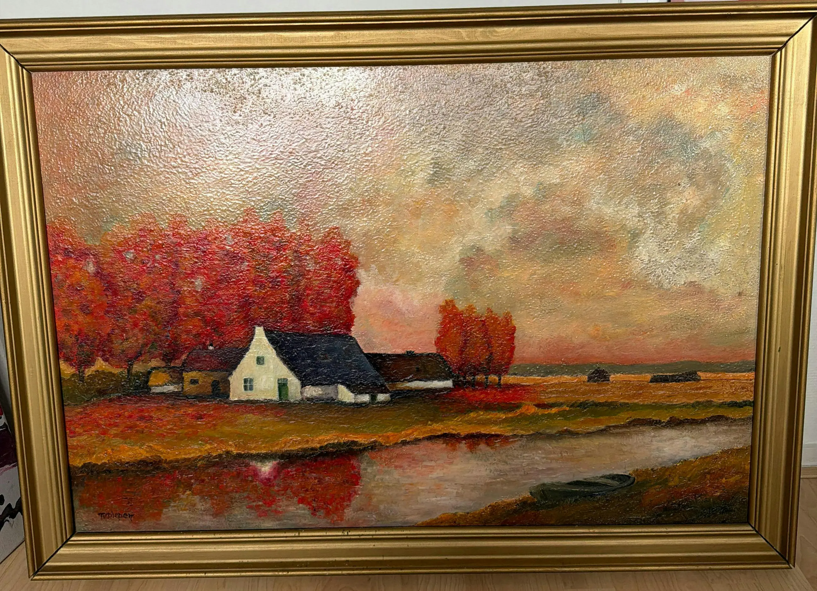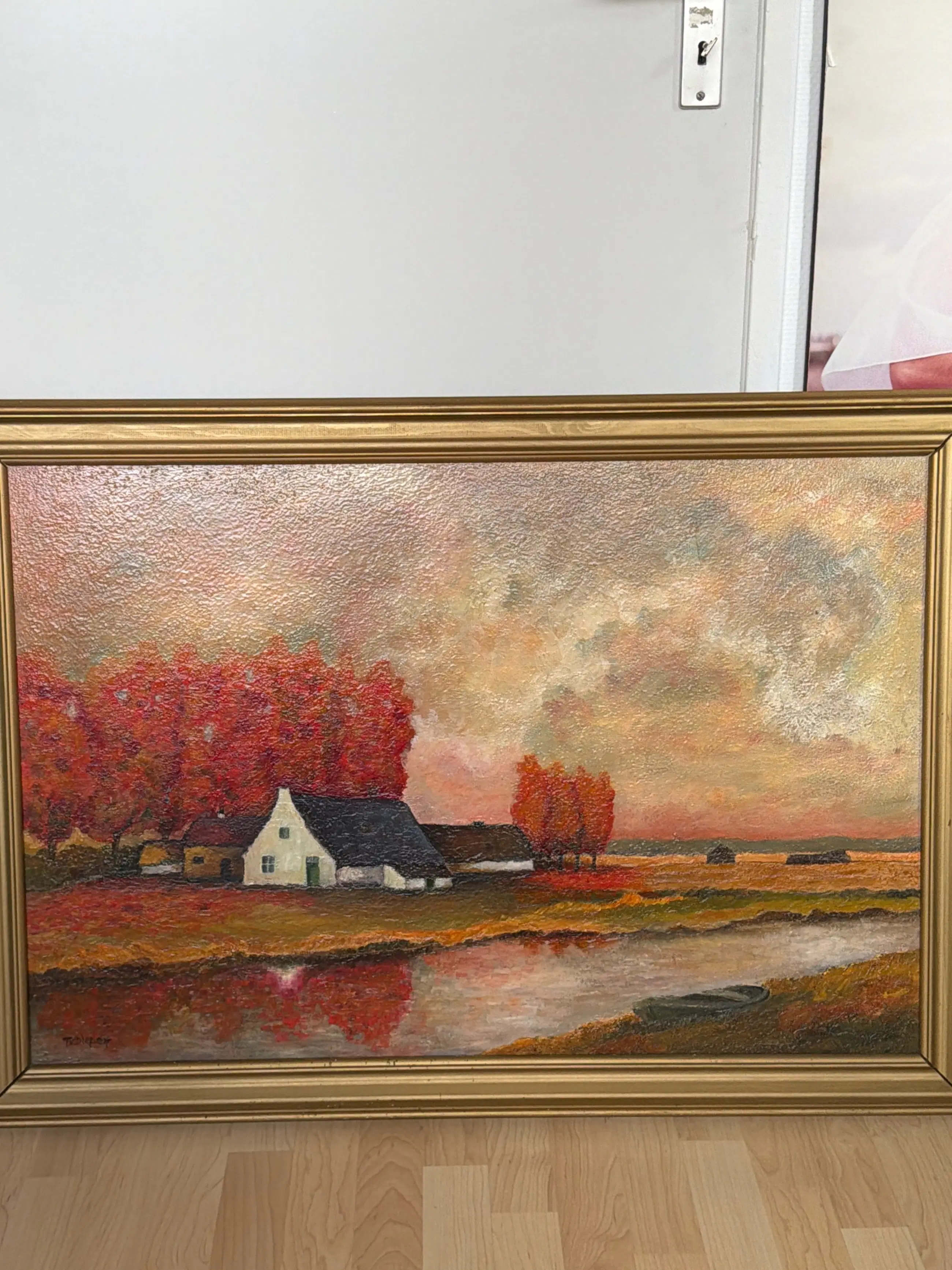 Sfeervol schilderij van de Nederlandse kunstenares Tine van Diepen-Alderliefste, bekend om haar landelijke taferelen en warme kleurgebruik. Dit werk toont een rustieke boerderij aan het water, omgeven door dieprode herfstbomen en een zacht gekleurde lucht die prachtig weerspiegelt in het landschap. De losse penseelstreken en het subtiele spel van licht geven het schilderij een duidelijke impressionistische uitstraling. Het schilderij straalt rust en nostalgie uit. De combinatie van warme tinten en een herkenbaar Hollands landschap maakt dit werk bijzonder. Het werk is gesigneerd (linksonder) en wordt geleverd in een stijlvolle, goudkleurige lijst die het geheel een elegante en tijdloze uitstraling geeft. Op de lijst zijn enige gebruikssporen zichtbaar. Een mooi verzamelwaardig werk van een Nederlandse kunstenares. Afmeting inclusief lijst is 102 cm bij 72 cm.