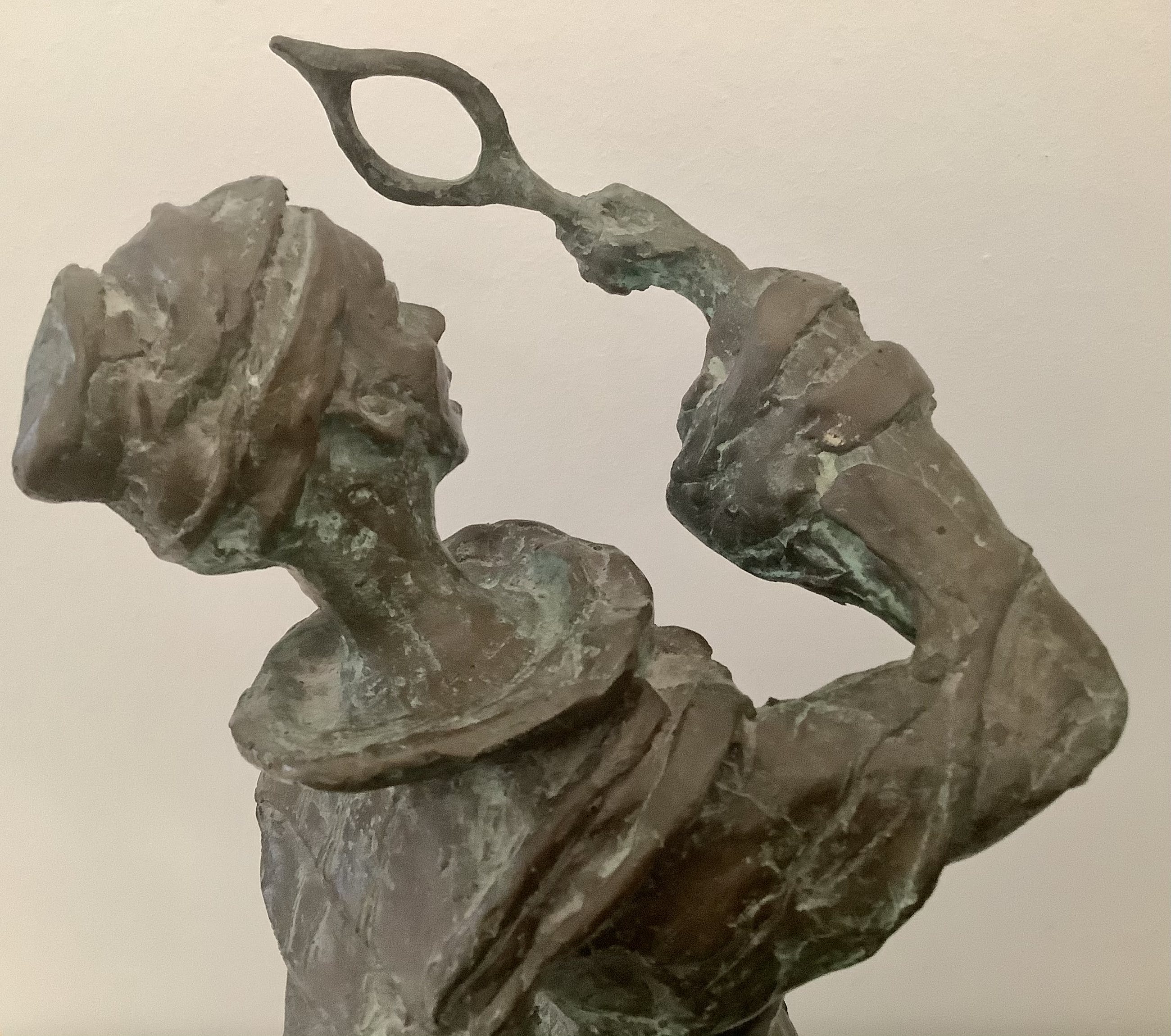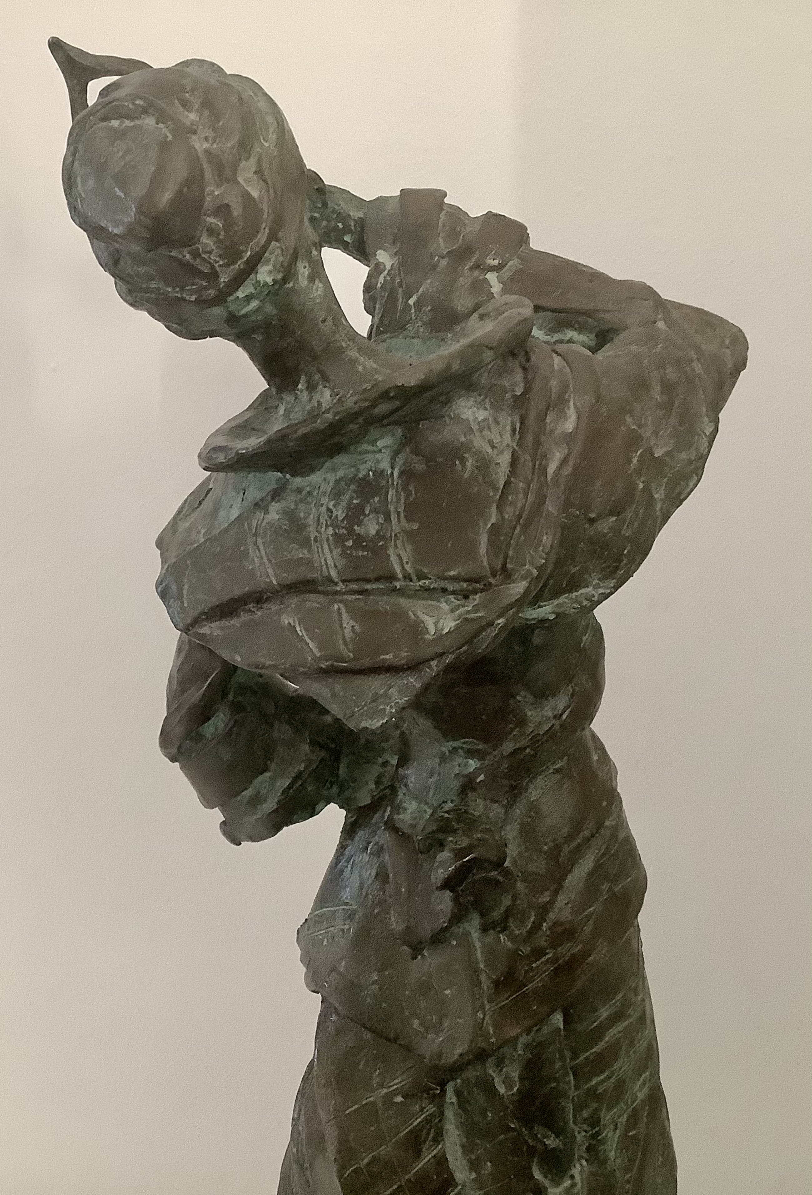 Tineke Bot, 1945, leerling van Mari Andriessen. Bijzondere techniek en zeer vakkundig gegoten en gepatineerd. Natuurstenen sokkel 9 x 9 x 4 cm. Zwaar beeld.