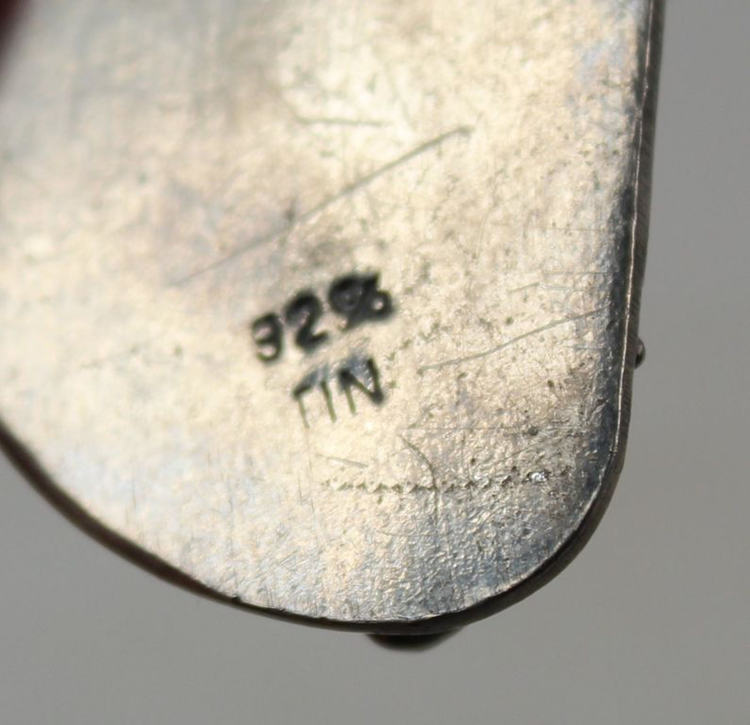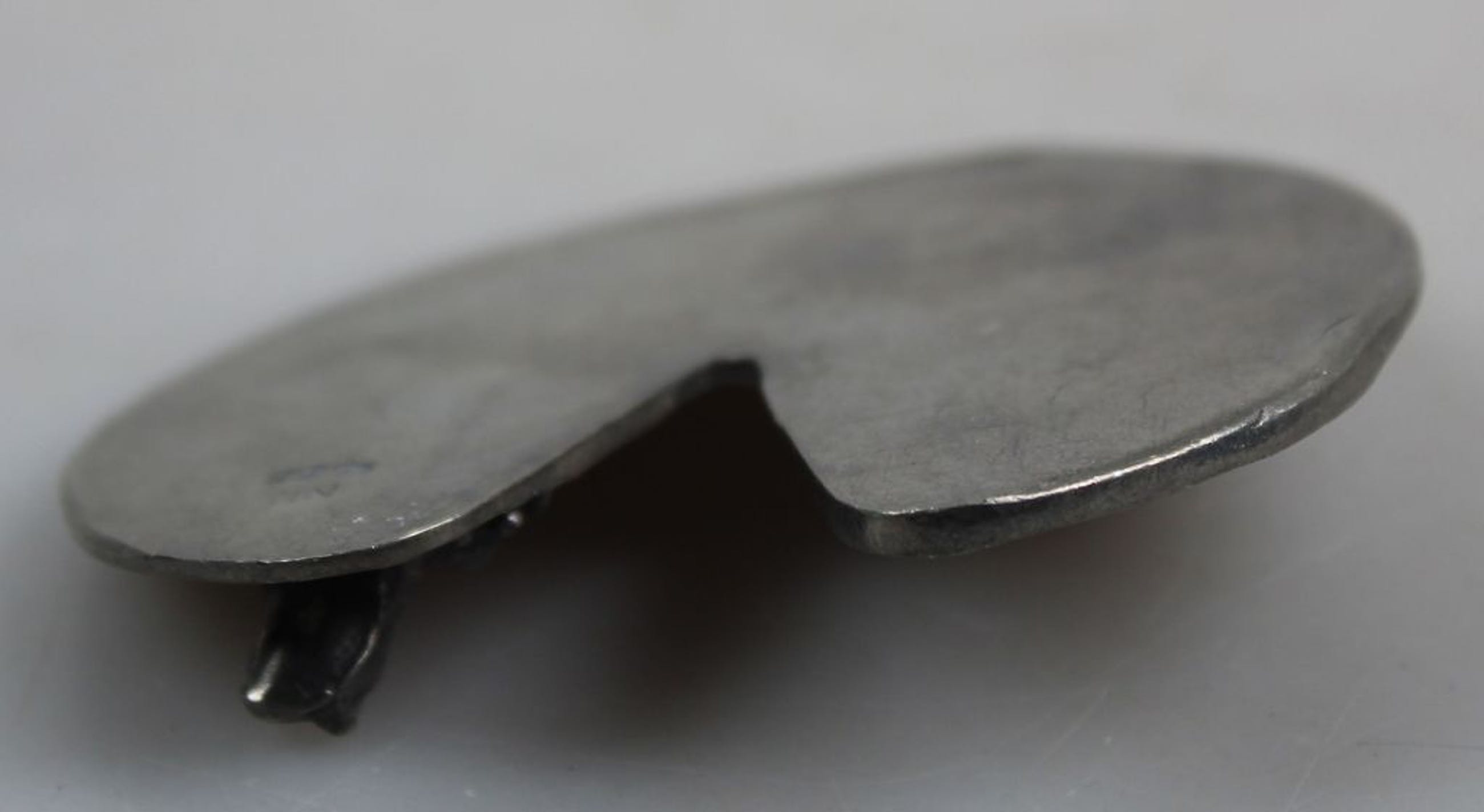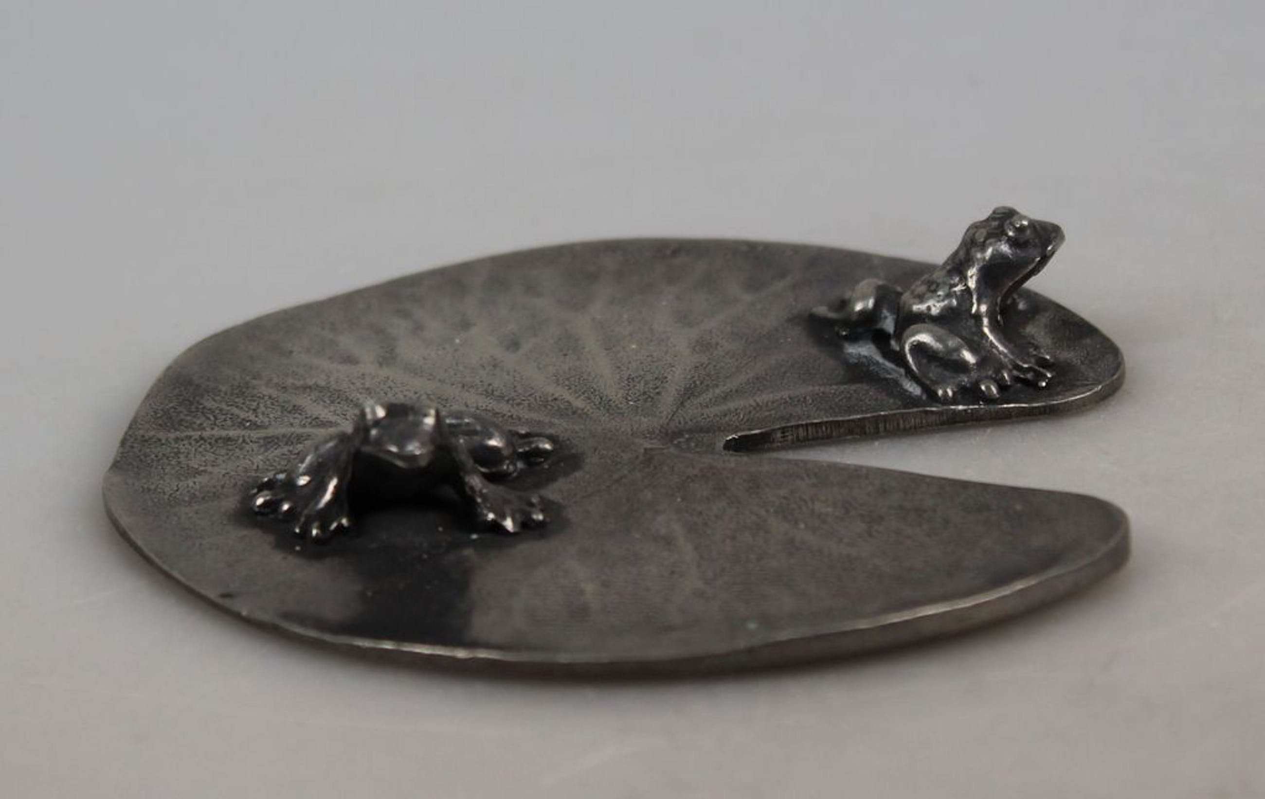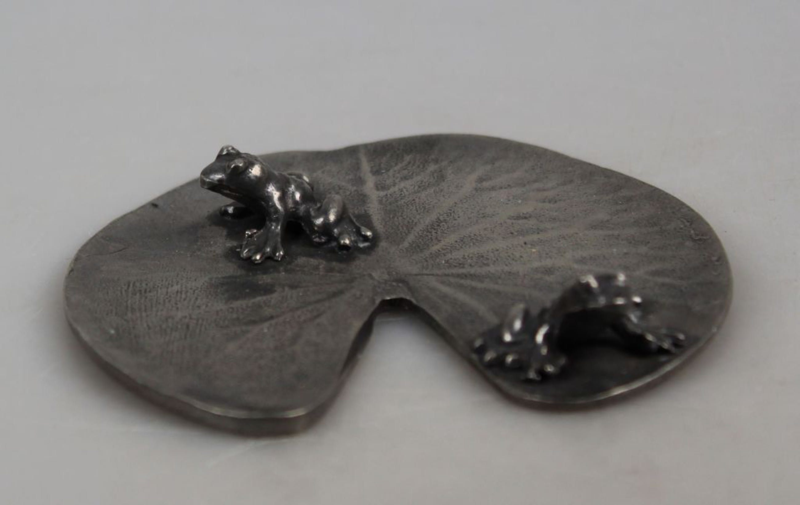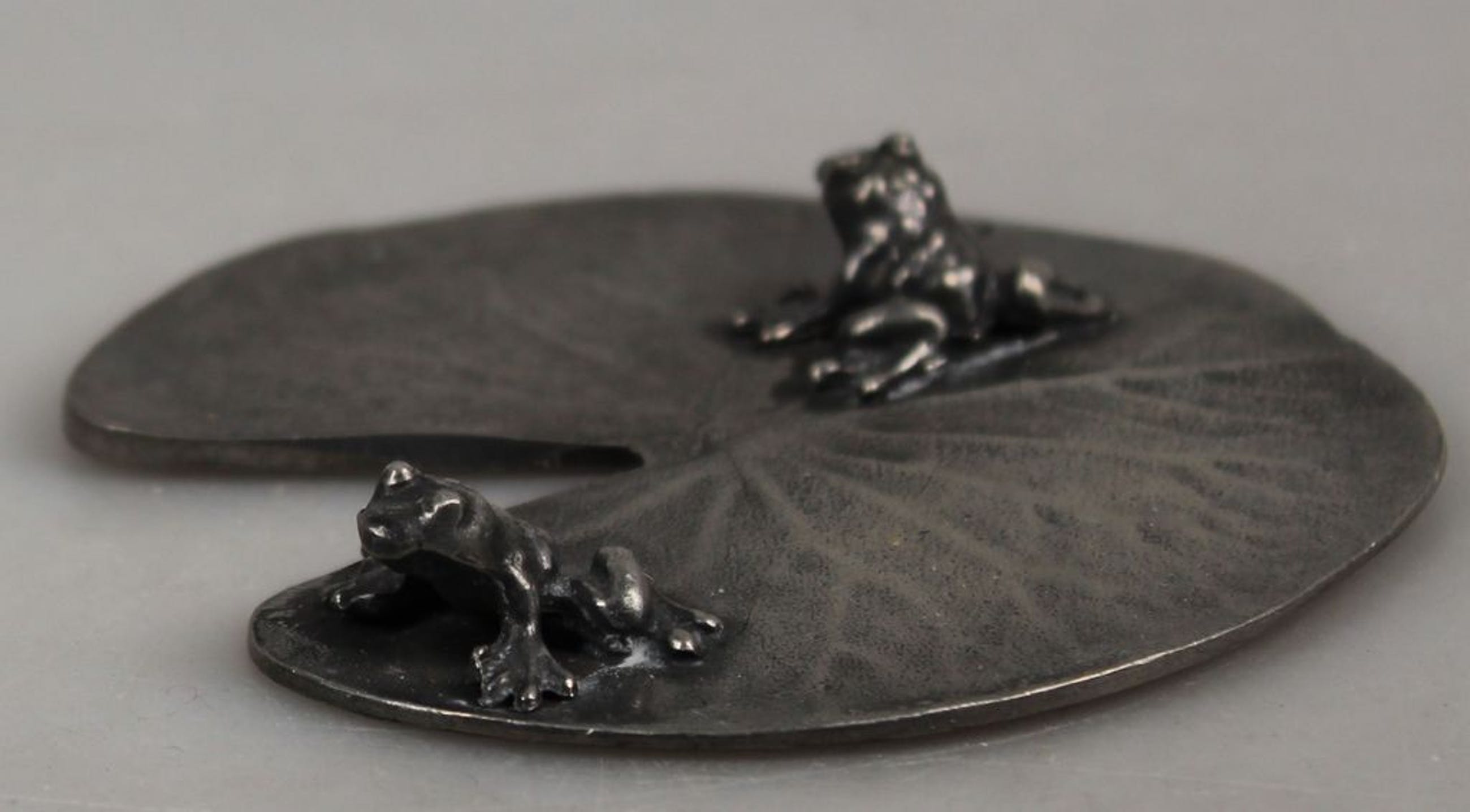 Tinnen waterlelieblad met 2 kikkers. Gestempeld 92% tin. Prima staat, diameter ca. 8,5 cm.