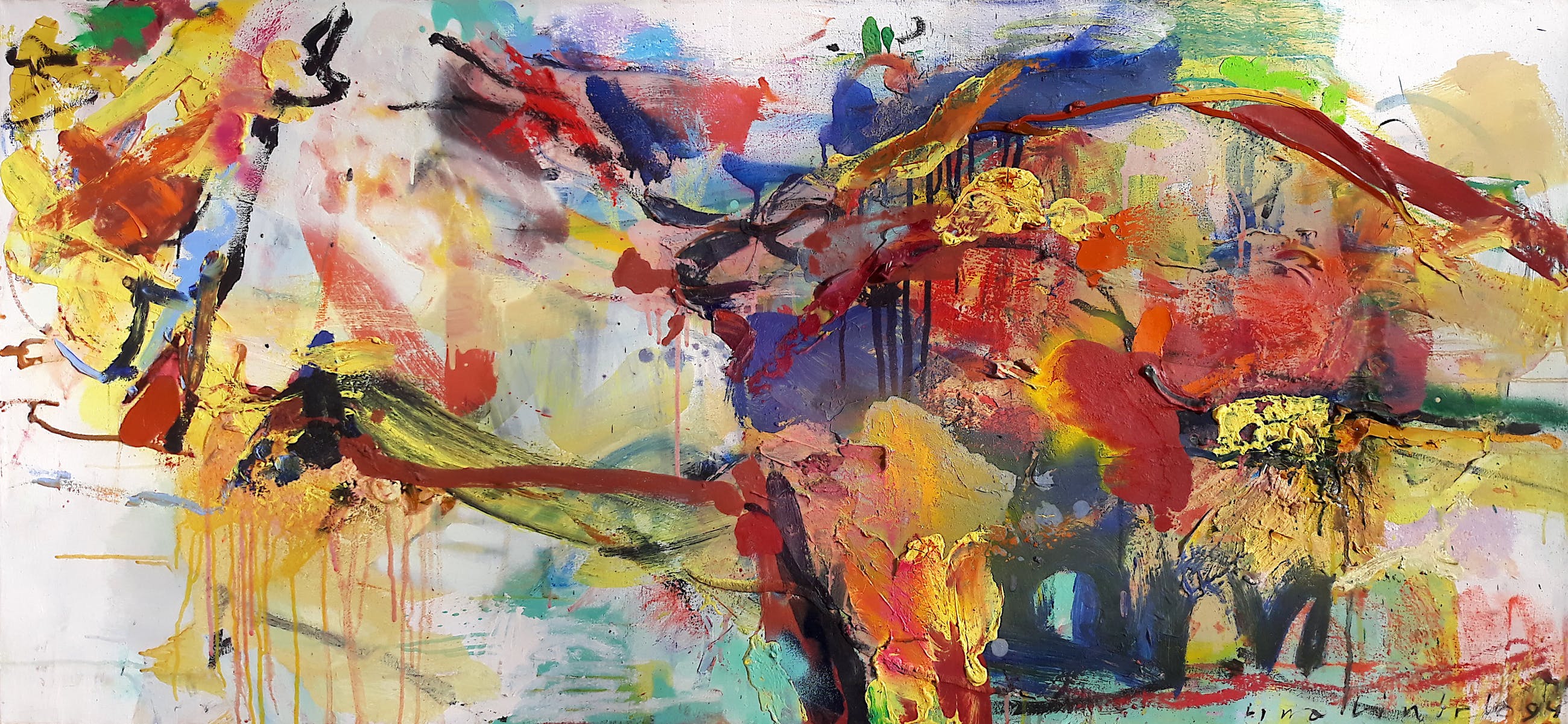 Karakteristieke, kleurrijke compositie van Tino Lintelo. Olieverf op doek, gesigneerd en gedateerd (‘94) rechtsonder, in eenvoudige houten lijst. In zeer goede conditie. Geschatte galerieprijs: 2000 euro.