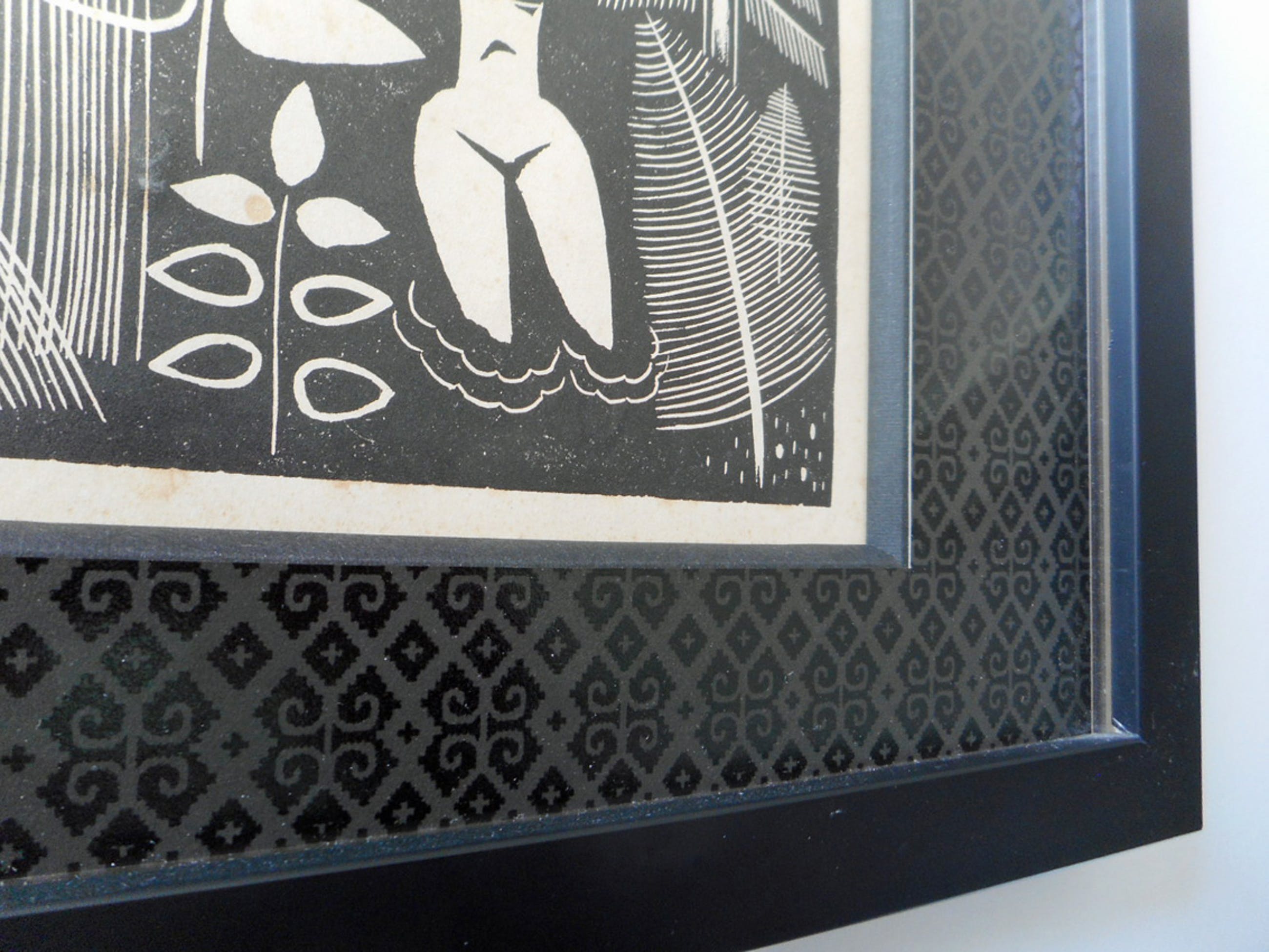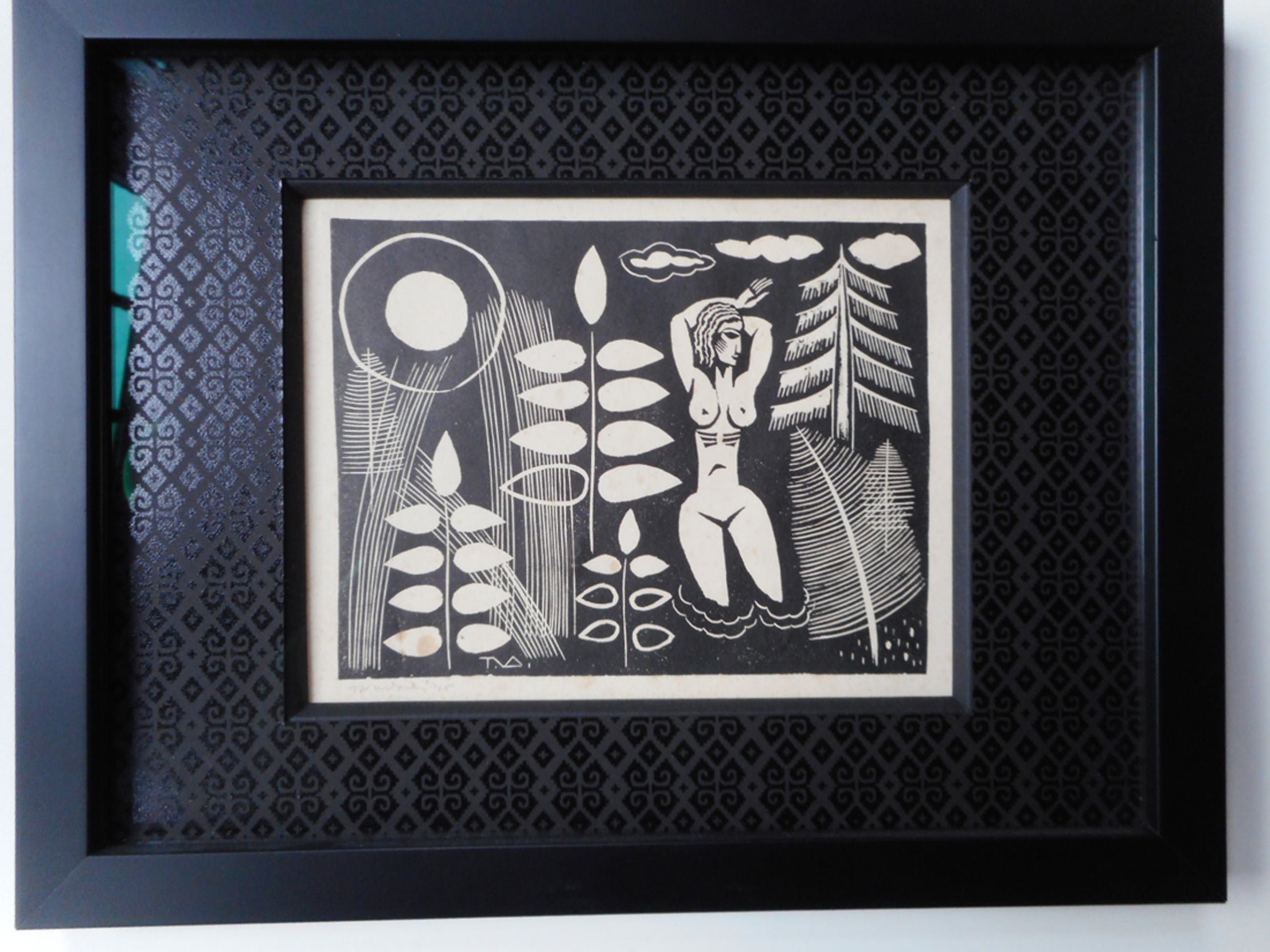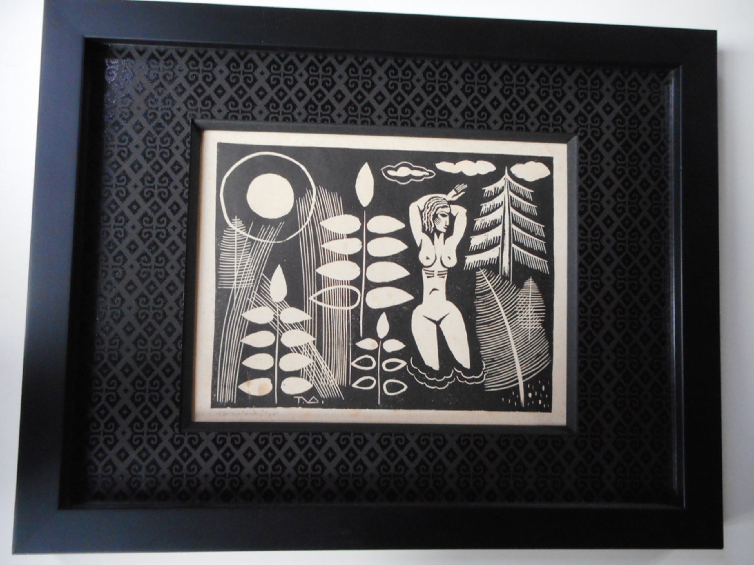 Sterke houtsnede voorzien van conserverende inlijsting met o.a."frans"passepartout en art-glass.Geboren Padang (Sumatra) 1905. Zijn werk ontwikkeld zich zelfstandig tot een fantasierijke, sociaal bewogen, aan de Belgische expressionisten en Marc Chagal verwante kunst. In 1929 huwt hij de 15 jaar oudere pianiste en kunstenares Akkie Vermeulen en verhuist het stel naar de Achterhoek. De opkomst van het Nazisme maken Tinus van Doorn somber en in de tweede helft van de jaren 30 wordt zijn werk dreigender en onheilspellender. In 1938 verhuist hij naar België. Op 17 mei 1940, op de dag dat de Duitsers Brussel bezetten, maken Tinus van Doorn en zijn vrouw een eind aan hun leven. Bij zijn overlijden laat de jong overleden kunstenaar een oeuvre achter dat bestaat uit een 150-tal schilderijen, 400 tekeningen,hout-linoleumsnedes en een 15-tal beeldhouwwerken.