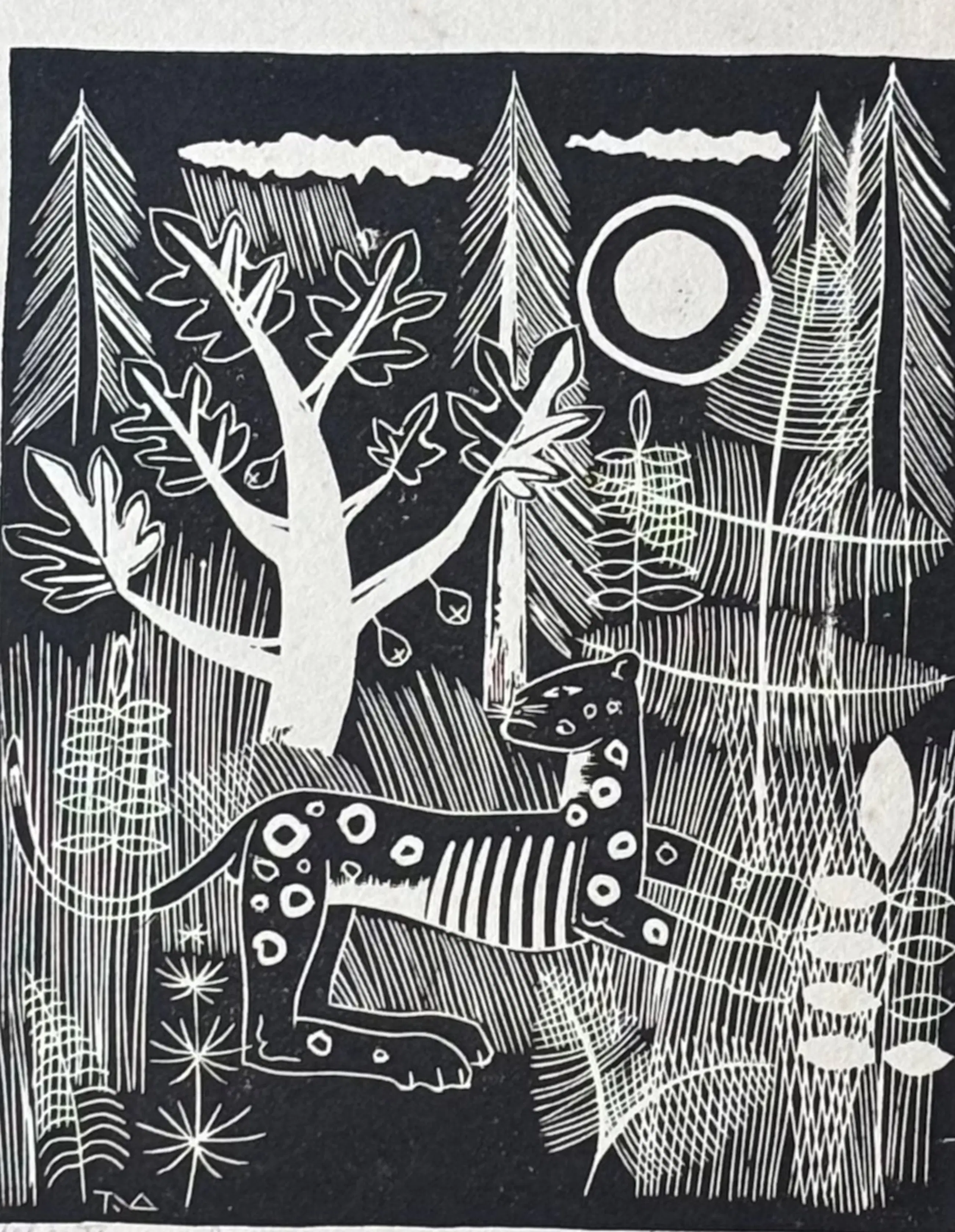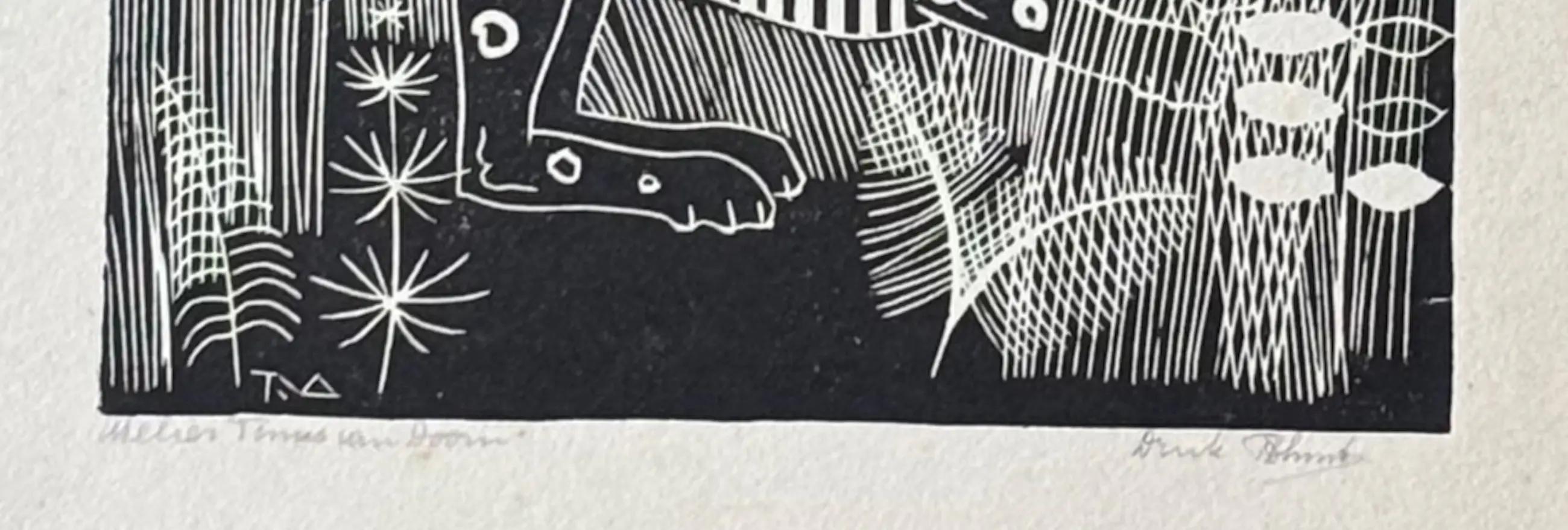 Houtsnede van Tinus van Doorn. Vooral bekend vanwege zijn houtsnedes waarvan dit er 1 is. De signatuur in monogram TVD rechtsonder in de druk zelf.