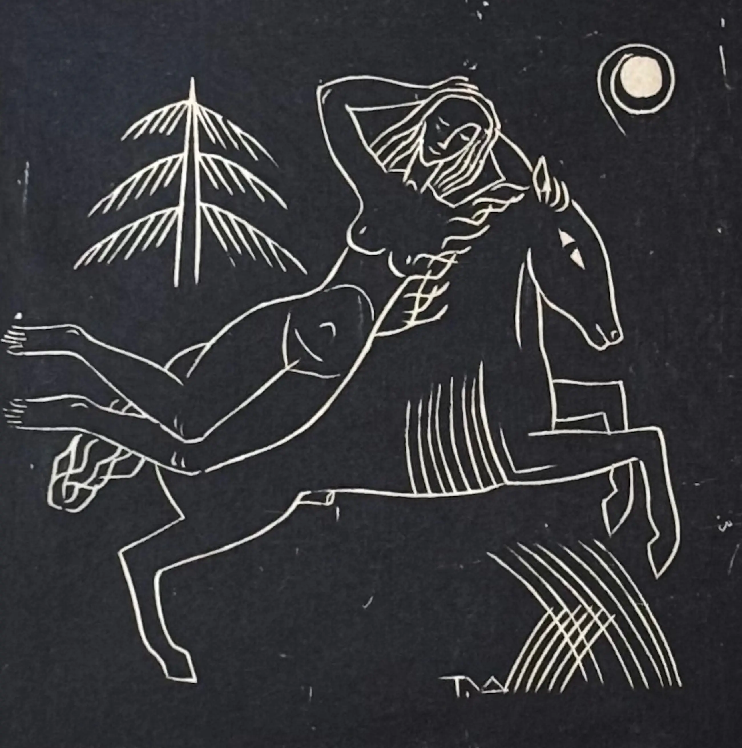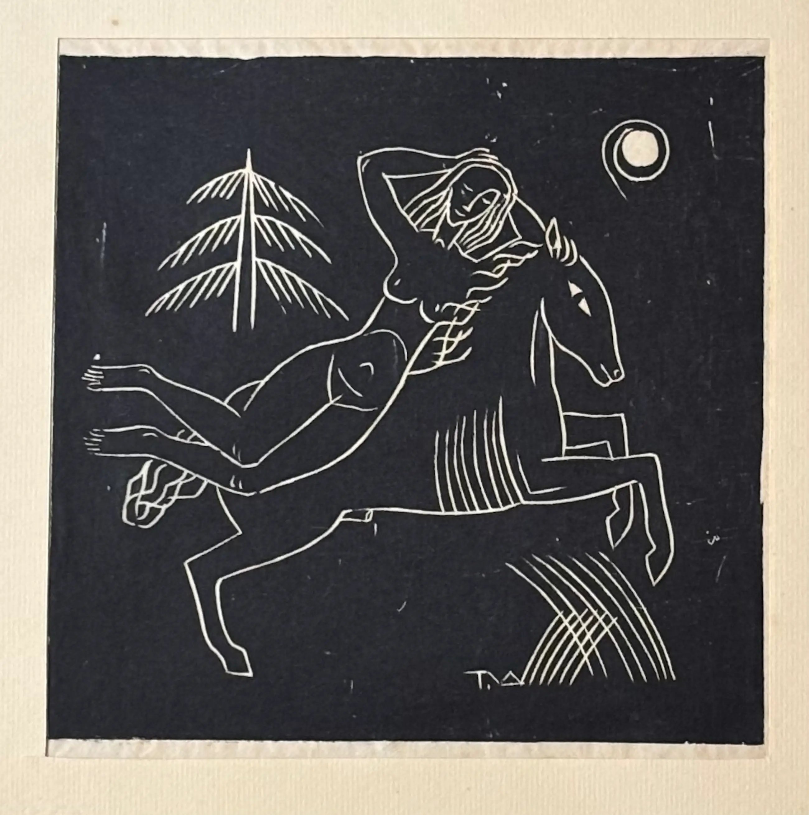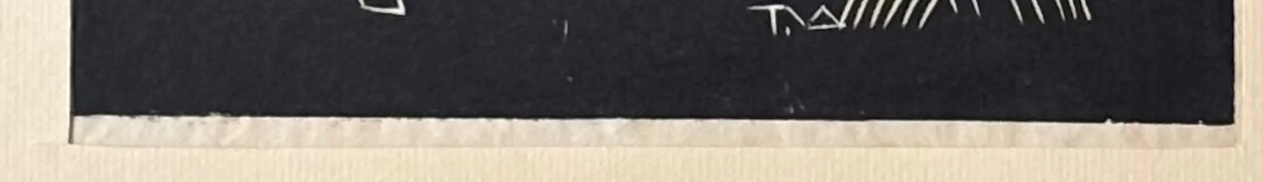Houtsnede van Tinus van Doorn. Vooral bekend vanwege zijn houtsnedes waarvan dit er 1 is. De signatuur in monogram TVD rechtsonder in de druk zelf.