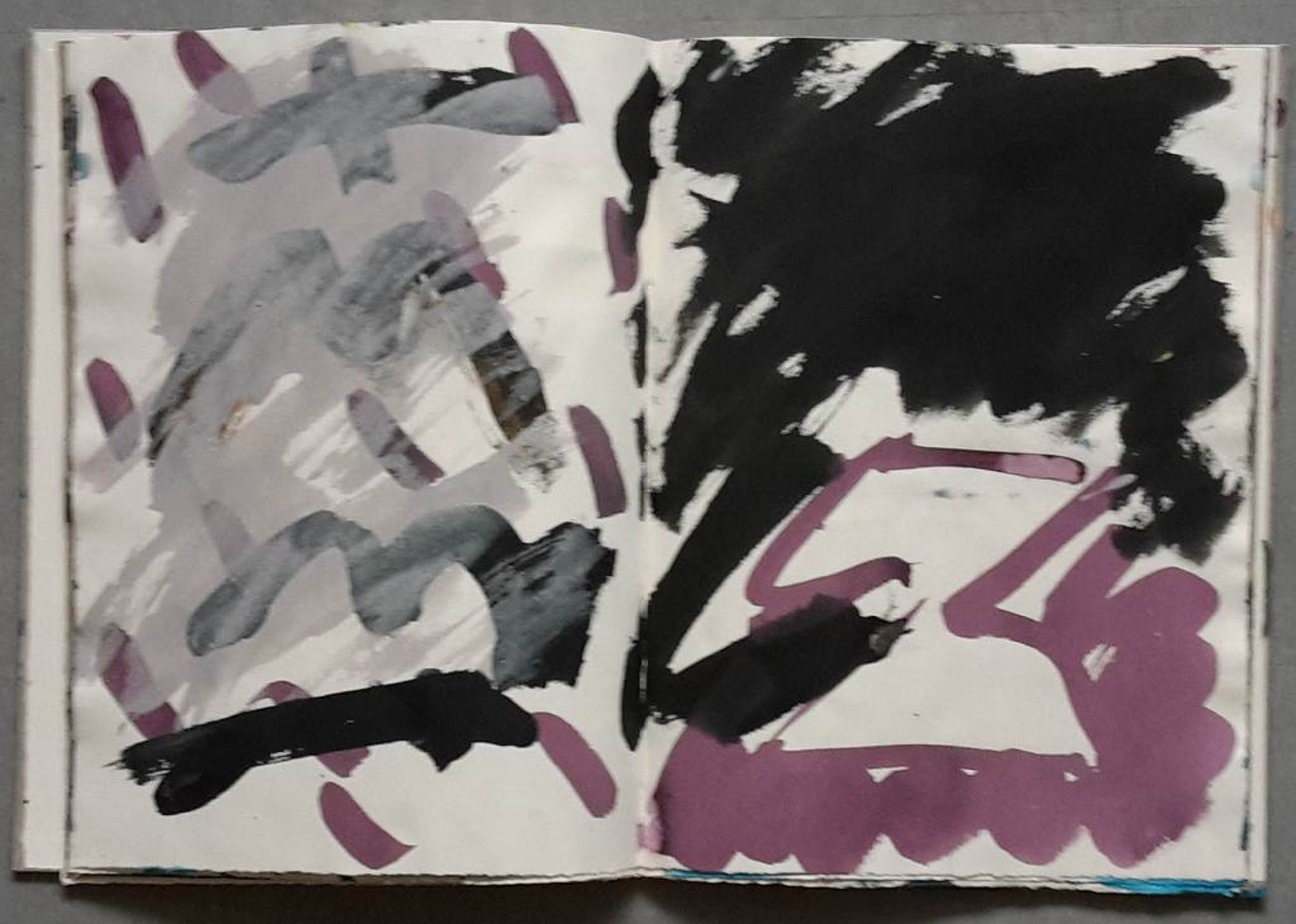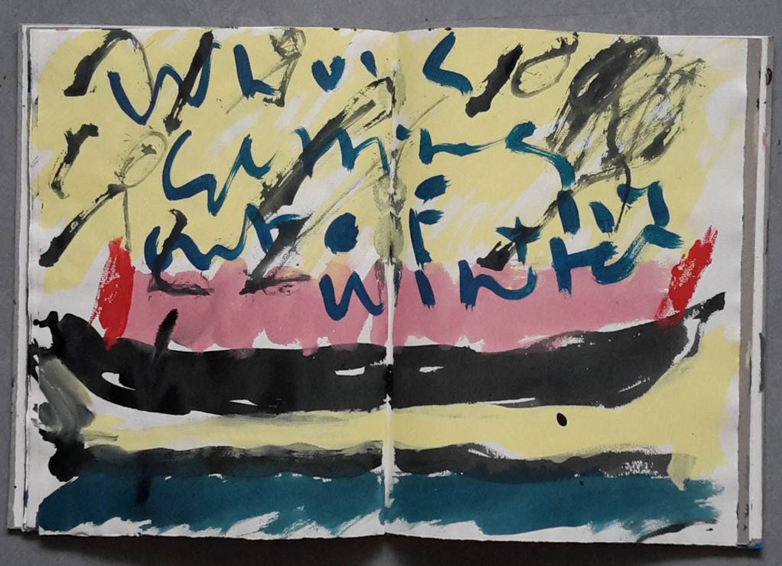 9 gouaches op 4 dubbelgevouwen bladen geschept papier van ca. 55 x 38 cm, tweezijdig beschilderd en ingebonden met 2 voorbladen in kartonnen omslag (ca, 29 x 38,5 cm). Uitgegeven bij een tentoonstelling in het Apollohuis, Eindhoven, 1983, in een ongenummerde oplage van 30 exemplaren. Gesigneerd met verf op het tweede voorblad. Conditie zeer goed.