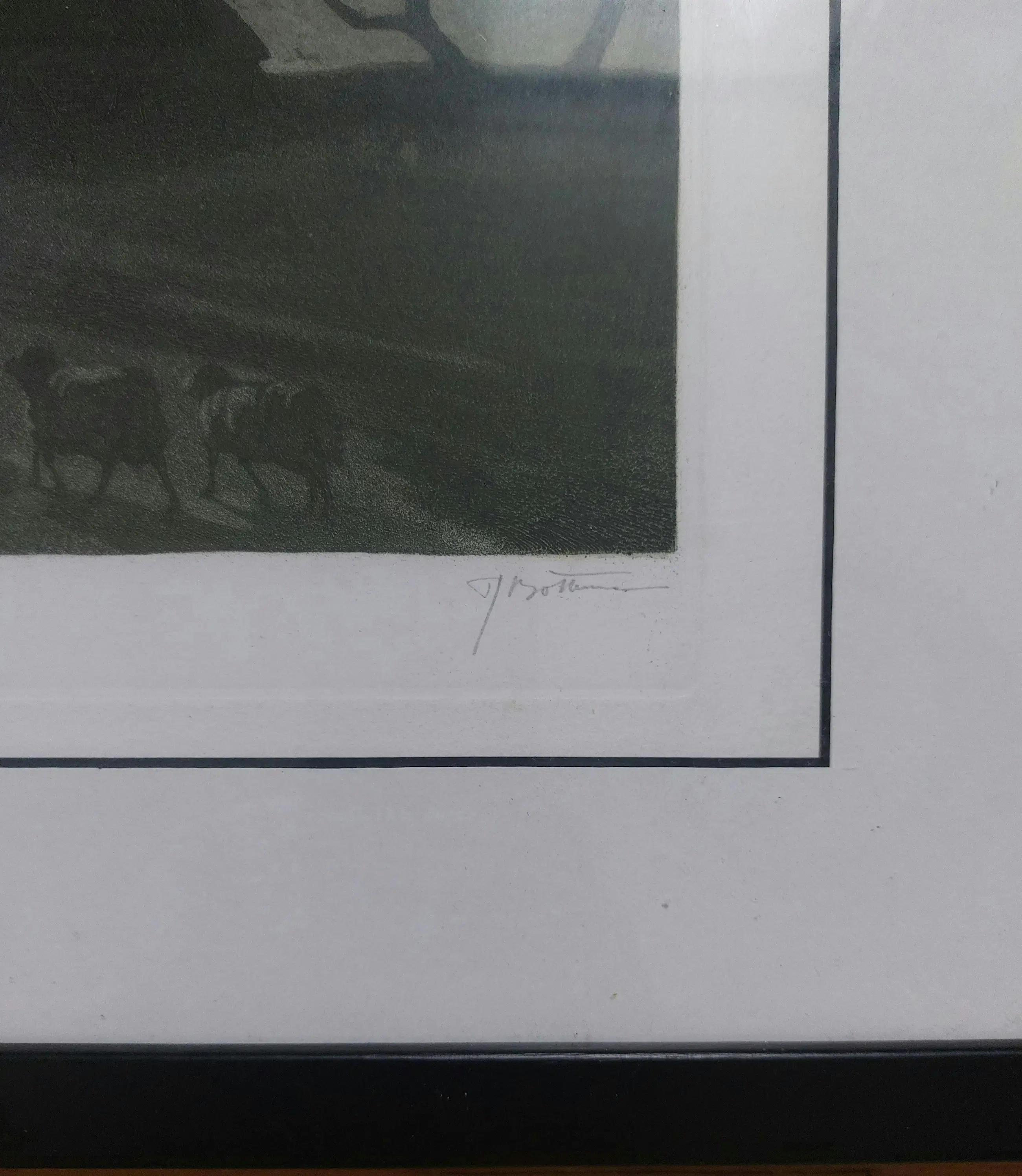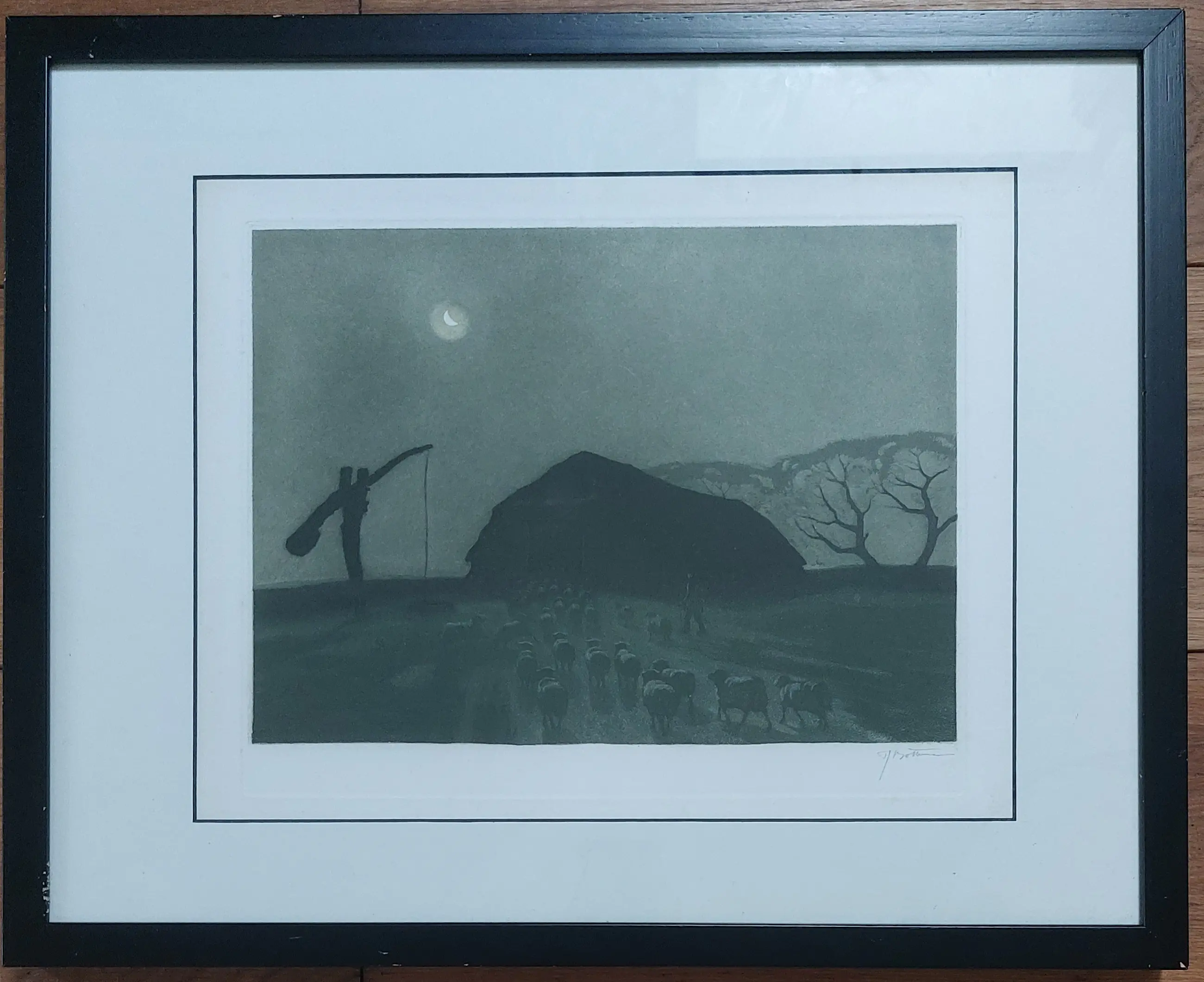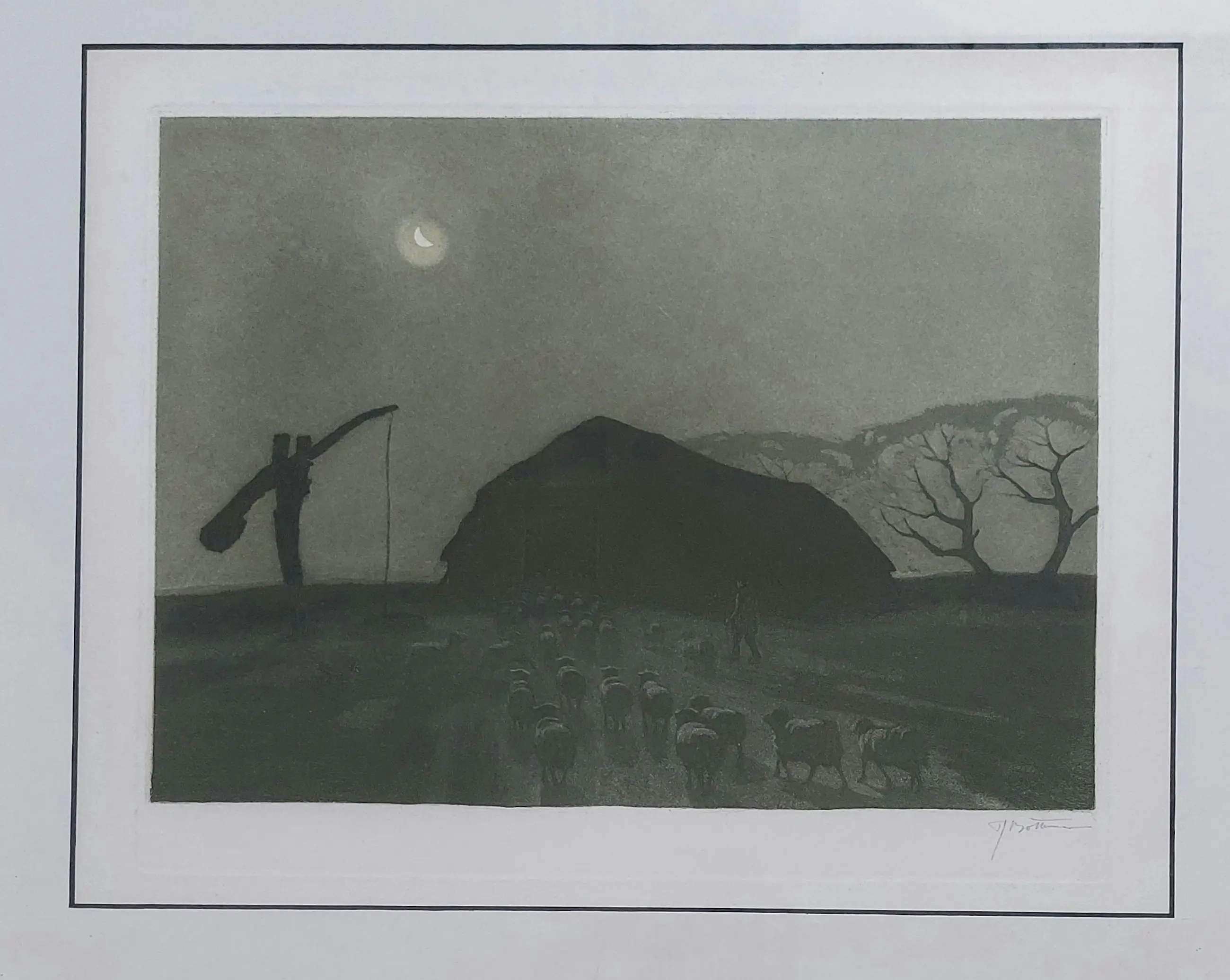 Grote gesigneerde ets/aquatint van Tjeerd Bottema van schaapskooi bij maanlicht op de Veluwe. In zeer goede staat in degelijke lijst. Lijst heeft wat lichte gebruikerssporen.