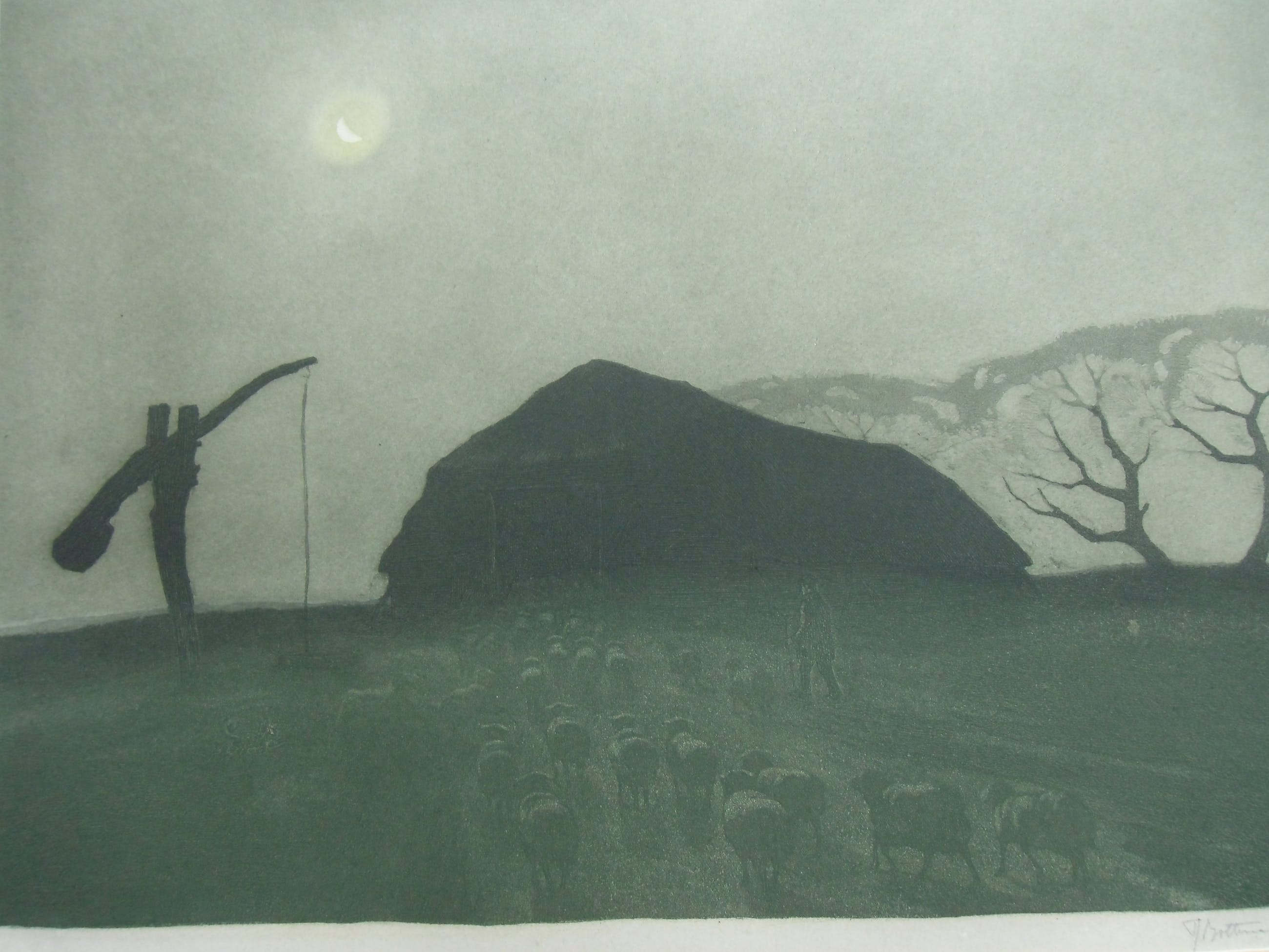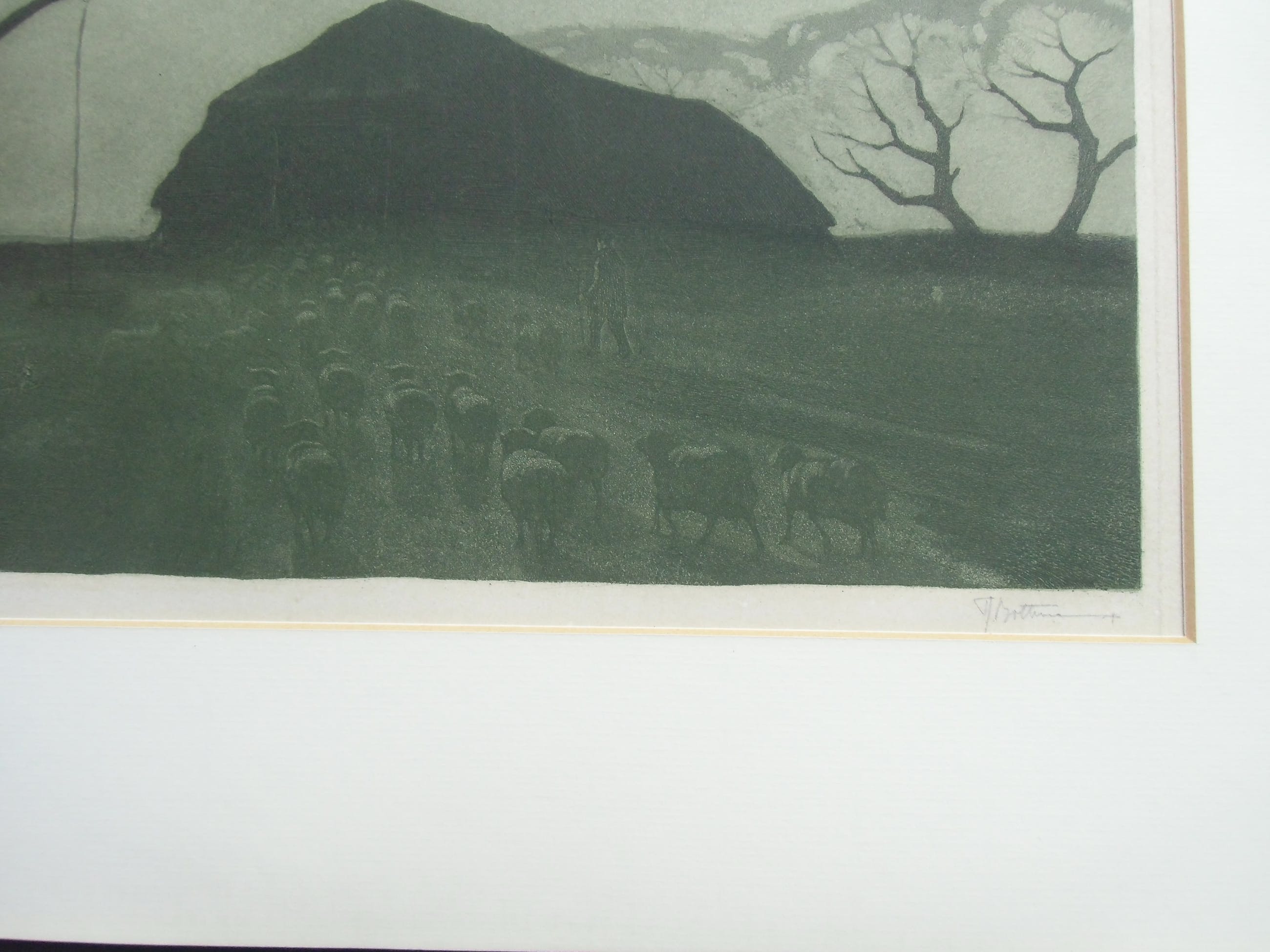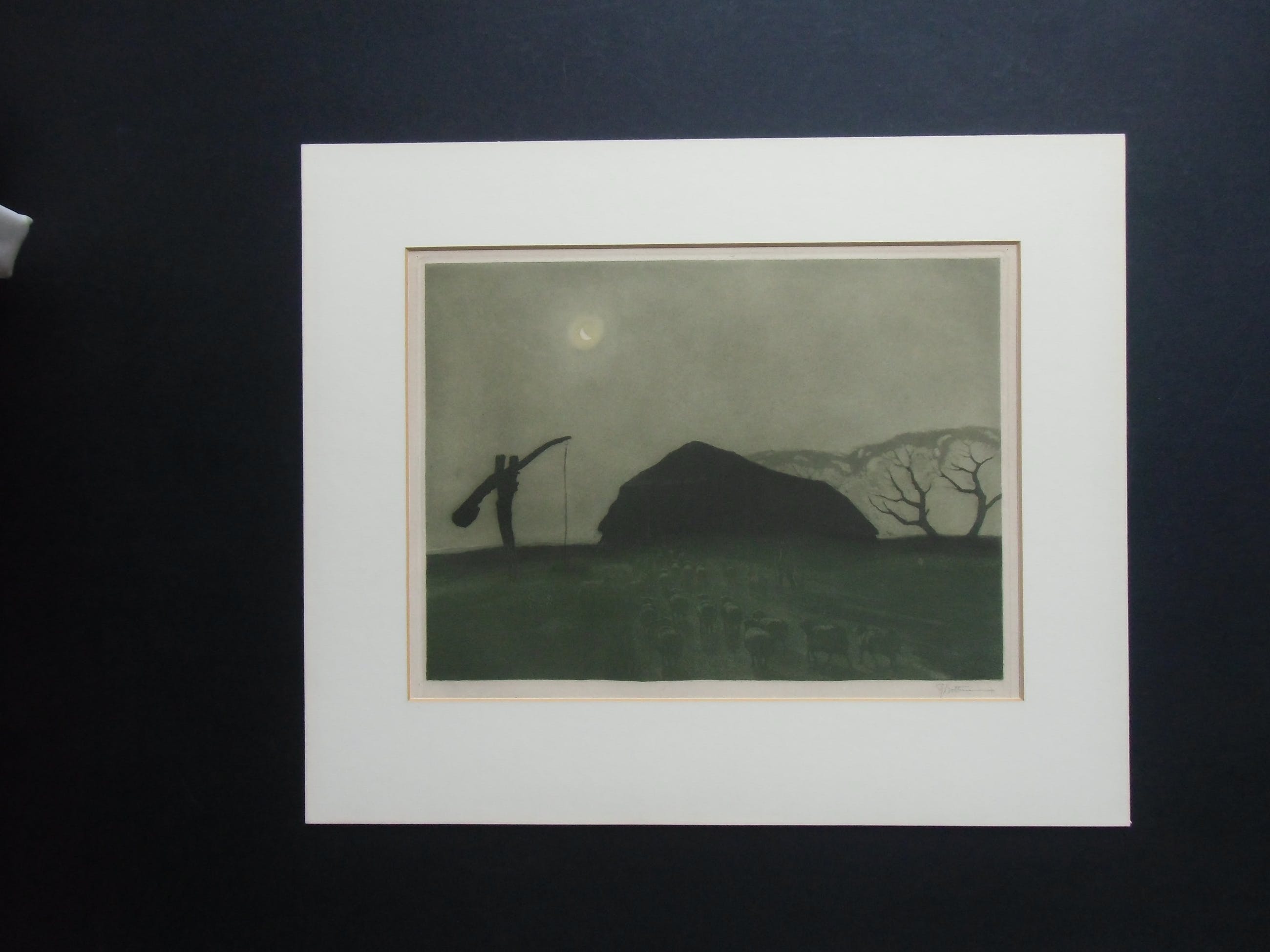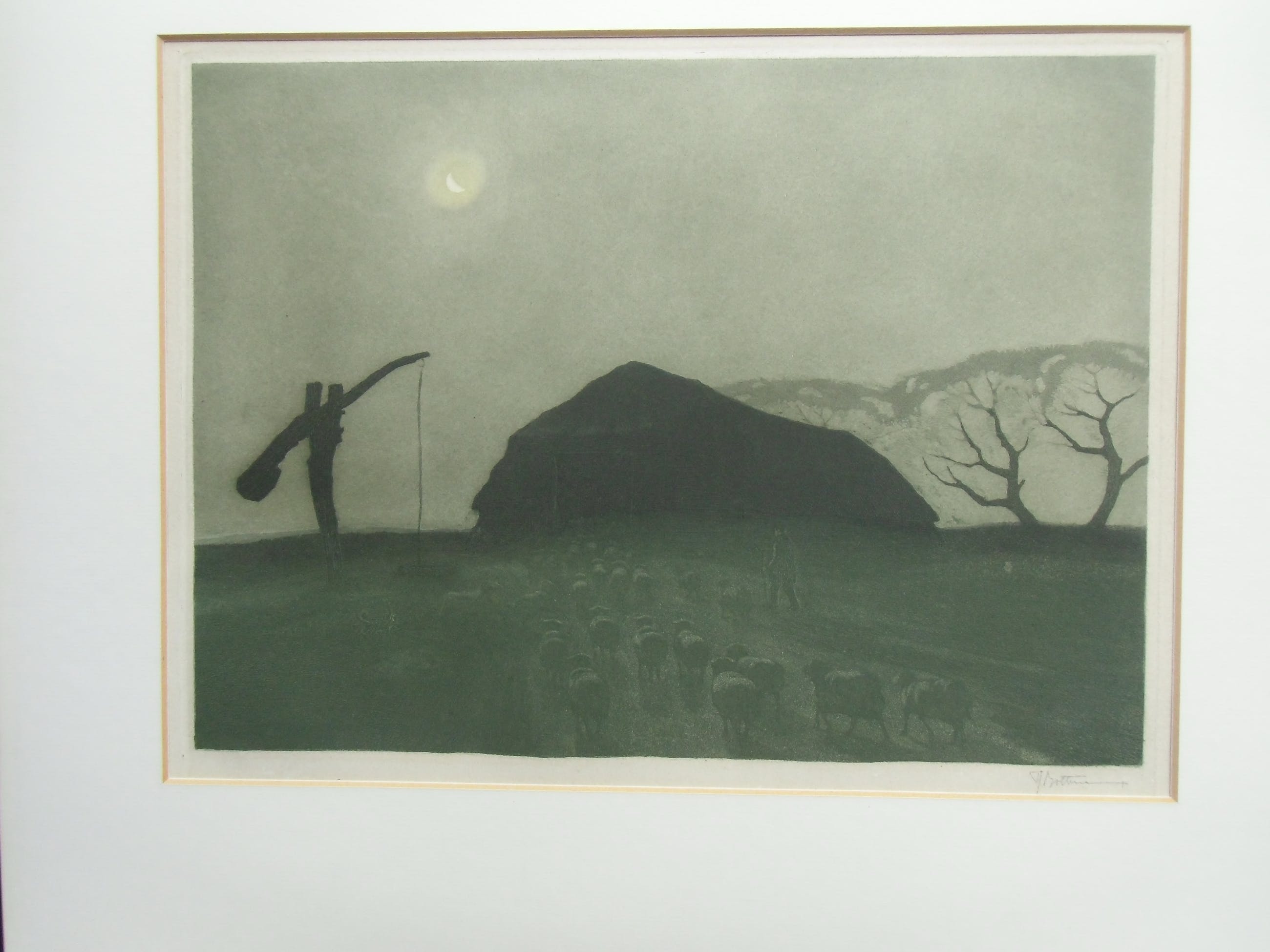 Ets-Aquatint in verschillende kleuren groen en bruin. Gesigneerd met potlood r.o. Uitstekende kwaliteit.