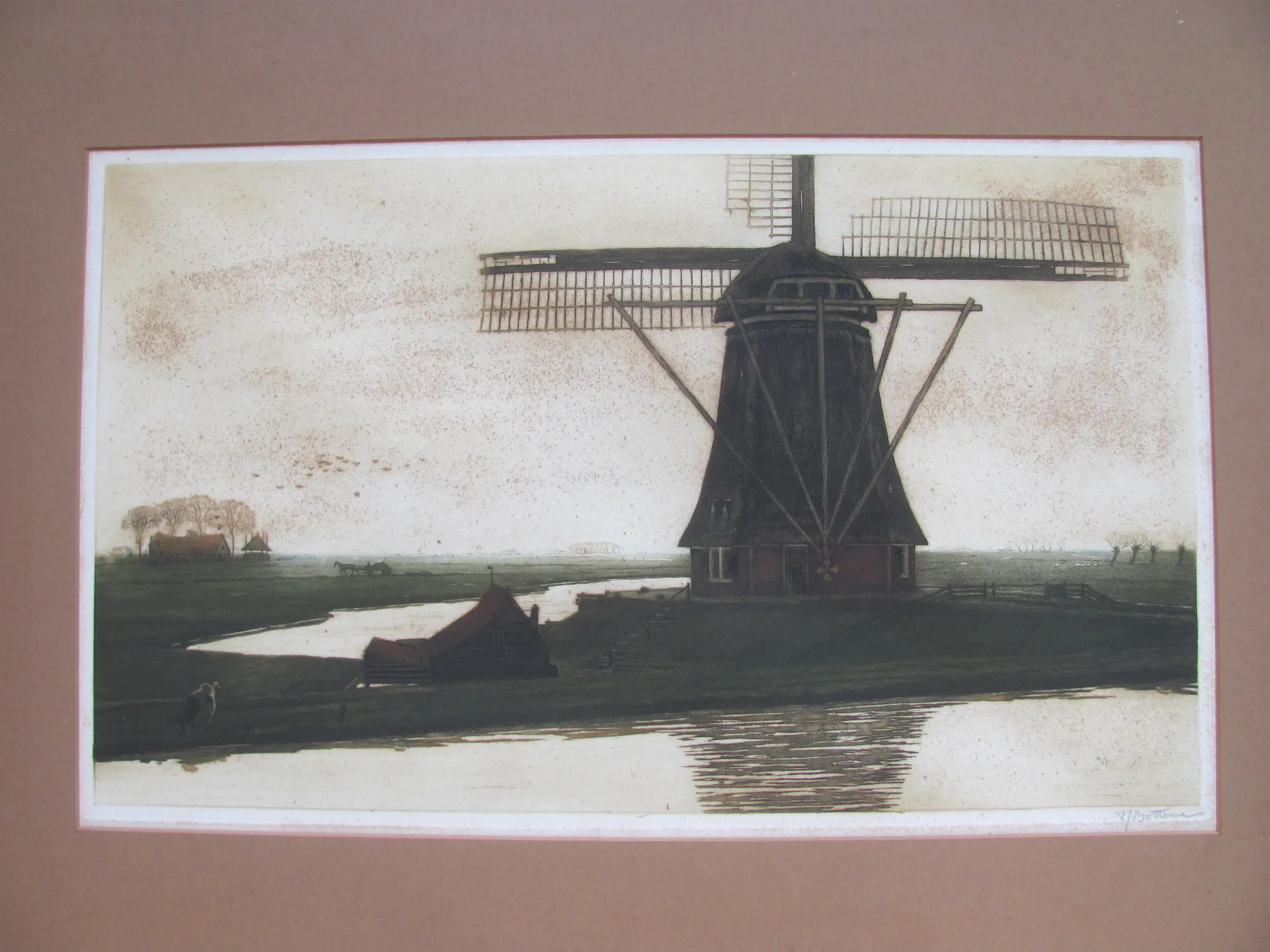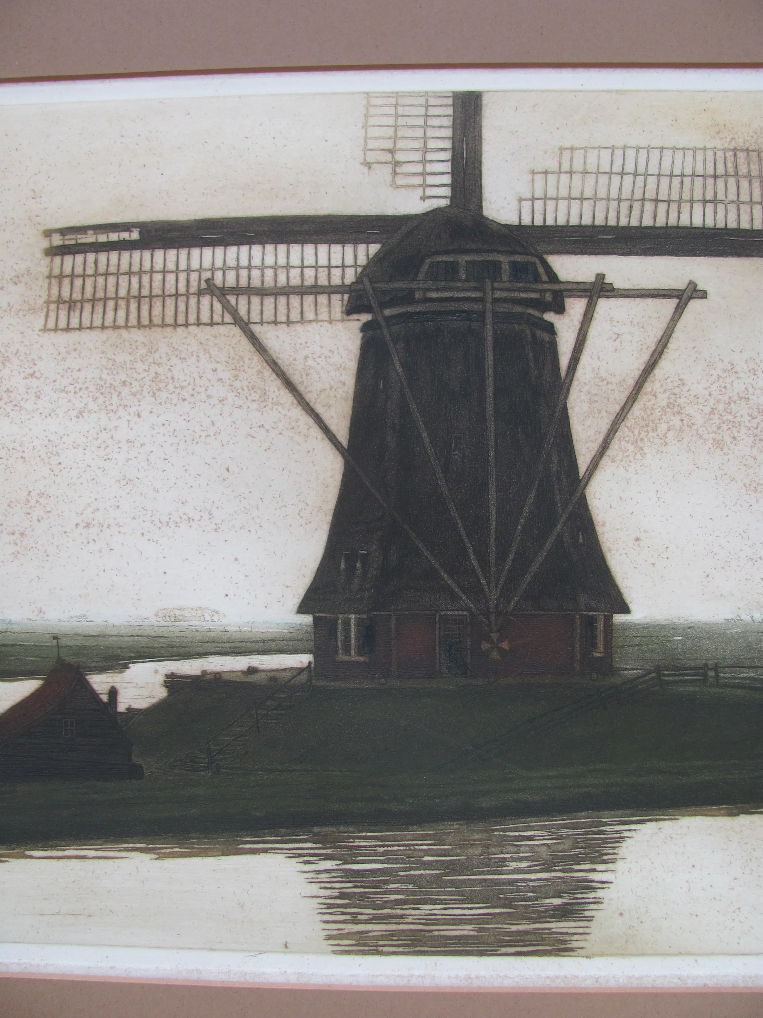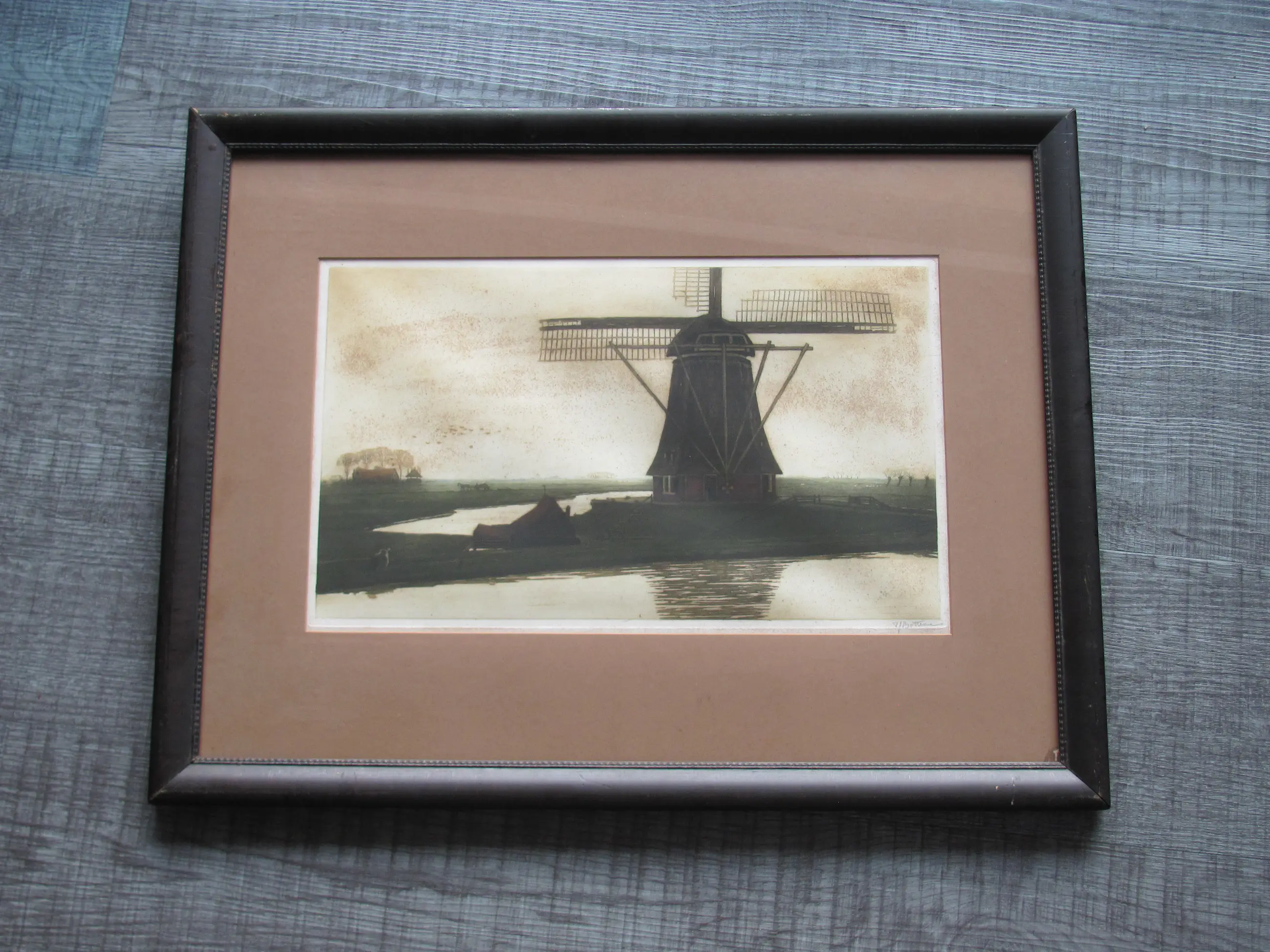 Ets van Tjeerd Bottema in de originele lijst en passe-partout. Afgebeeld is de molen in Watergraafsmeer.