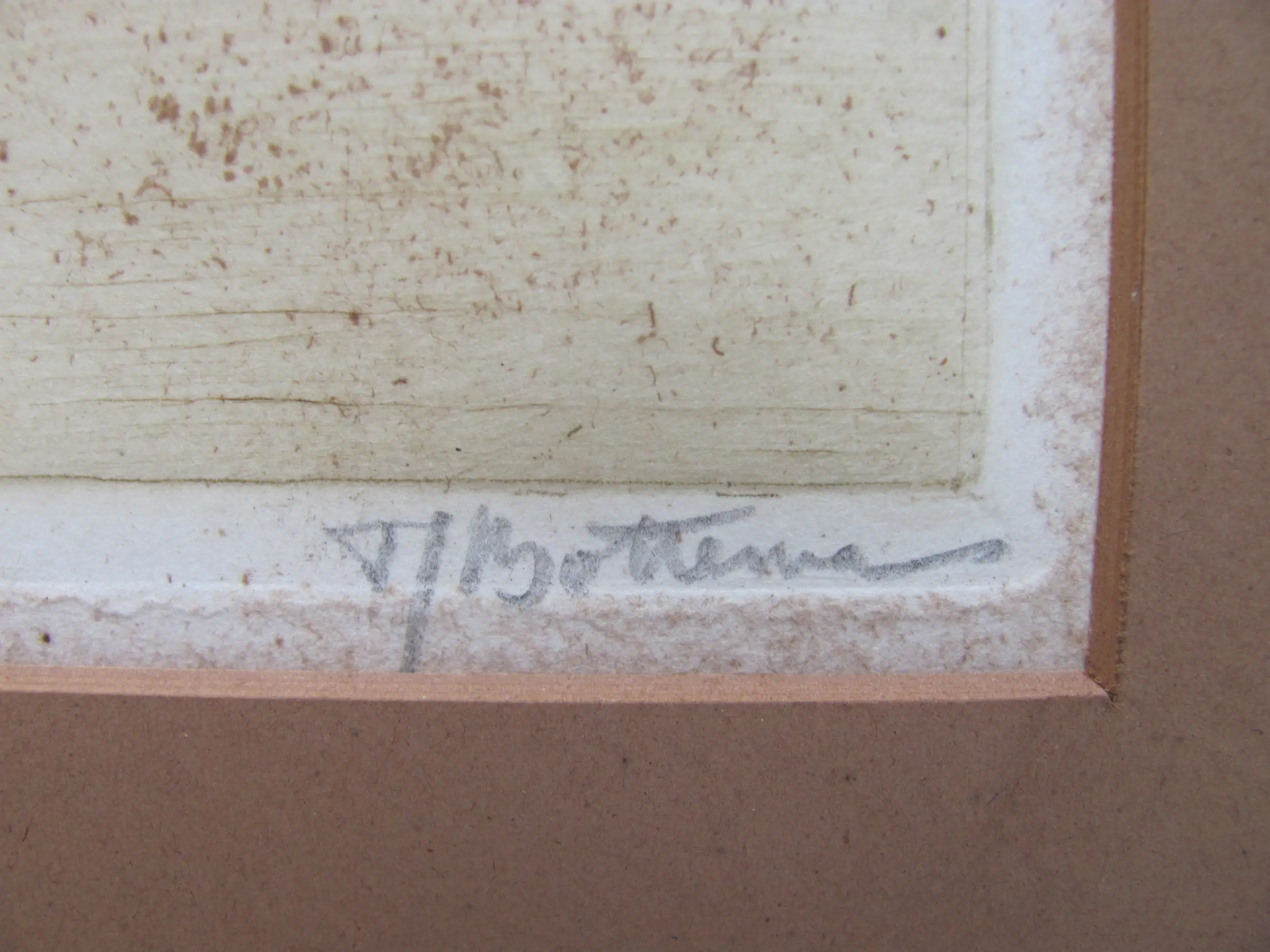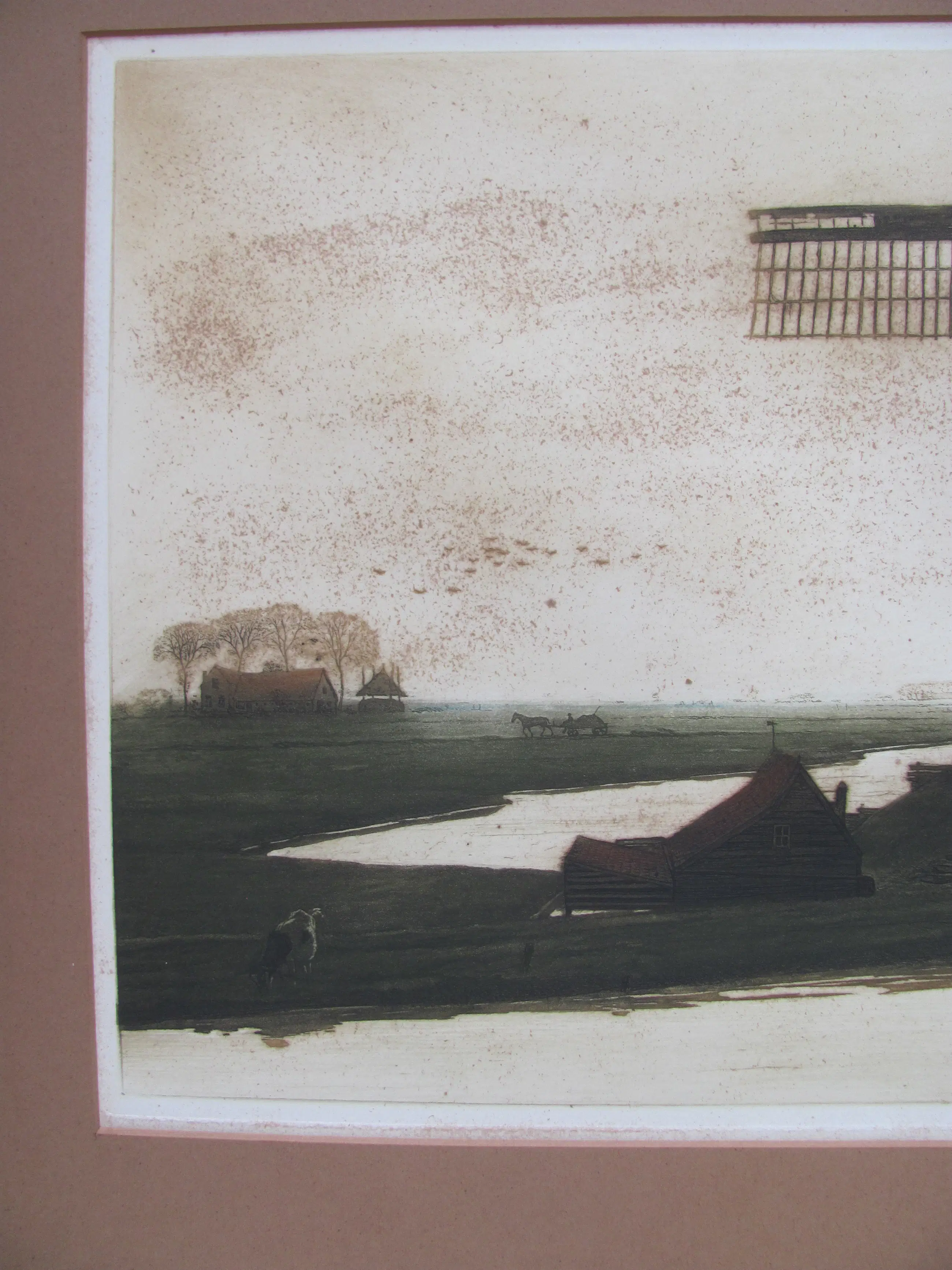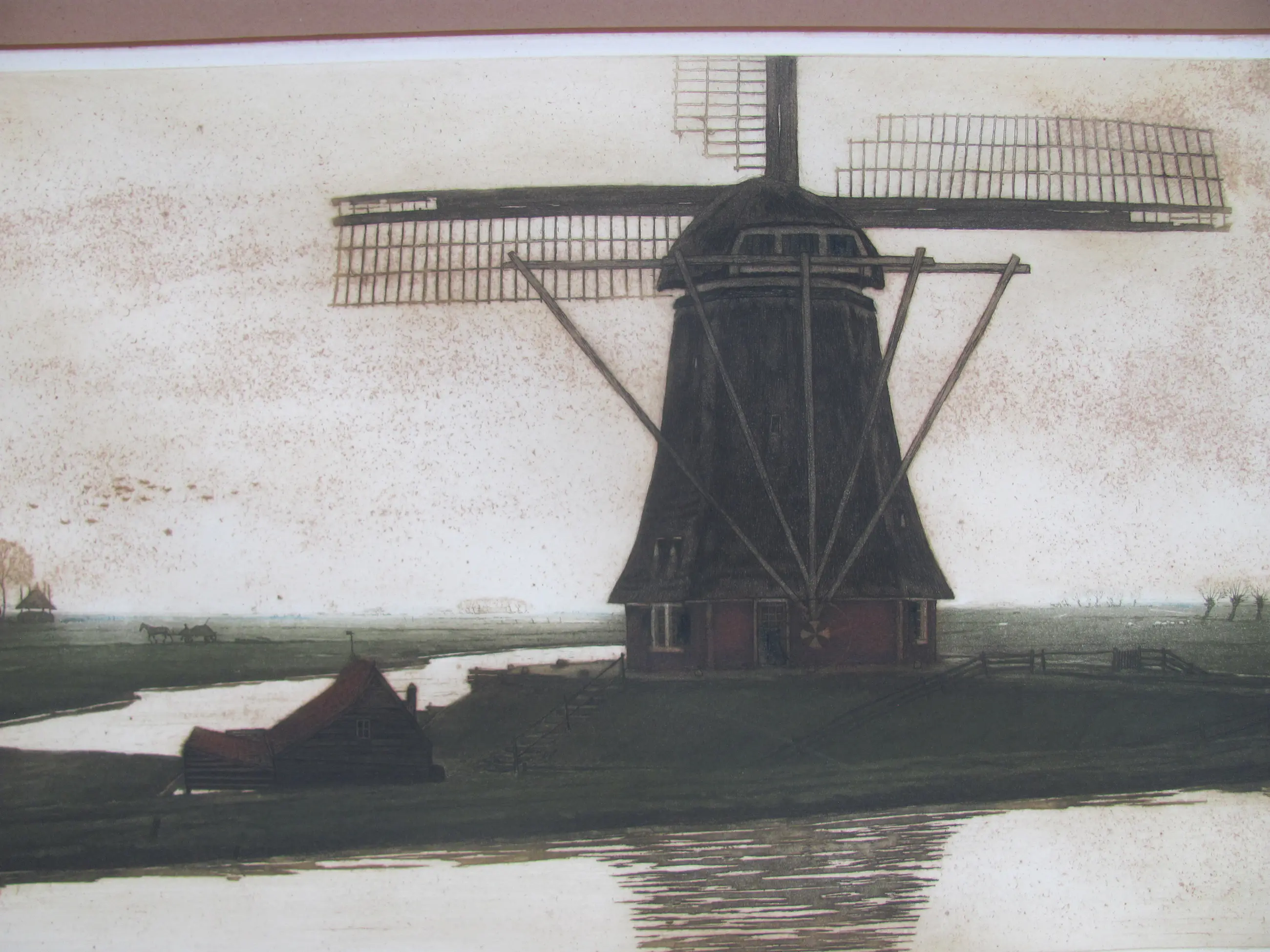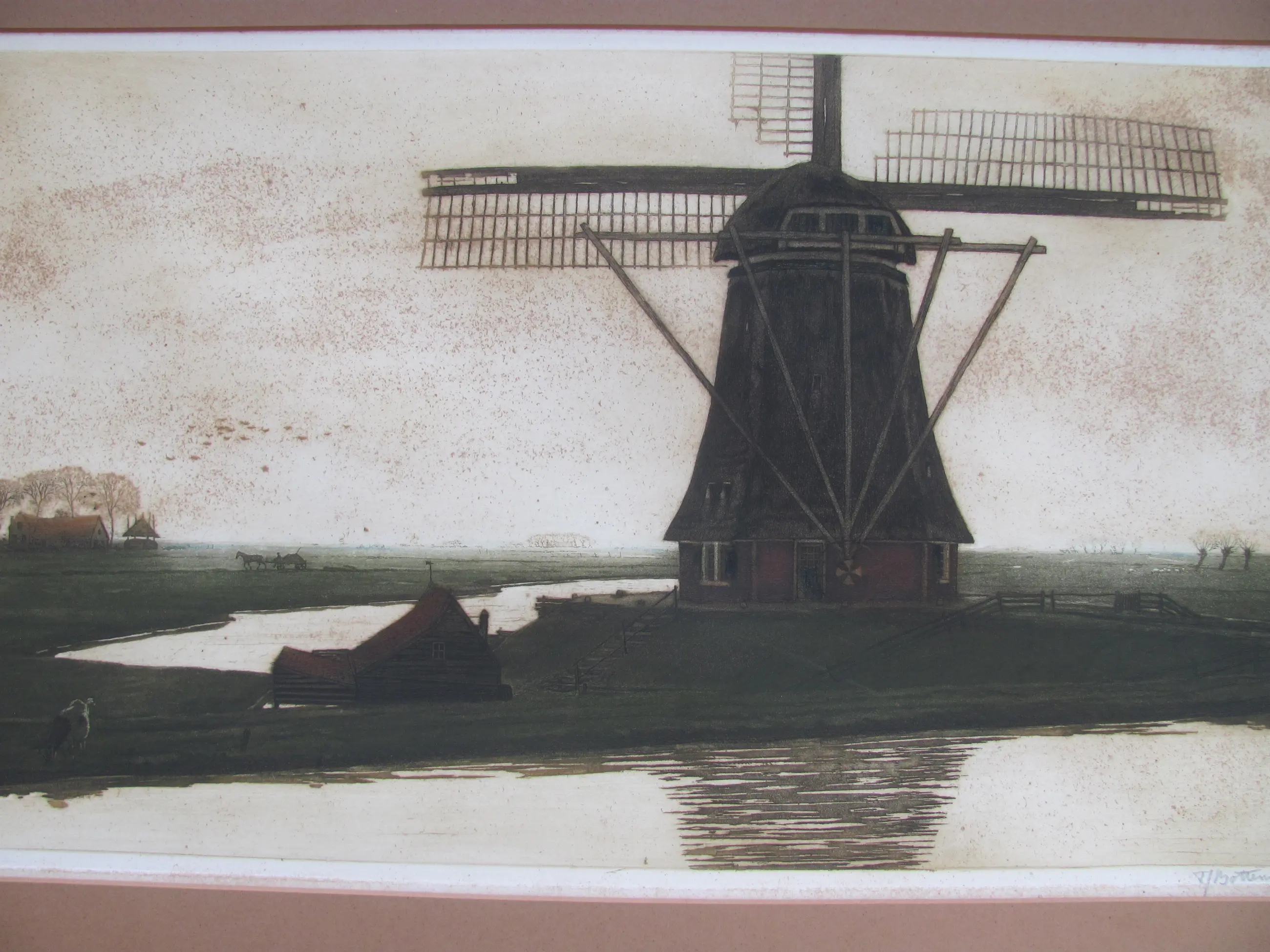 Ets van Tjeerd Bottema in de originele lijst en passe-partout. Afgebeeld is de molen in Watergraafsmeer.