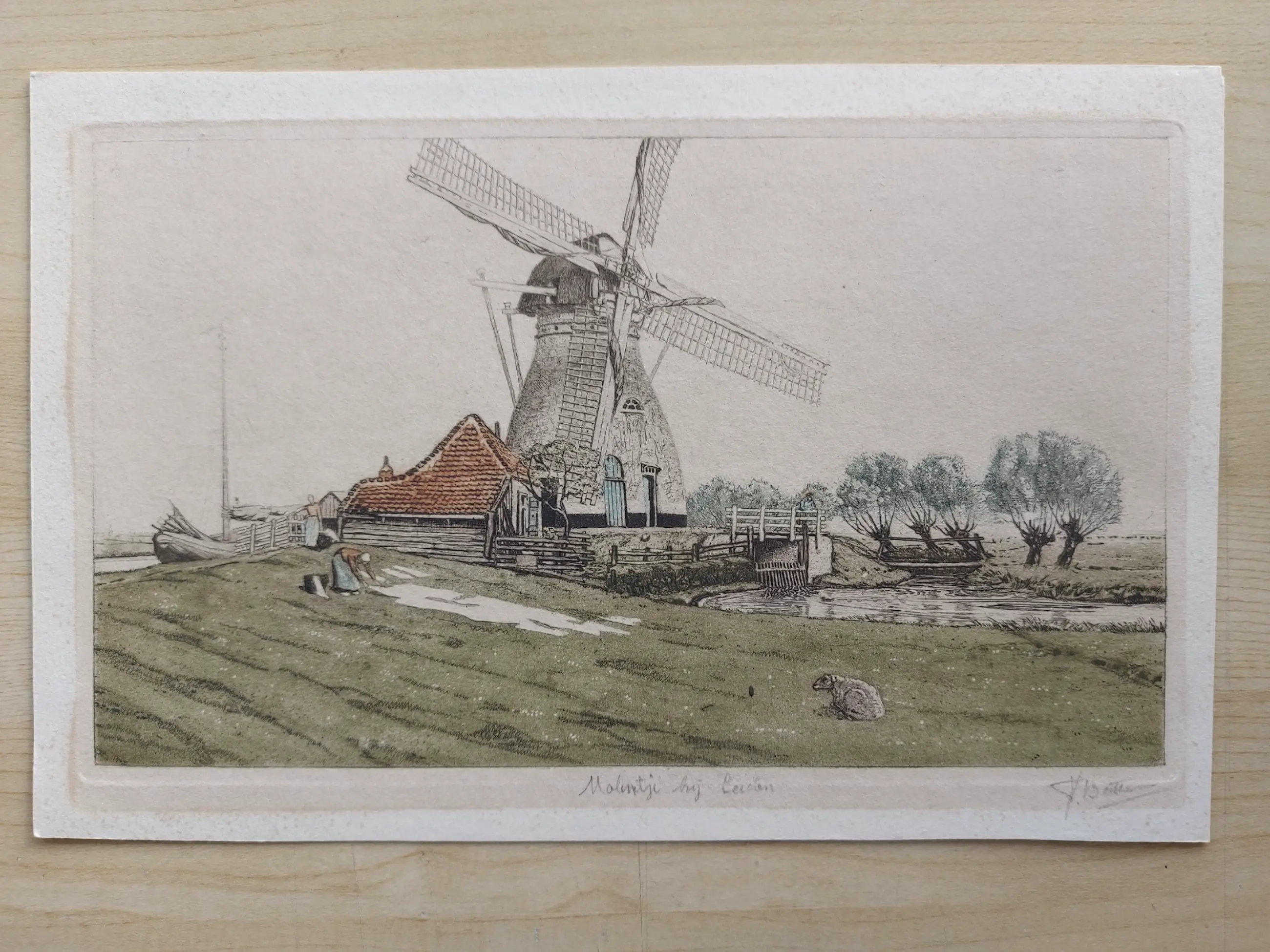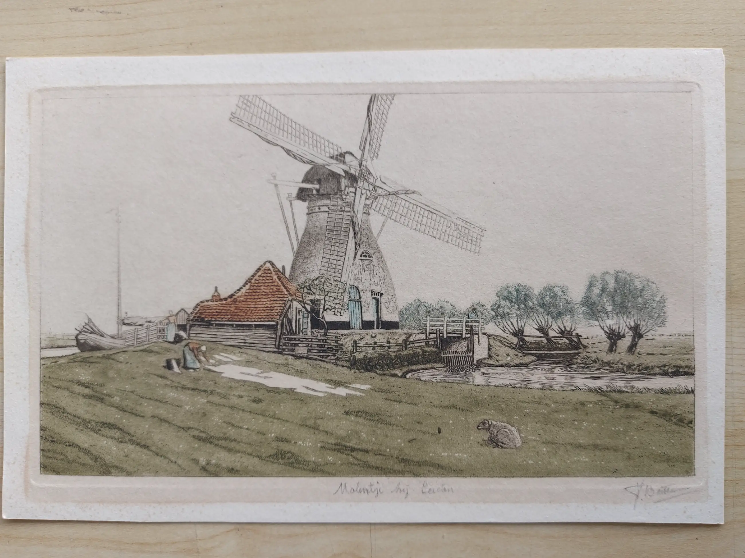 Gekleurde ets van Tjeerd Bottema.Molentje bij Leiden In goede staat.