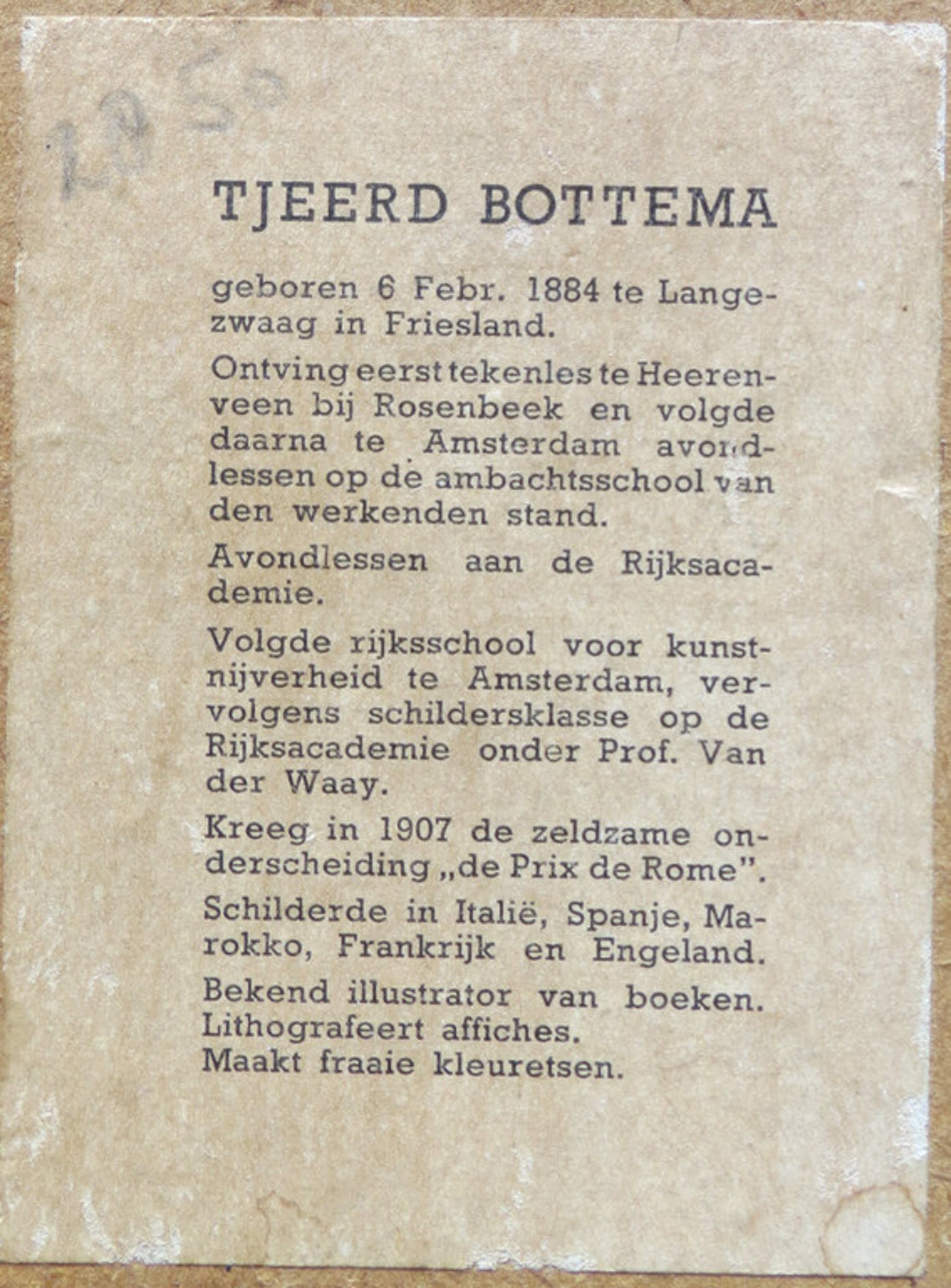 Hoewel het grote publiek de kunstschilder Tjeerd Bottema kent van zijn prachtige kleuretsen van verstilde landschappen met boerderijen en molens, heeft hij een enkele maal dezelfde thema’s uitgewerkt in olieverf. Door zijn opleiding bij August Allebé en Nicolaas van der Waay aan de Amsterdamse Rijksacademie beheerste hij de schildertechniek tot in de perfectie. Bijzonder is dat hij zijn geschilderde landschappen dezelfde mystieke sfeer weet mee te geven als zijn etsen. Het motief versoberde hij en de contouren liet hij vervagen. Bottema was aangesloten bij de Club van 10 te Laren en bij St. Lucas in Amsterdam.
