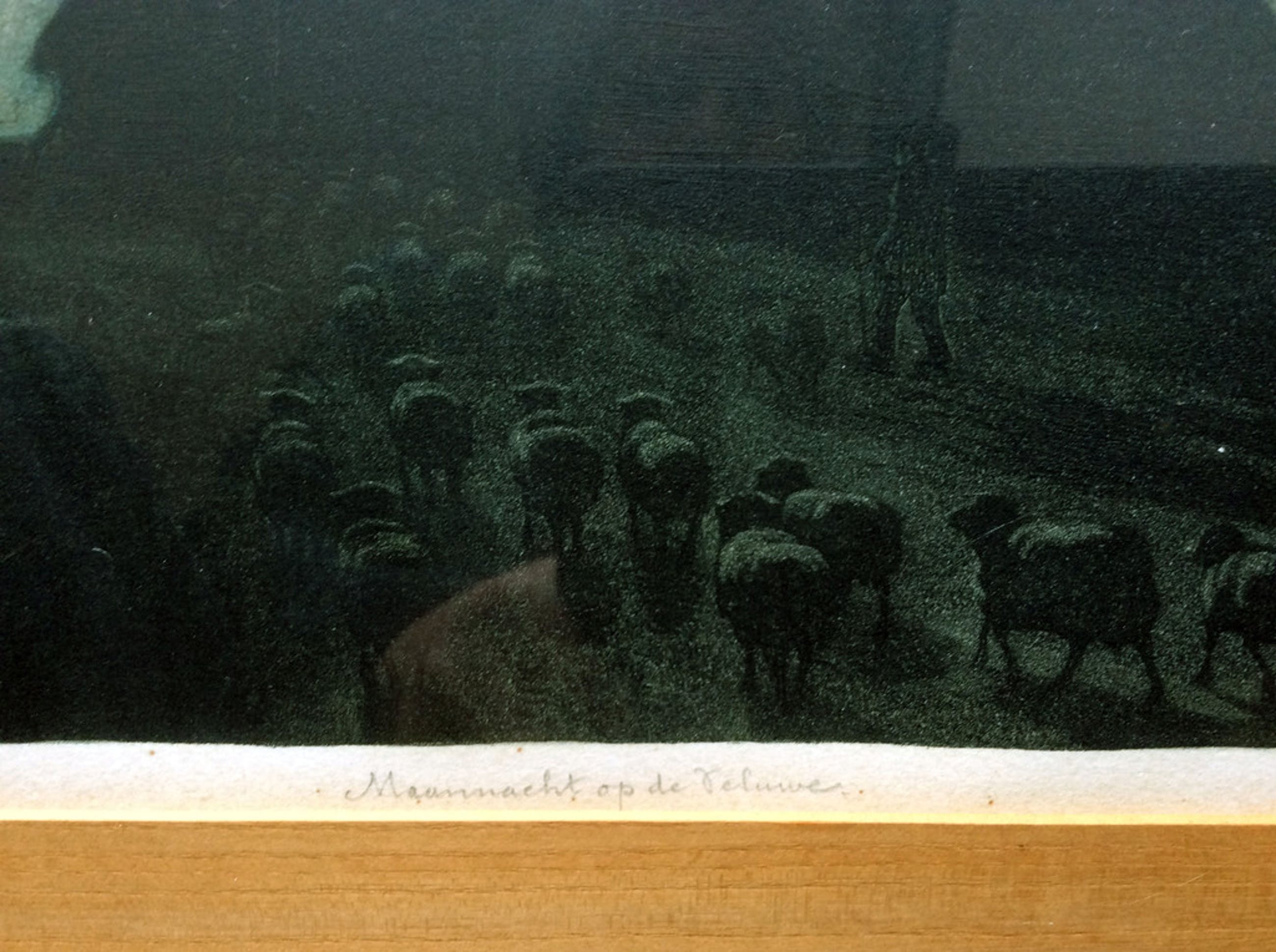 In stemmige originele houten lijst alsook houten passepartout gestoken fraaie kleurenets/aquatint van Tjeerd Bottema. Gesigneerd en getiteld onderin met potlood: Maannacht op de Veluwe. Oplage onbekend. Formaat ets 32 x 23 cm. Afmetingen incl. lijst 54 x 45 x 5 cm. Minimale randschade aan de houten lijst. (oneffenheden komen door spiegelingen bij fotograferen)