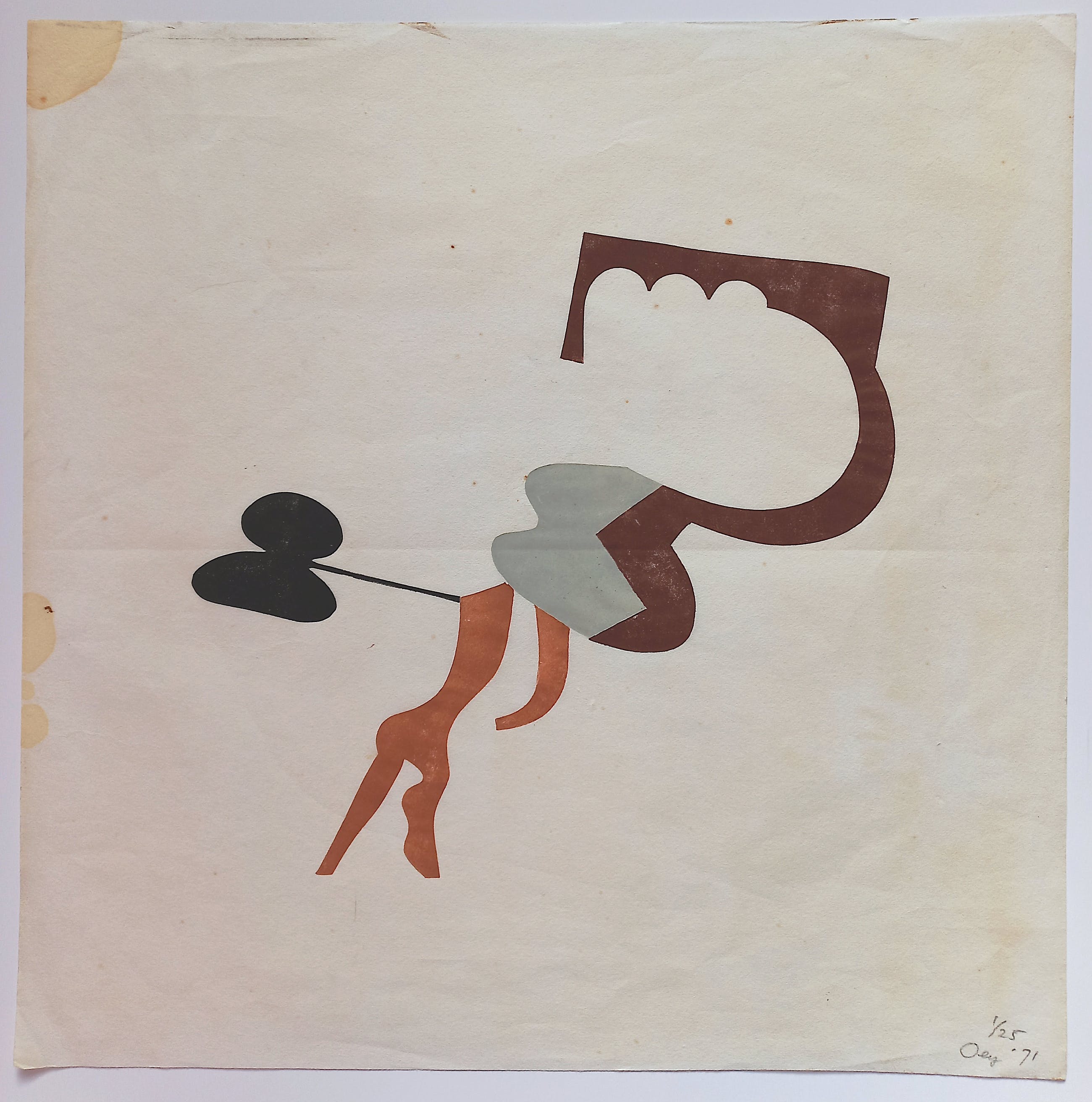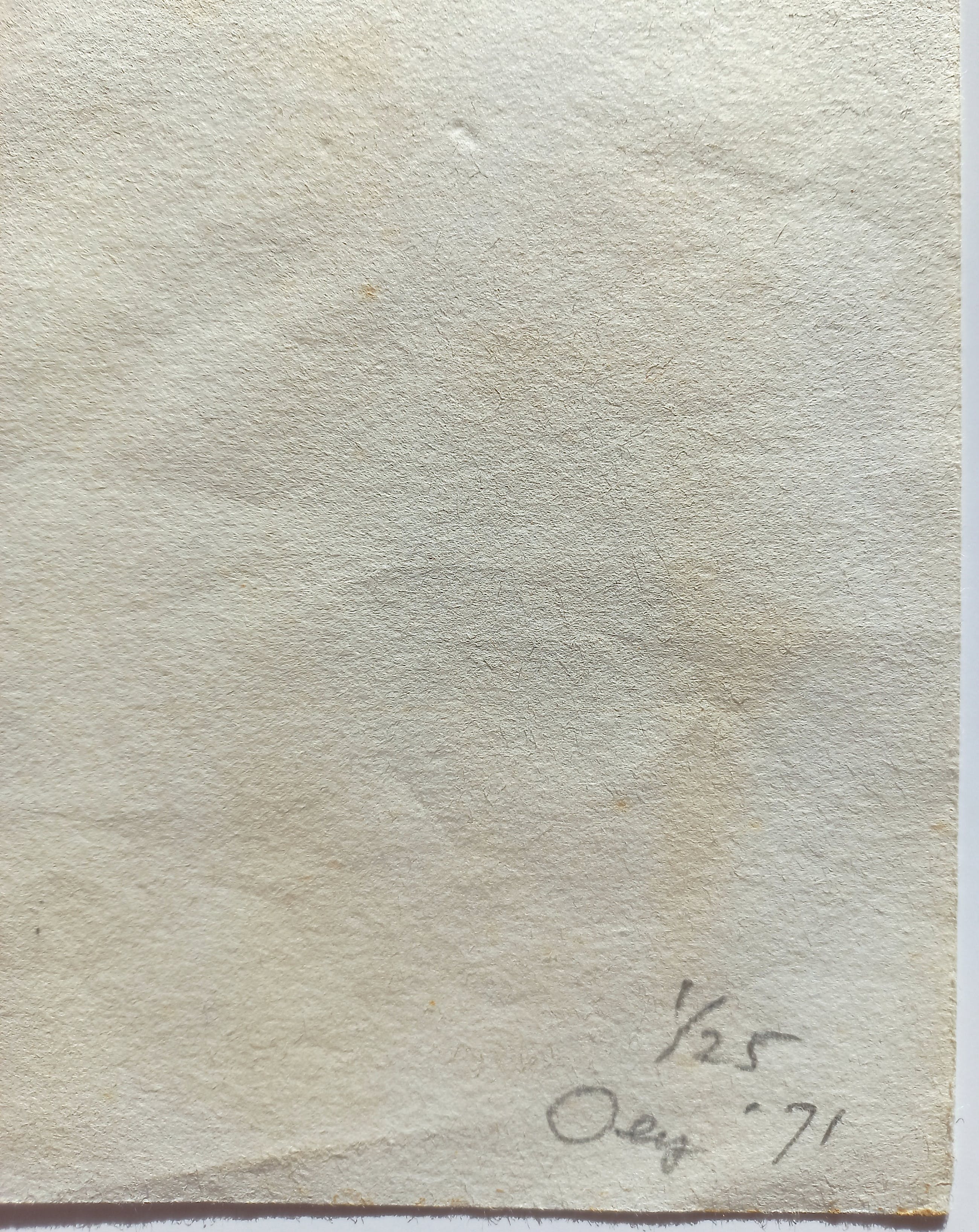 Karakteristiek, strak werk van Tjeng Sit Oey, uit een kleine oplage. Linosnede op japans papier, met potlood gesigneerd, gedateerd (‘71) en genummerd (1/25). In redelijke conditie. In het echt ziet de linosnede er beter uit dan op de, in strijkzonlicht genomen, foto's lijkt.