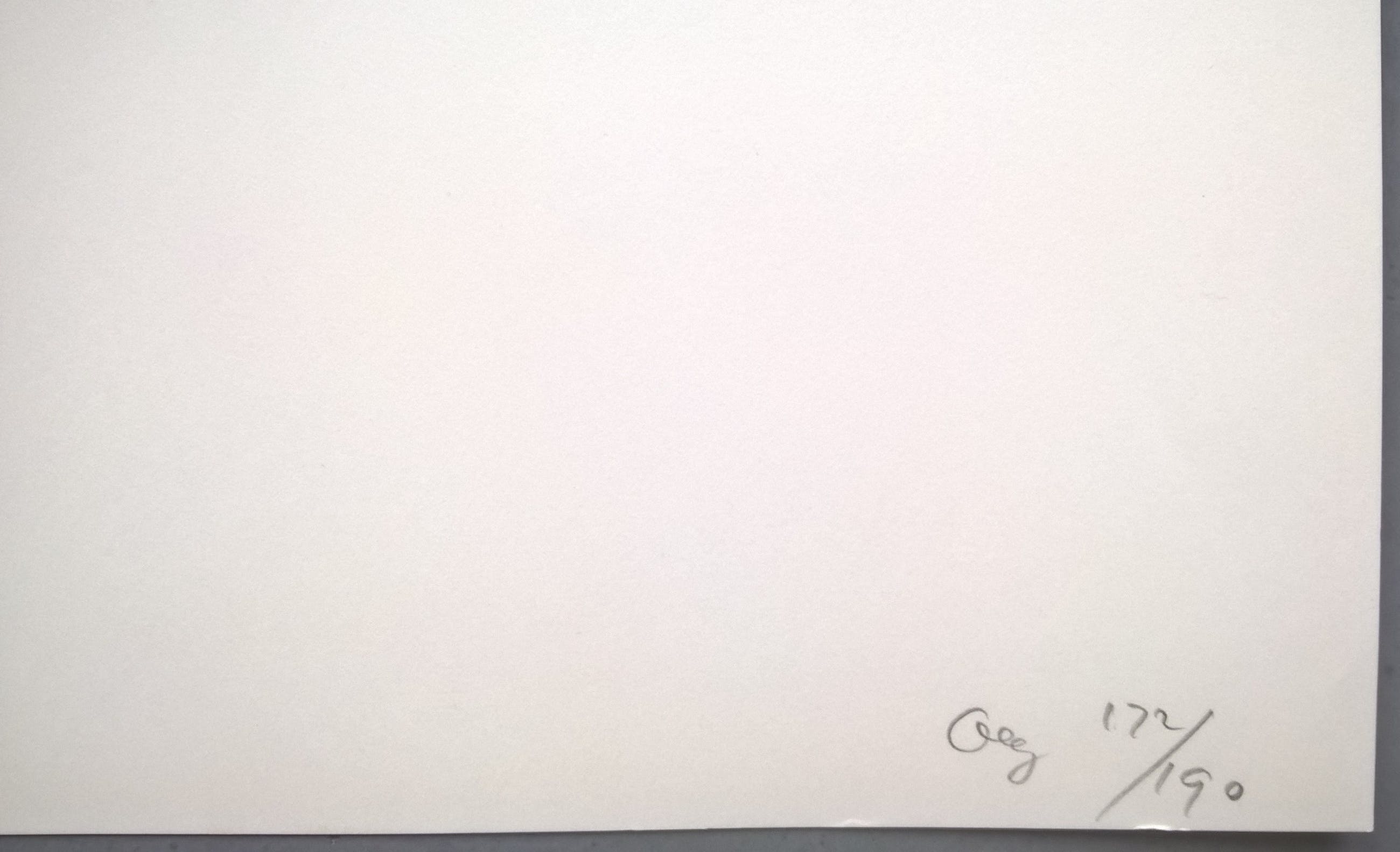 Rechtsonder is het werk gesigneerd in potlood en 172/190. Papiermaat 50 x 65 cm (hxb). De zeefdruk is in goede conditie en is nooit ingelijst geweest.