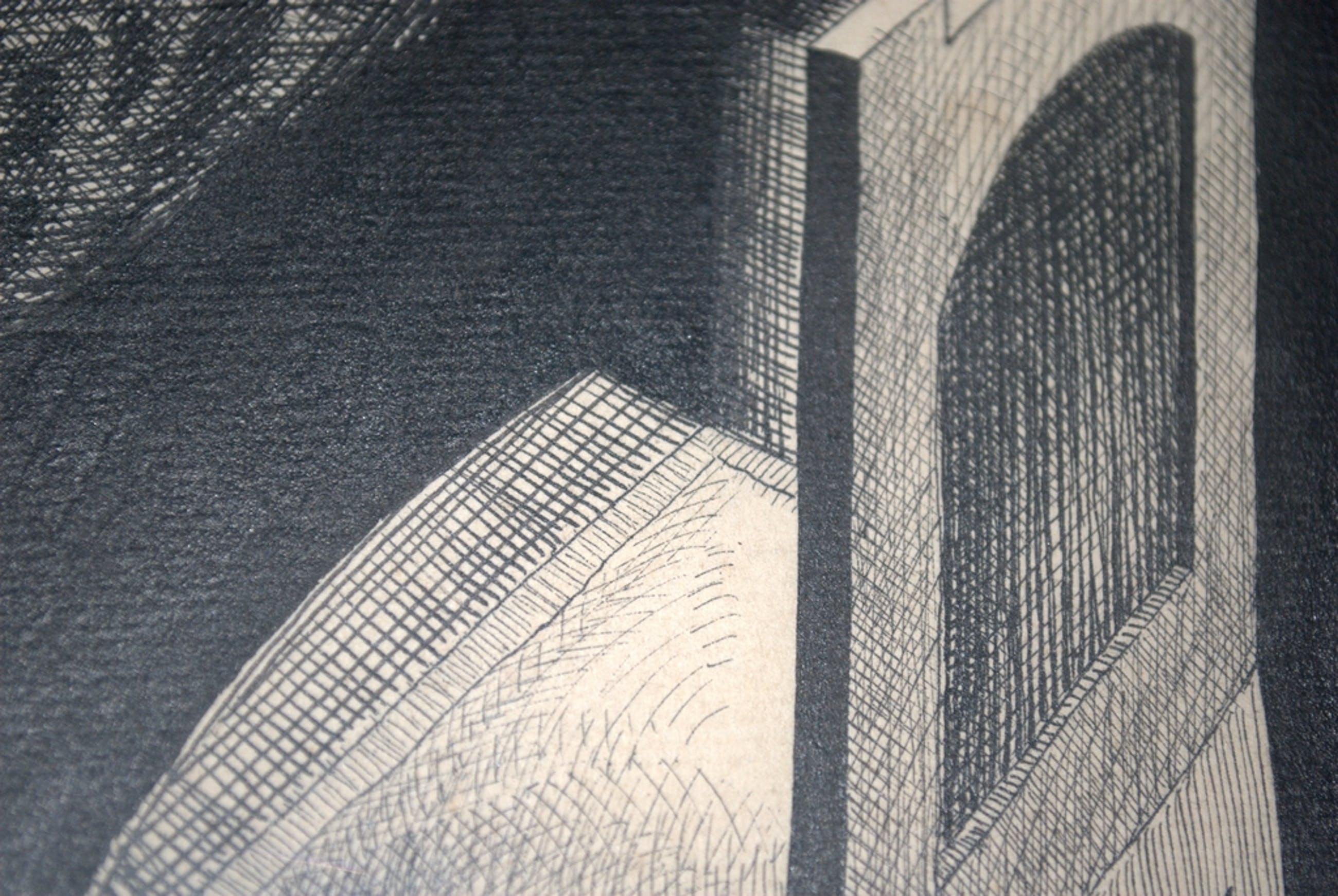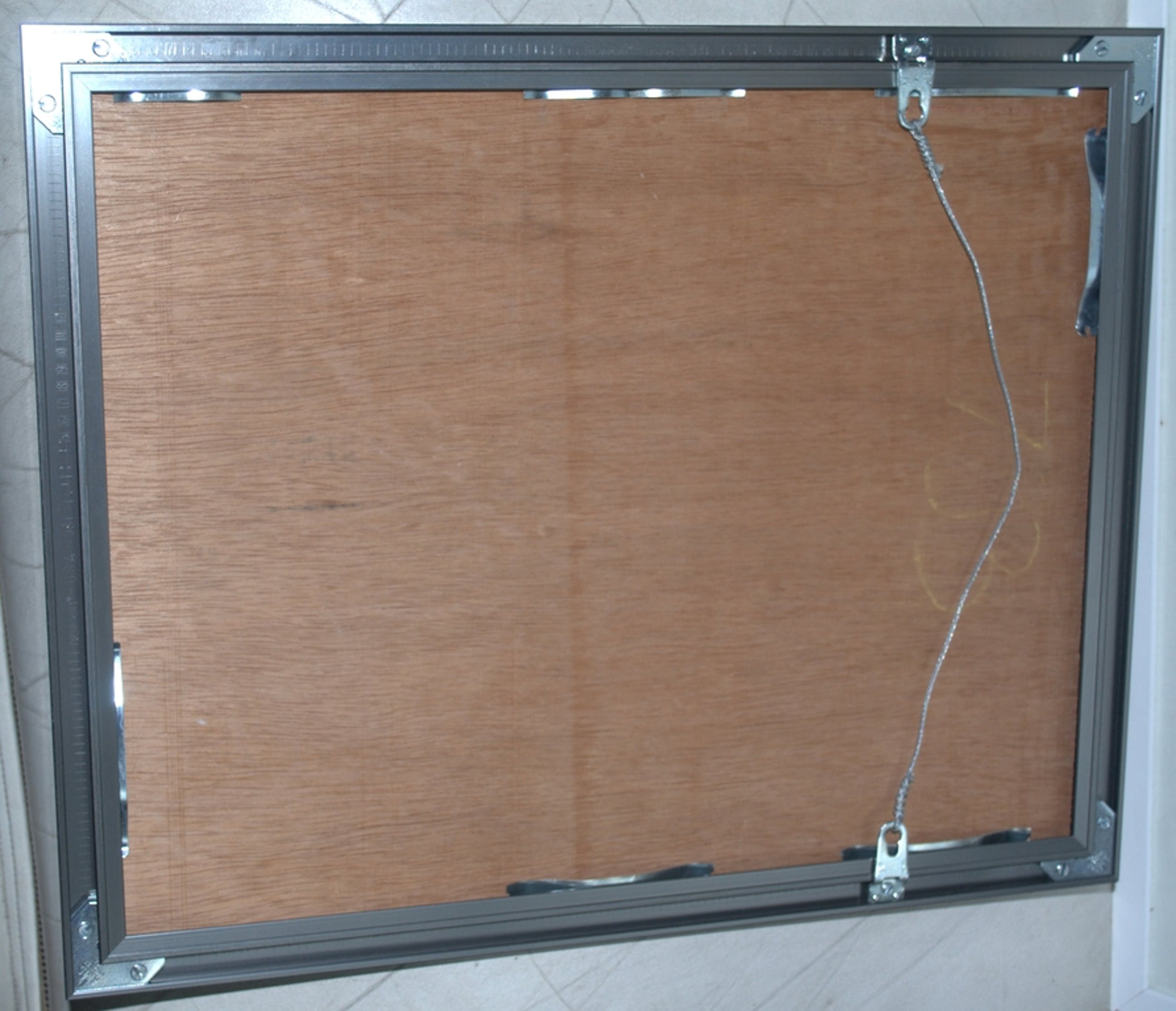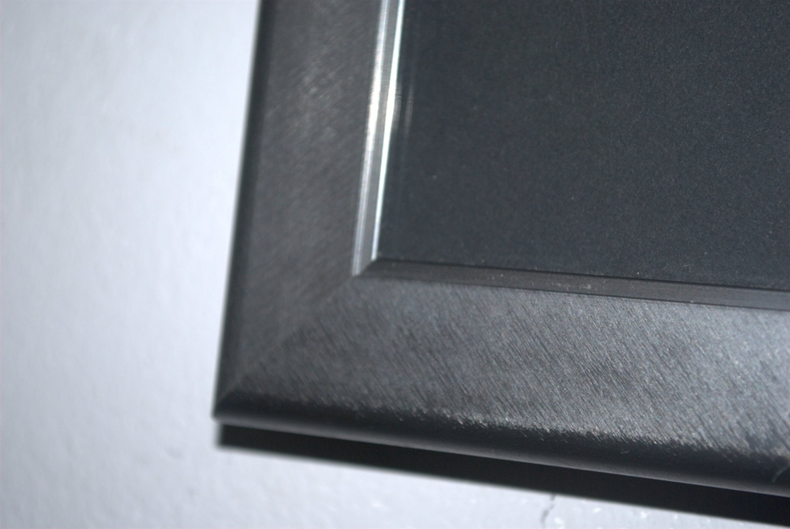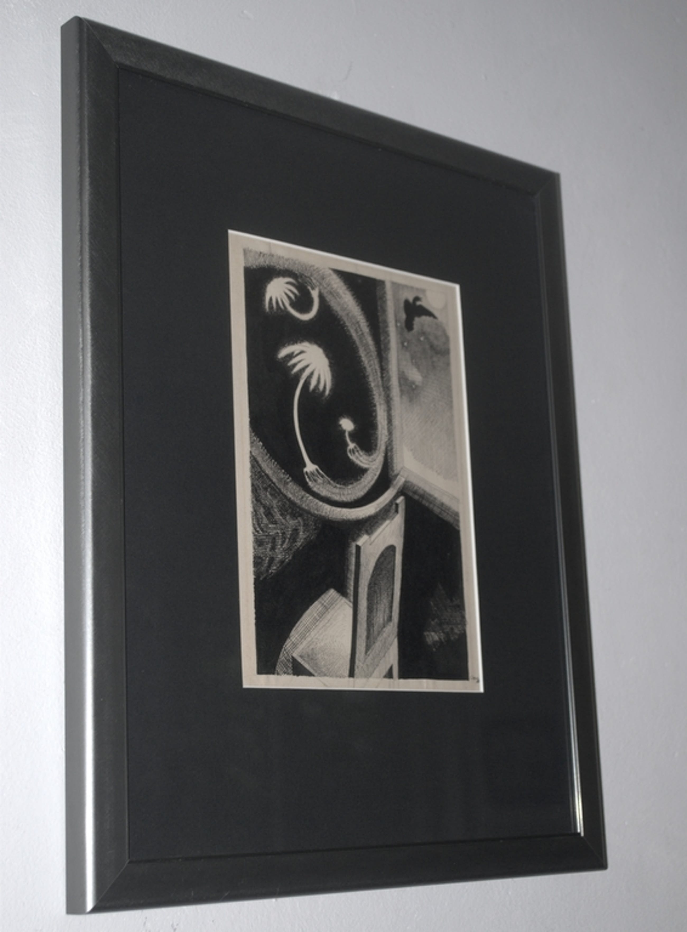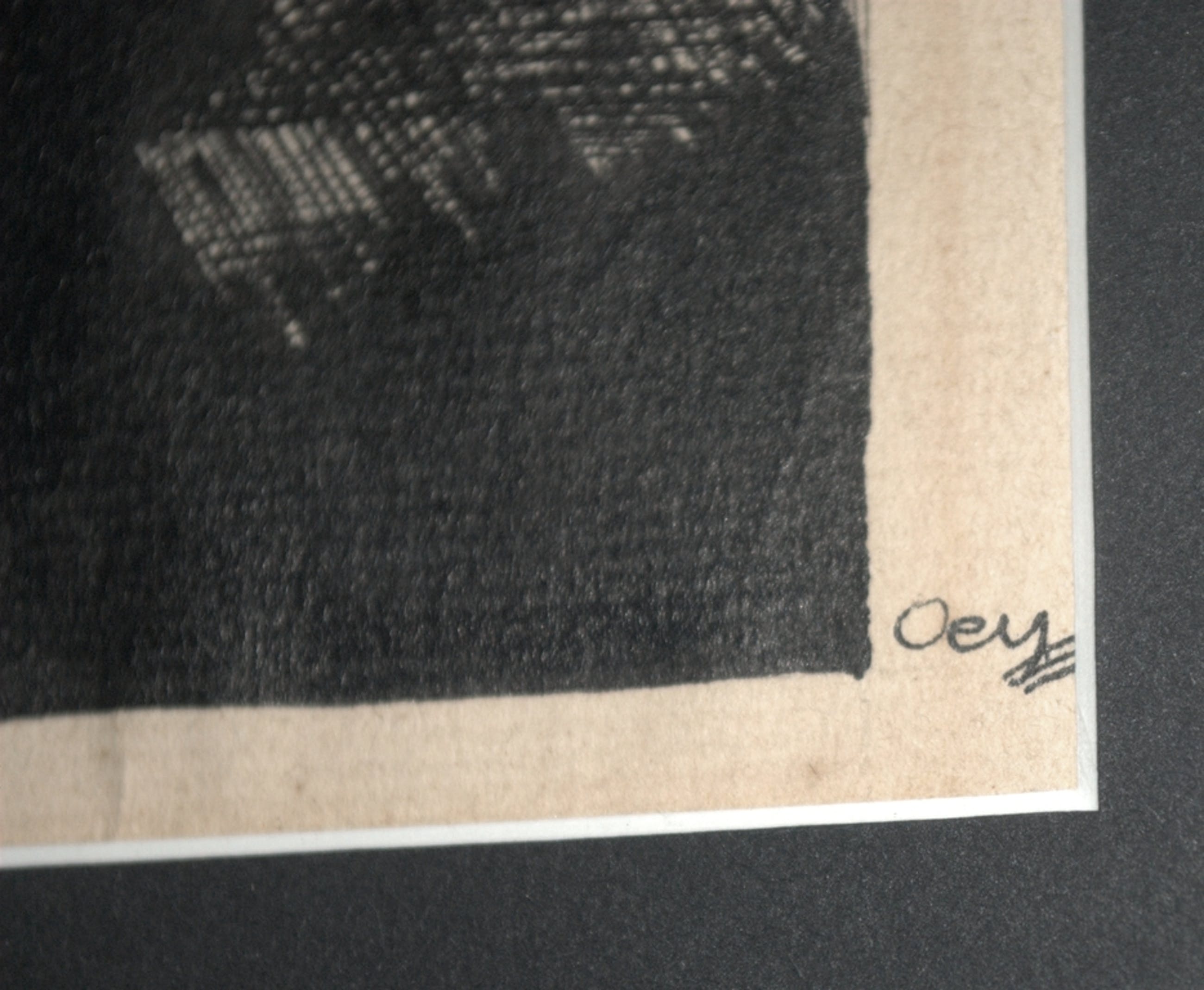 Achter passepartout en glas, in een Nielsen kwaliteitslijst van geborsteld alu, 43 x 35 cm. Gewicht 2 kg.