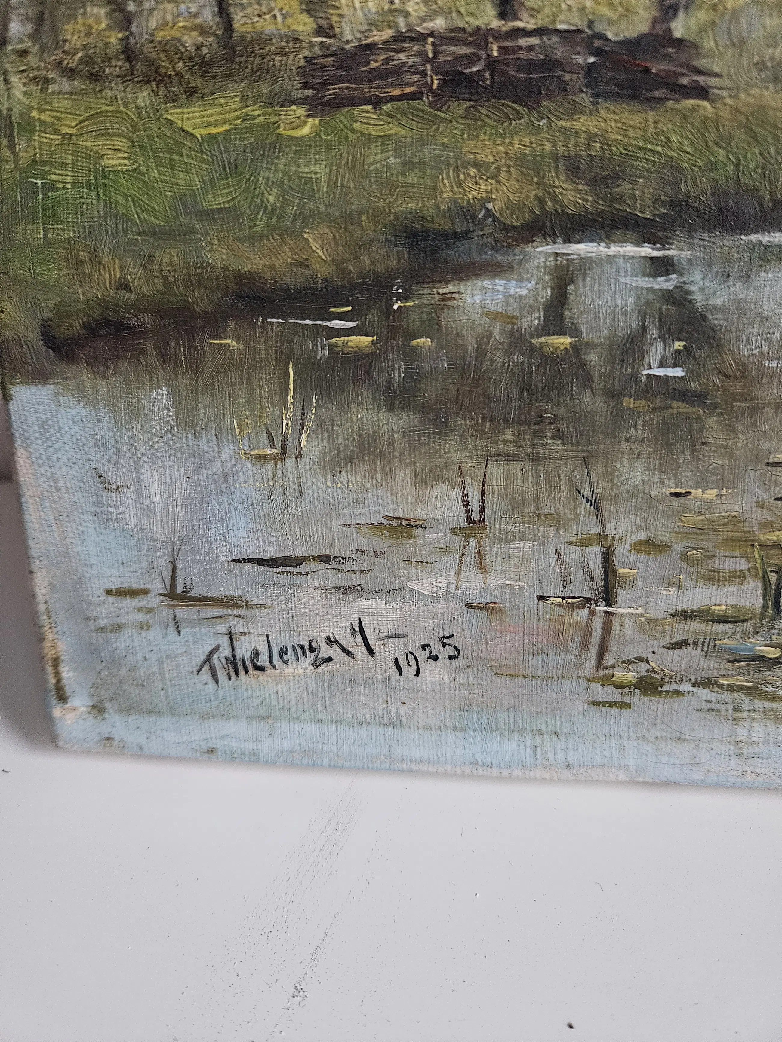 Uit erfenis: fleurig olieverf schilderij, landschap. Wel krakalee aanwezig en rechtsboven een dunne plek/beschadiging. Zie foto.