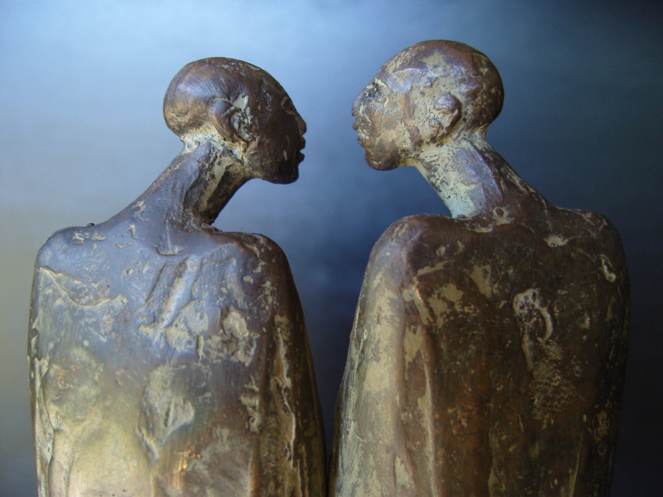 Zeer fraai bronzen beeld van twee converserende personen. Gesigneerd T K en gedateerd. Hoogte van het beeldje inclusief de sokkel ca. 26 cm. Sokkel is h 3 x b 8 x d 4 cm. Gewicht ca. 1,7 kg. Beelden van Tjikkie zijn zeer gewild en geliefd.